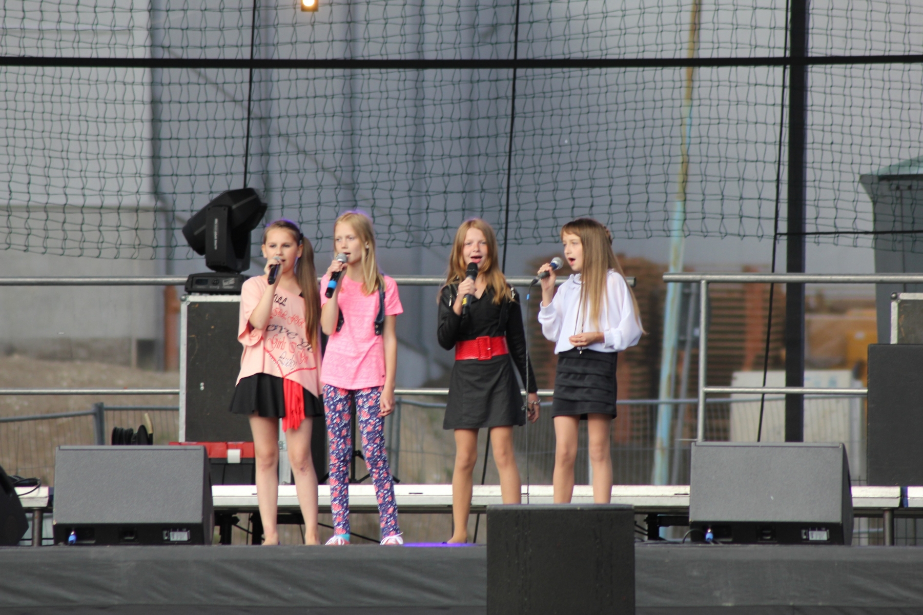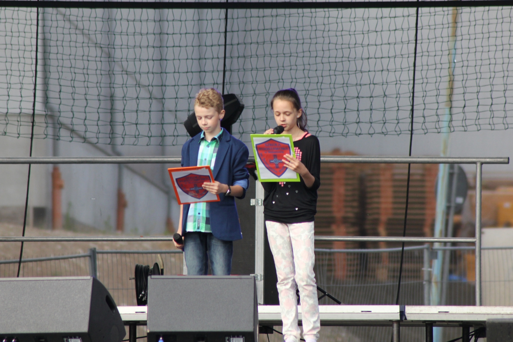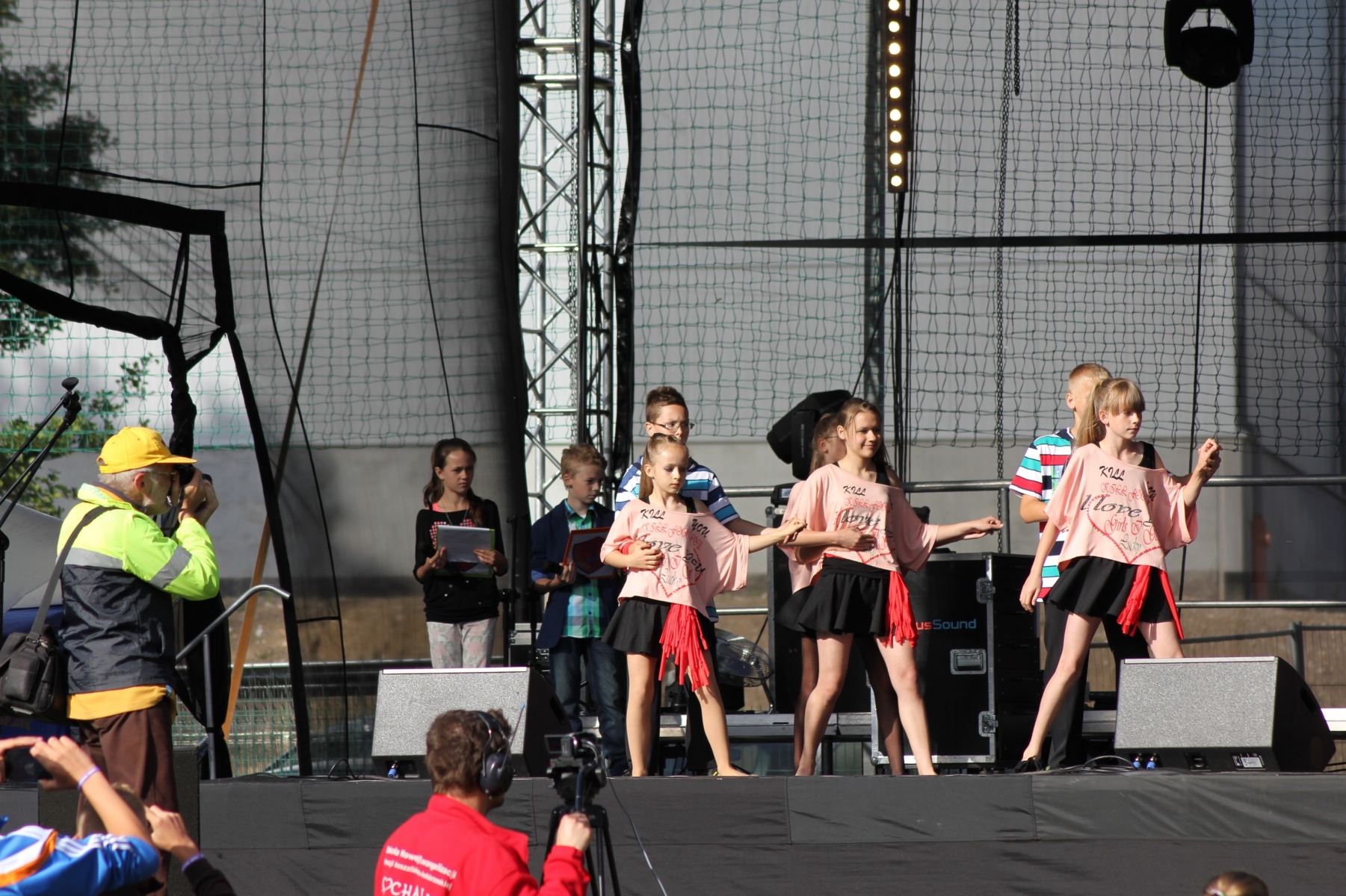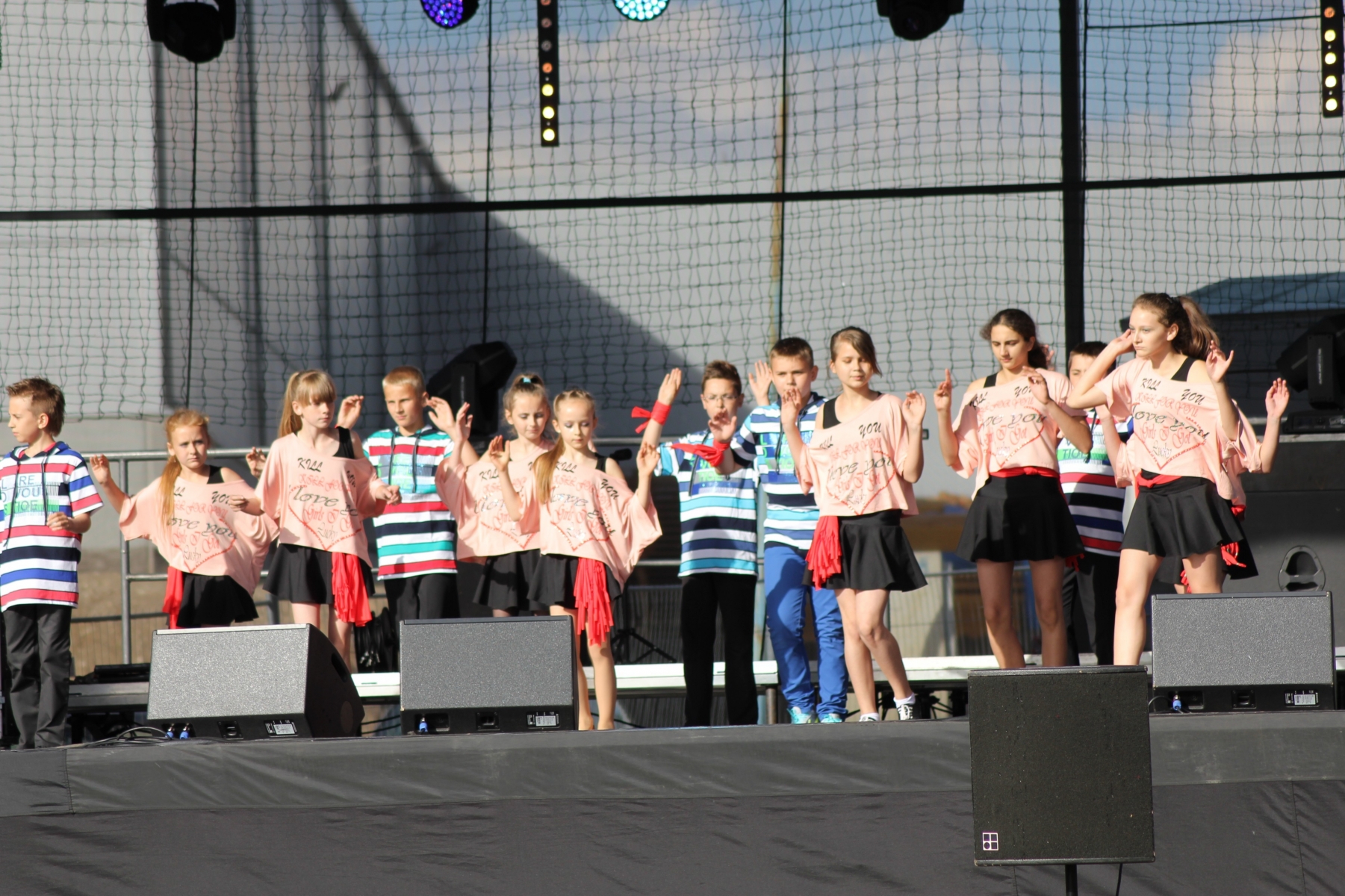Deszczowe chmury nagromadzone nad sceną ustąpiły miejsca słoneczku, które wyłoniło się, kiedy na scenę wkroczyli młodzi śpiewacy. Kwartet złożony z uczennic klasy czwartej zaśpiewał piosenkę pt.” Żyj do przodu”, najmłodsza uczestniczka naszego występu Maja Grzelka po gwiazdorsku wykonała piosenkę pt. „Śpiewam i tańczę”, nie zabrakło także naszych chłopców z klasy szóstej Jakuba Białasa i Filipa Walczaka, którzy podobnie, jak pozostali śpiewacy zostali przygotowani do występu przez p. Katarzynę Tomczyk.