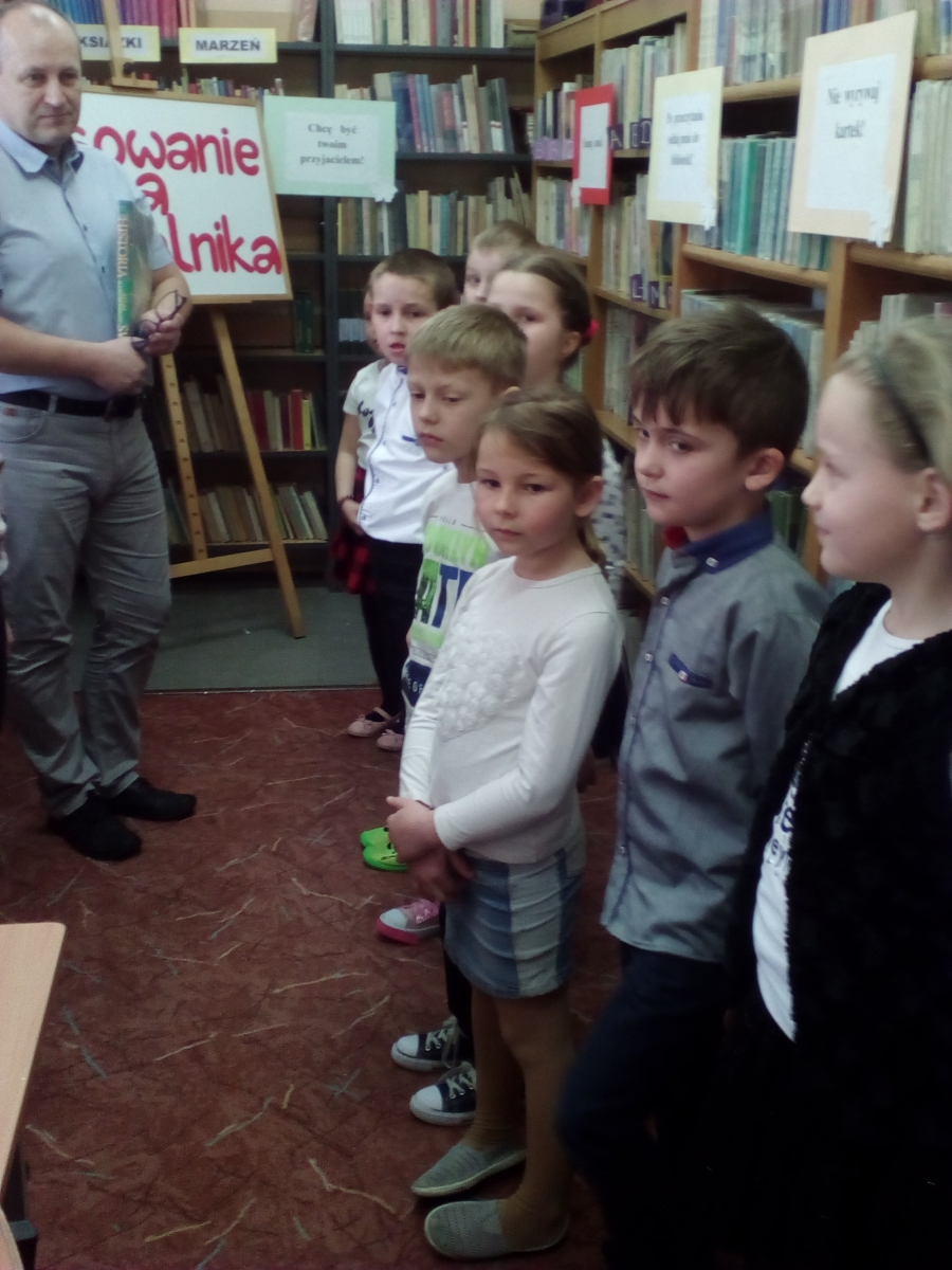 Najważniejszym jednak momentem uroczystości było złożenie przez uczniów przyrzeczenia. Aktu pasowania dokonał pan dyrektor Marek Nowicki. Następnie dzieci otrzymały pamiątkowe odznaki „ Przyjaciel książki” oraz słodkie upominki.