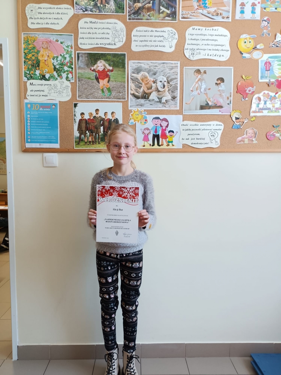 Ze Świętami Bożego Narodzenia związanych jest wiele tradycji. Jedną z nich jest wysyłanie kartek świątecznych. Najpiękniejsze kartki świąteczne to te, które powstają w naszych domach. I właśnie takie kartki związane z tematyką religijną, symboliką lub obrzędami i tradycjami oddającymi atmosferę towarzyszącą Bożemu Narodzeniu w Polsce, wykonane własnoręcznie, przez wielu uczniów naszej szkoły zostały przesłane na konkurs plastyczny pt.: „Najpiękniejsza kartka bożonarodzeniowa”, zorganizowany przez Biuro Senatorskie Senator RP Margarety Budner. Na uroczyste podsumowanie tego konkursu, które odbyło się 17 grudnia 2022r. w Koninie została zaproszona uczennica klasy IIIb - Alicja But. Spośród wszystkich prac z naszej szkoły to praca Ali została wyróżniona przez komisję konkursową. Alicja otrzymała wyróżnienie i symboliczne upominki. Przywiozła ze sobą dyplomy podziękowania za udział w konkursie dla Szkoły Podstawowej w Malanowie, wszystkich uczestników oraz ich opiekunów.