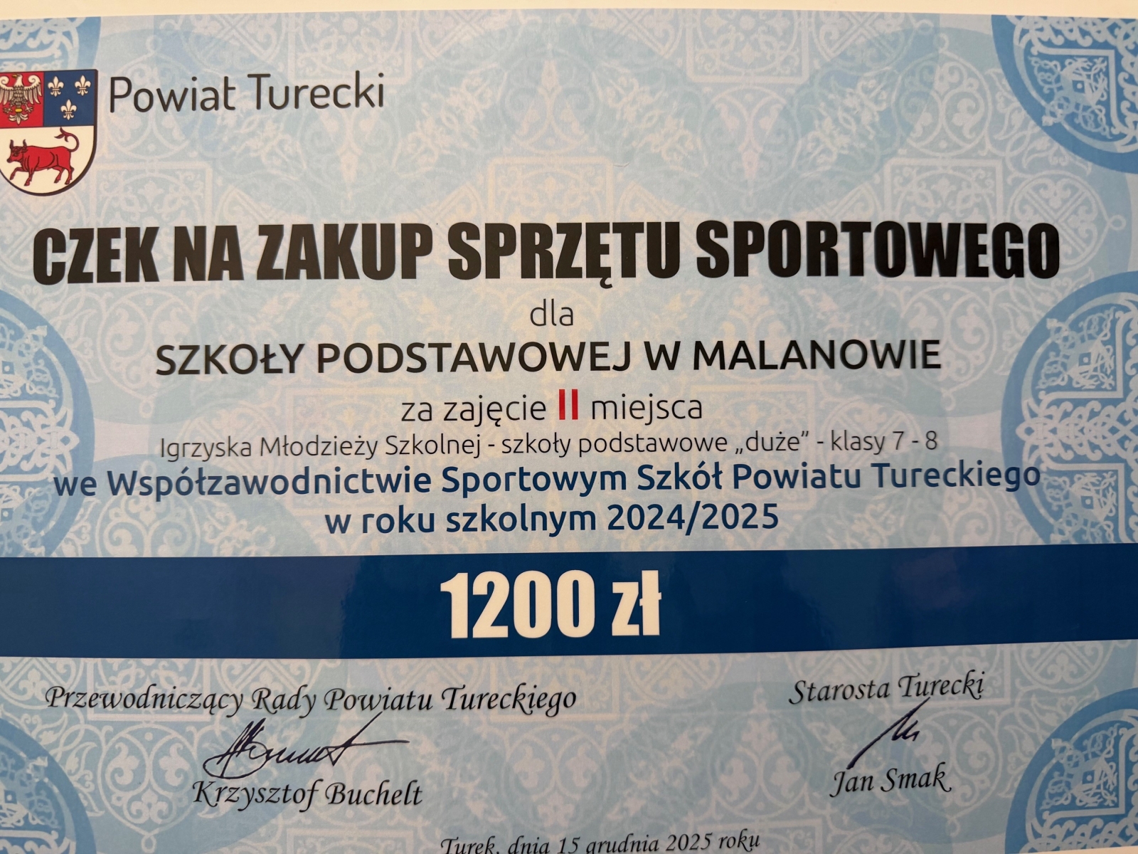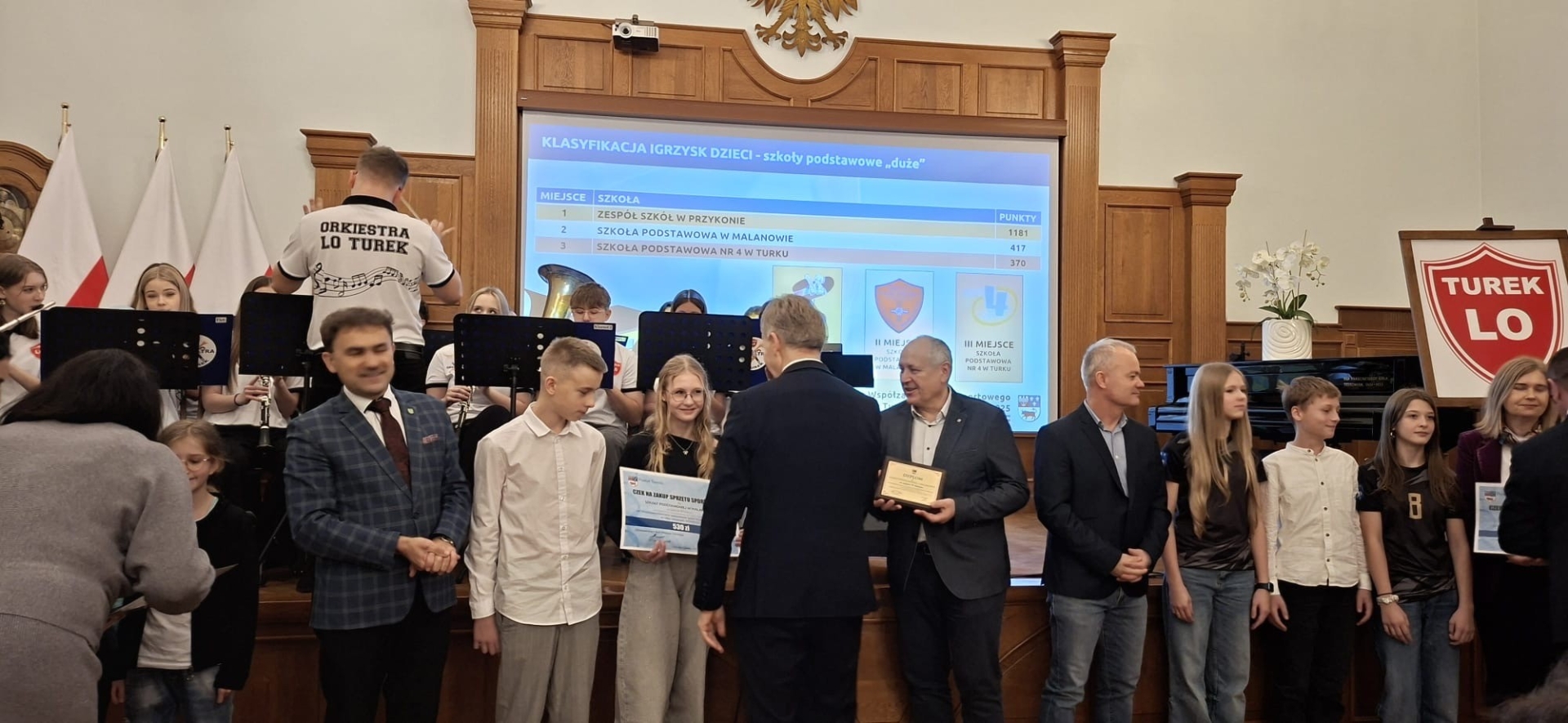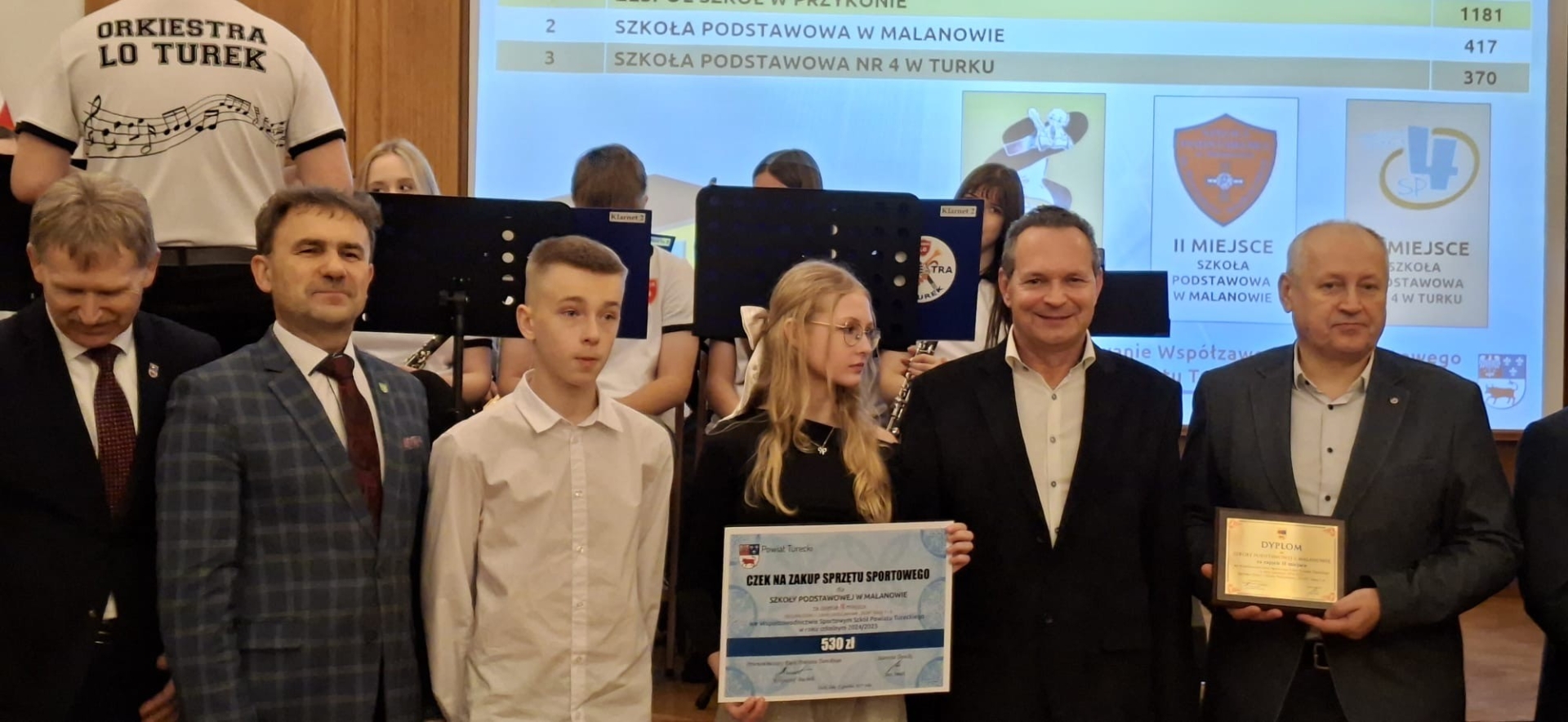 W dniu 15 grudnia w auli LO Turek odbyło się podsumowanie roku sportowego szkół powiatu Tureckiego. Uczestniczyło wielu gości. Naszą szkołę reprezentowali uczniowie z kategorii Dzieci Alicja But oraz Kacper Erkiet i kategorii młodzież Karolina Lament opiekunami byli Pan Radosław Zwoliński i Arkadiusz Musiałkiewicz, towarzyszył nam Pan Dyrektor Marek Nowicki. Nasza Szkoła zdobyła w dwóch kategoriach drogie miejsce w podsumowaniu sportowym. Uzyskaliśmy kwotę ponad 1730 zł, którą przeznaczymy na zakup sprzętu sportowego.