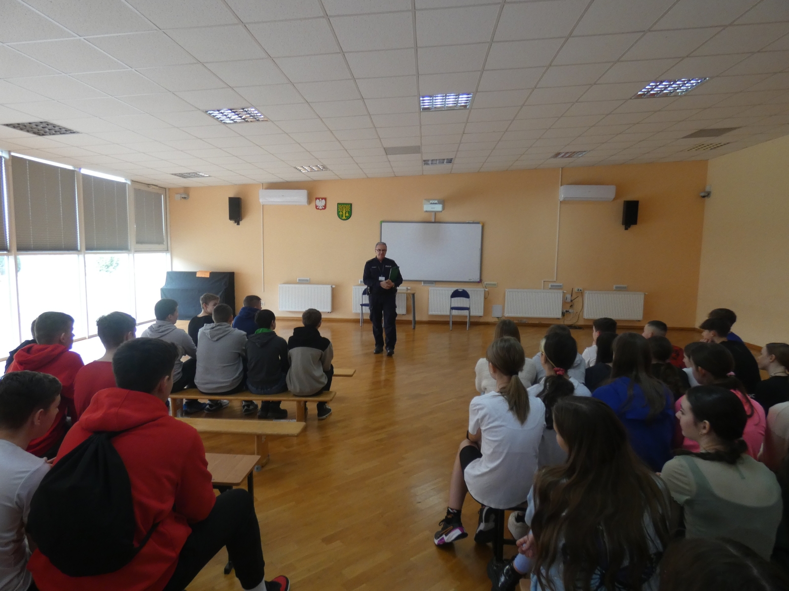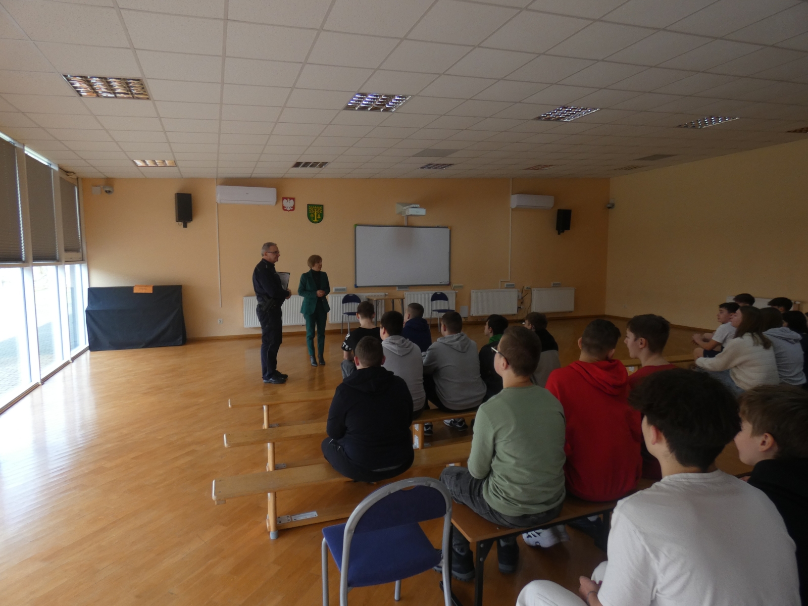 W piątek 2 lutego 2024 r. w naszej szkole odbyło się spotkanie uczniów klas VII – VIII z przedstawicielem policji – asp. sztab. Krzysztofem Aleksanderkiem. Tematem wiodącym było bezpieczeństwo dzieci i młodzieży. Dzielnicowy przypomniał zasady prawidłowego poruszania się w ruchu drogowym. W związku ze zbliżającymi się feriami zimowymi podkreślił, jak ważne jest zachowanie rozwagi podczas zabaw i aktywności na świeżym powietrzu (korzystanie z zamarzniętych zbiorników wodnych, kuligi itp.). Policjant dużo uwagi poświęcił zagrożeniom płynącym z sieci. Przedstawił też skutki, jakie może nieść ze sobą niewłaściwe korzystanie z internetu. W prelekcji pan dzielnicowy poruszył problem odpowiedzialności karnej nieletnich, konsekwencji prawnych między innymi za niszczenie mienia, kradzieże, przemoc fizyczną, psychiczną. Podczas spotkania uczestnicy usłyszeli wiele cennych wskazówek dotyczących właściwego, bezpiecznego zachowania się w różnych sytuacjach.