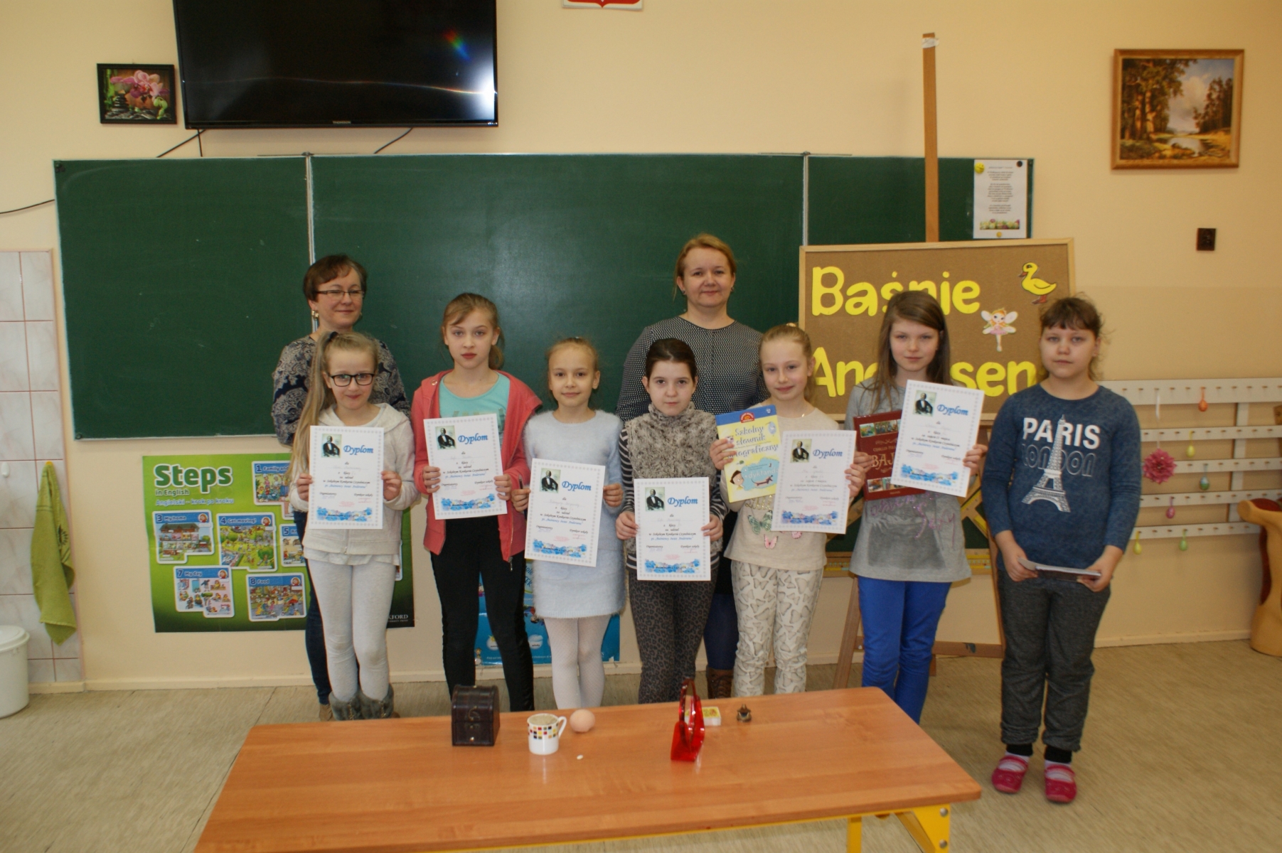 „ Dzikie łabędzie”, „Słowik” , „ Księżniczka na ziarnku grochu” , „ Latający kufer”. Kolejność uzyskanych miejsc zależna była od ilości zdobytych punktów. Pierwsze miejsce zajęła Maja Grzelka z klasy III b, drugie Wiktoria Flejter z klasy III a, natomiast trzecie Anna Bergandy z klasy III a,