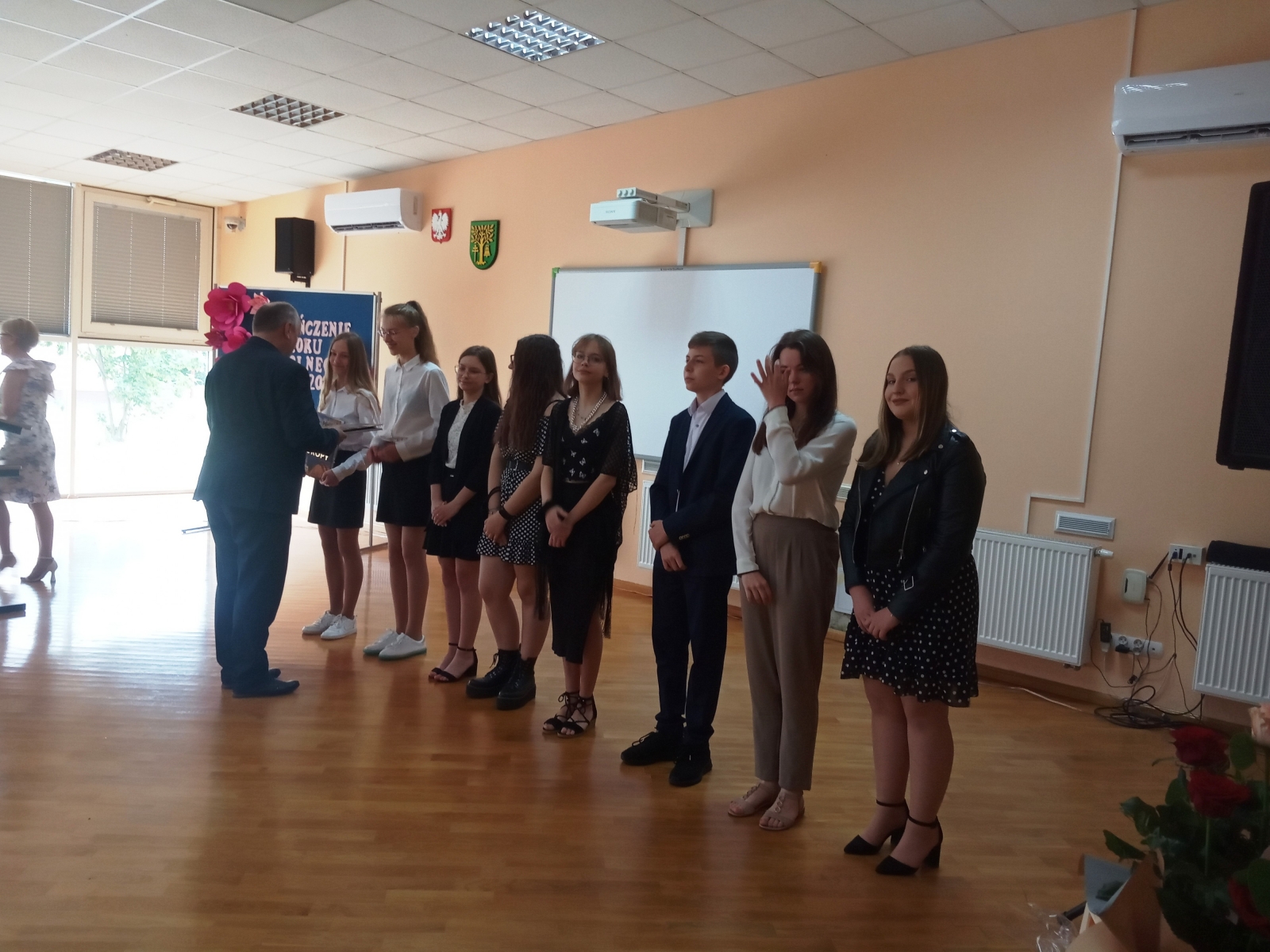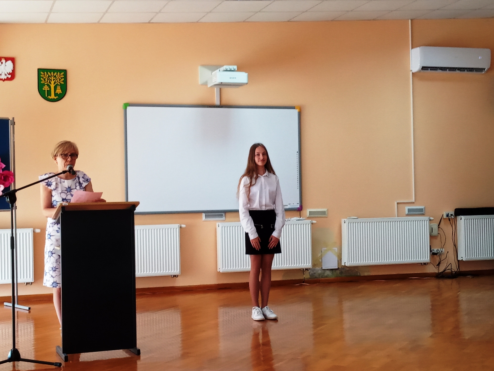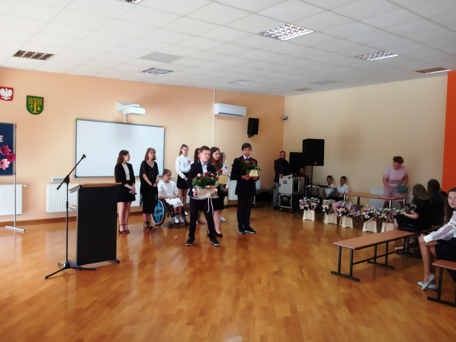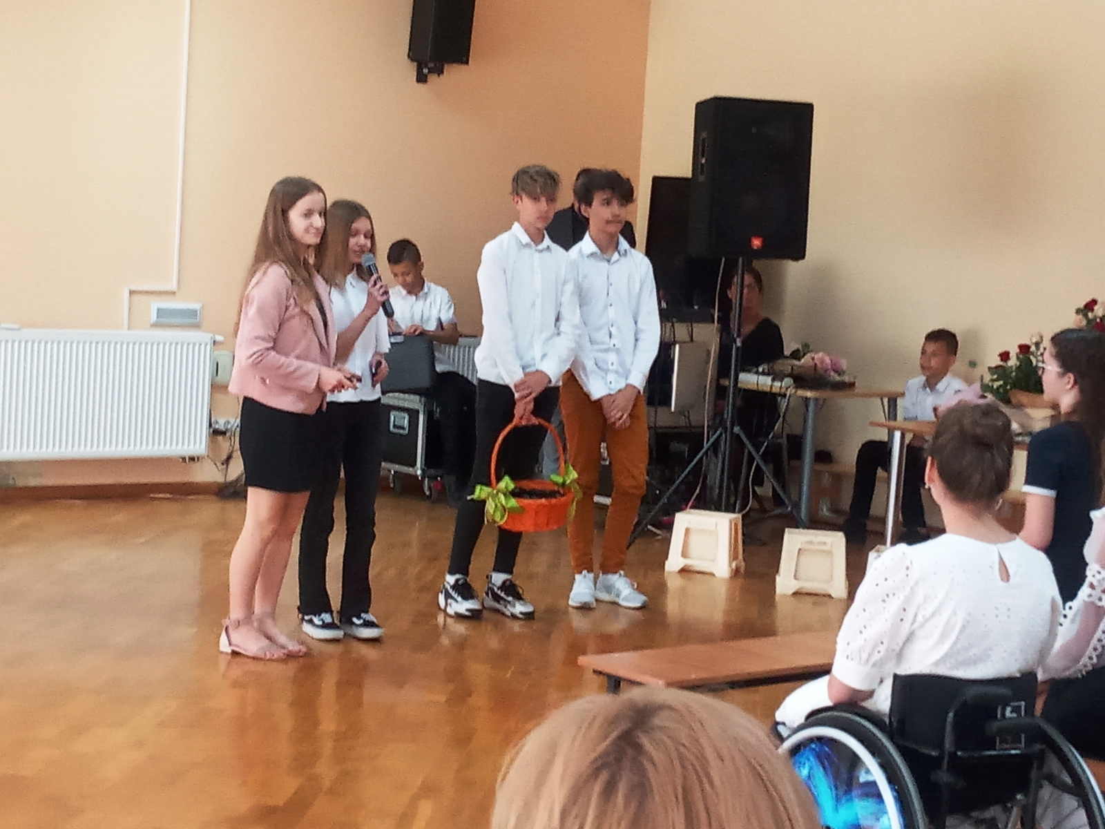 Przedstawiciele klas siódmych przygotowali dla absolwentów słowa pożegnania, serdeczne życzenia oraz upominki.