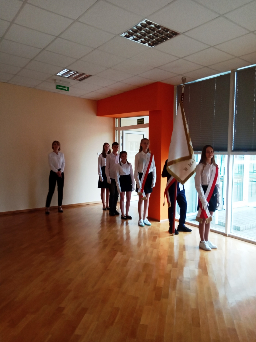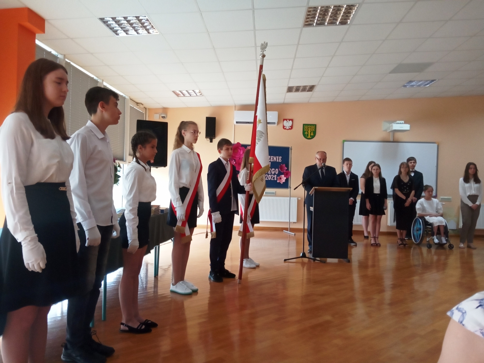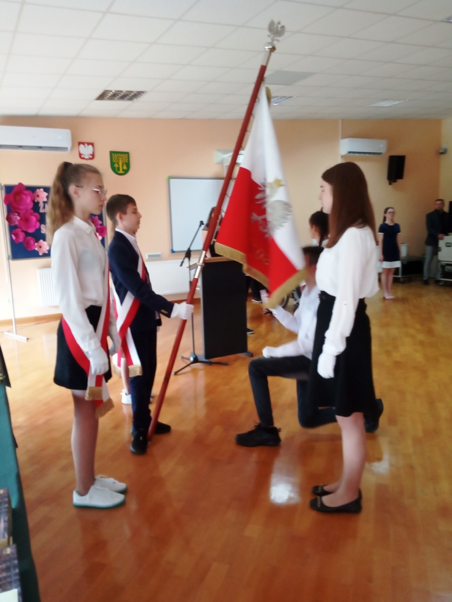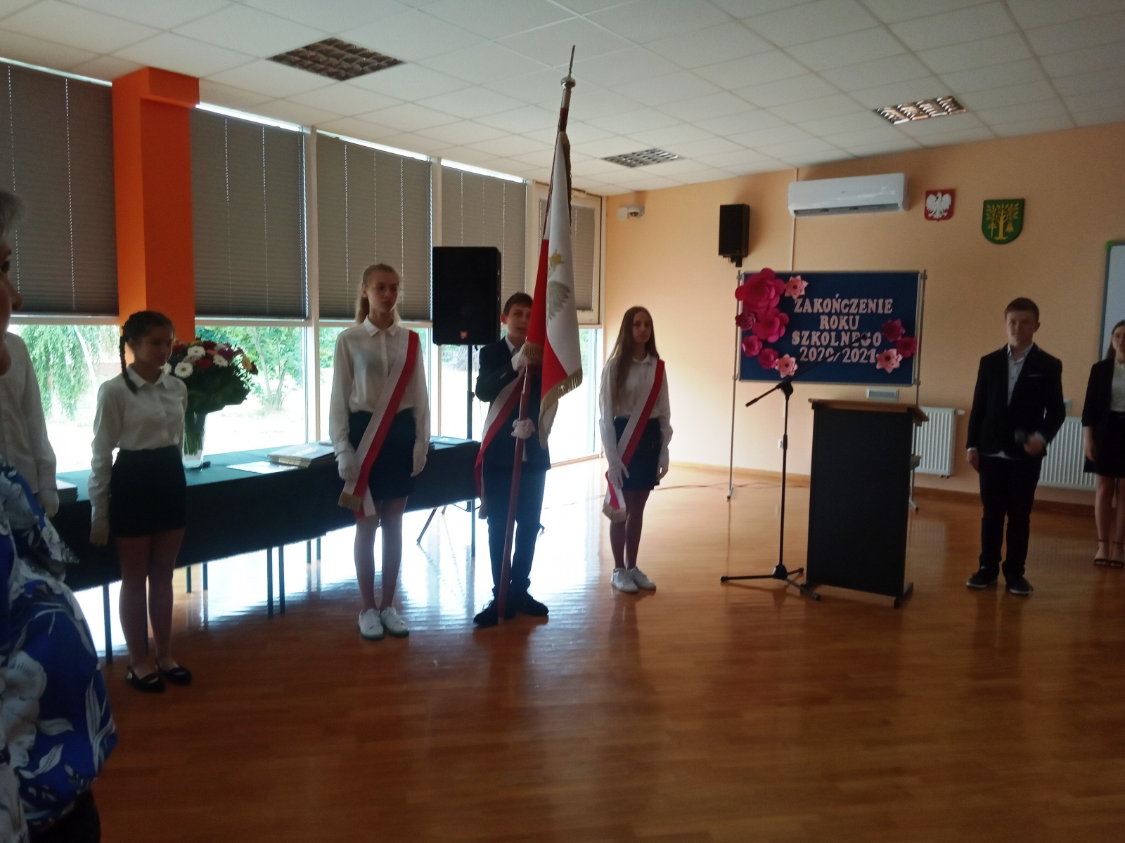 Uroczystość rozpoczęła się wspólnym zaśpiewaniem hymnu państwowego oraz oficjalnym przekazaniem sztandaru szkoły uczniom klas siódmych.