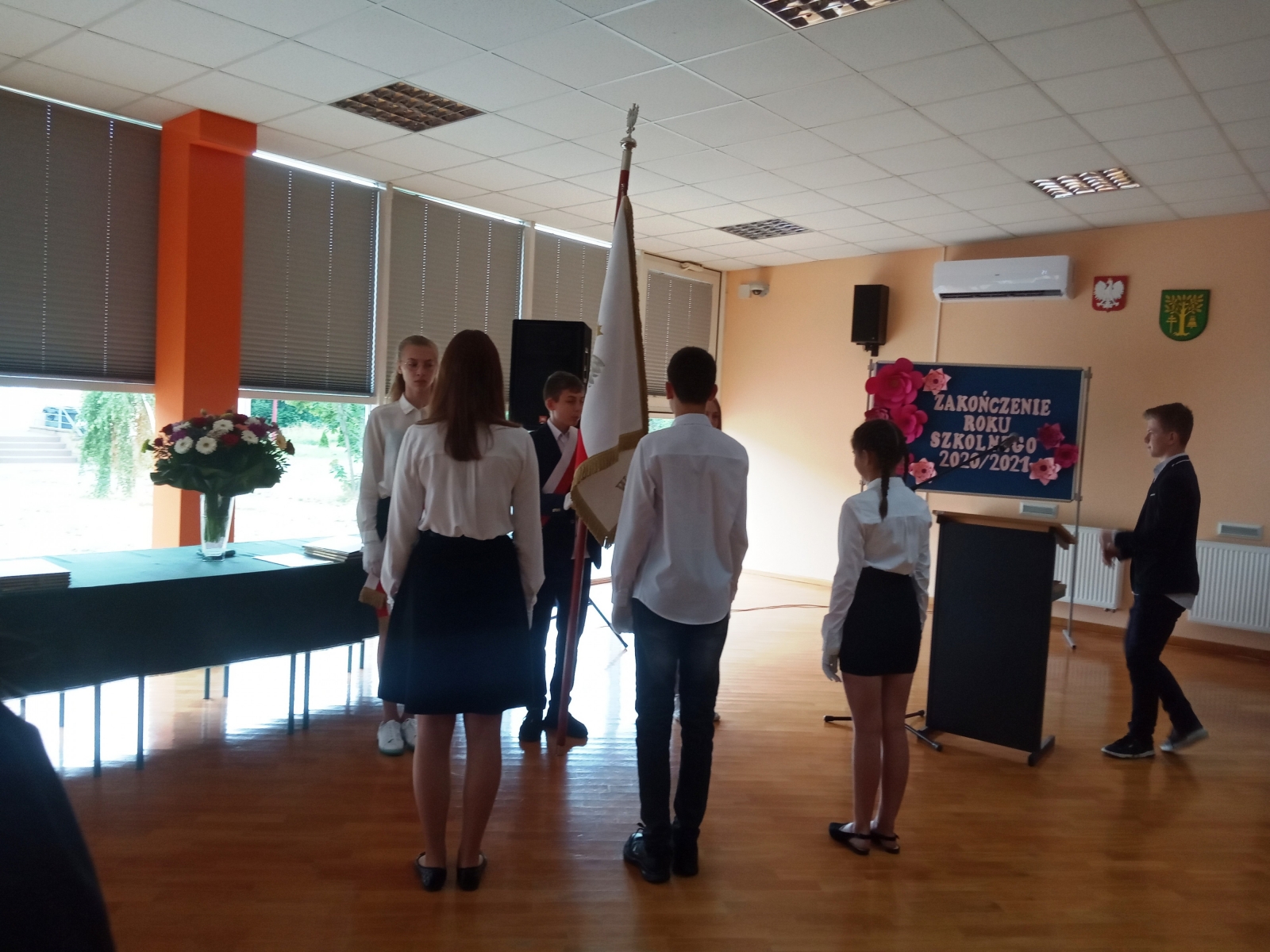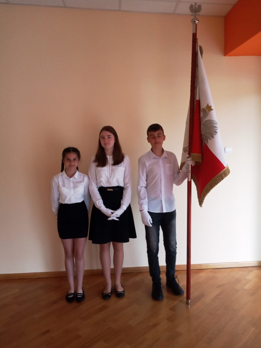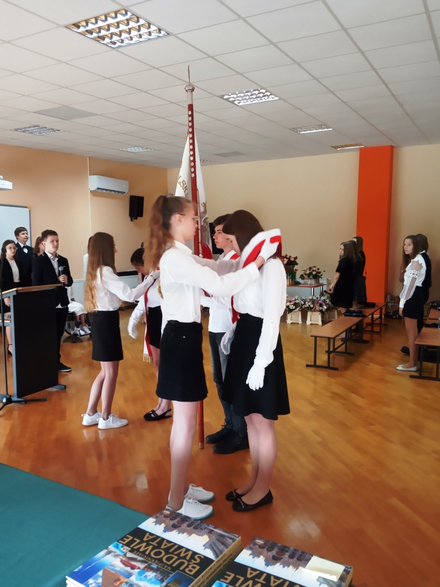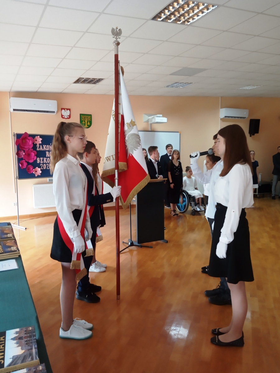 Uroczystość rozpoczęła się wspólnym zaśpiewaniem hymnu państwowego oraz oficjalnym przekazaniem sztandaru szkoły uczniom klas siódmych.