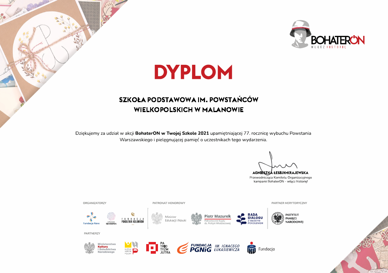 BohaterON w Twojej Szkole 2021 jest częścią ogólnopolskiej kampanii o tematyce historycznej BohaterON – włącz historię! W tym roku szkolnym przyłączyli się do niej uczniowie klasy 8a, 8b i 8c. Kampania ma na celu upamiętnienie i uhonorowanie uczestników Powstania Warszawskiego, a także promocję historii Polski XX wieku oraz kształtowanie postaw patriotycznych.Uczniowie obejrzeli przygotowany przez organizatorów film edukacyjny „Co za historia – Powstanie Warszawskie”. Uczestniczyli w lekcjach poświęconych Powstaniu Warszawskiemu, poznawali sylwetki powstańców, wzbogacali wiedzę przekazem słownym, fotograficznym i muzycznym. Udział w projekcie przybliżył uczniom rzeczywistość powstańczej Warszawy, zachęcił też do samodzielnego poszukiwania informacji. Za udział w akcji BohaterON w Twojej Szkole otrzymaliśmy podziękowania i pamiątkowy dyplom.