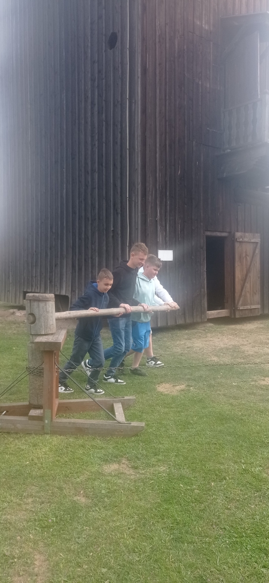 Warsztaty rozpoczęły się w Zagrodzie Młynarskiej od zwiedzania zabytkowego wiatraka z XIX wieku. Młynarz zademonstrował zasady działania młyna, opowiedział w ciekawy sposób historię wiatraka. Uczniowie mogli nie tylko poznać historię młynarstwa w naszej okolicy, ale także przekonać się, jak ciężka była praca młynarza i jak wielu umiejętności wymagała od niego praca w młynie.