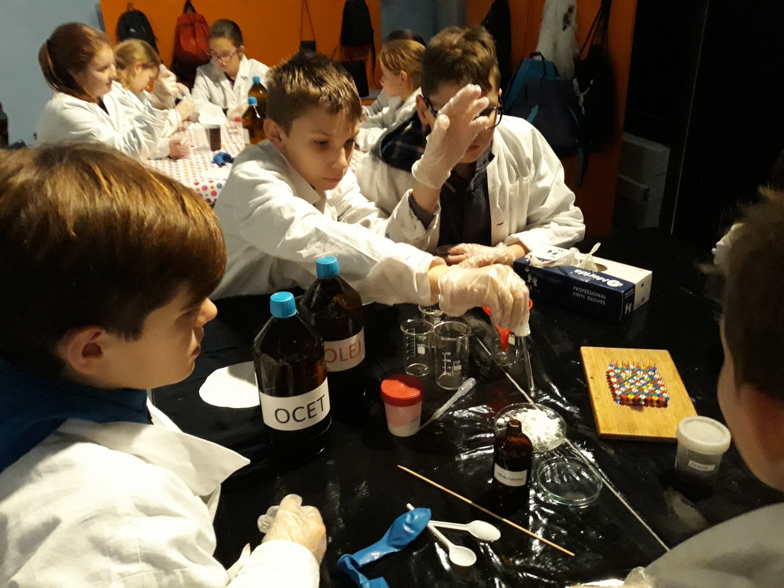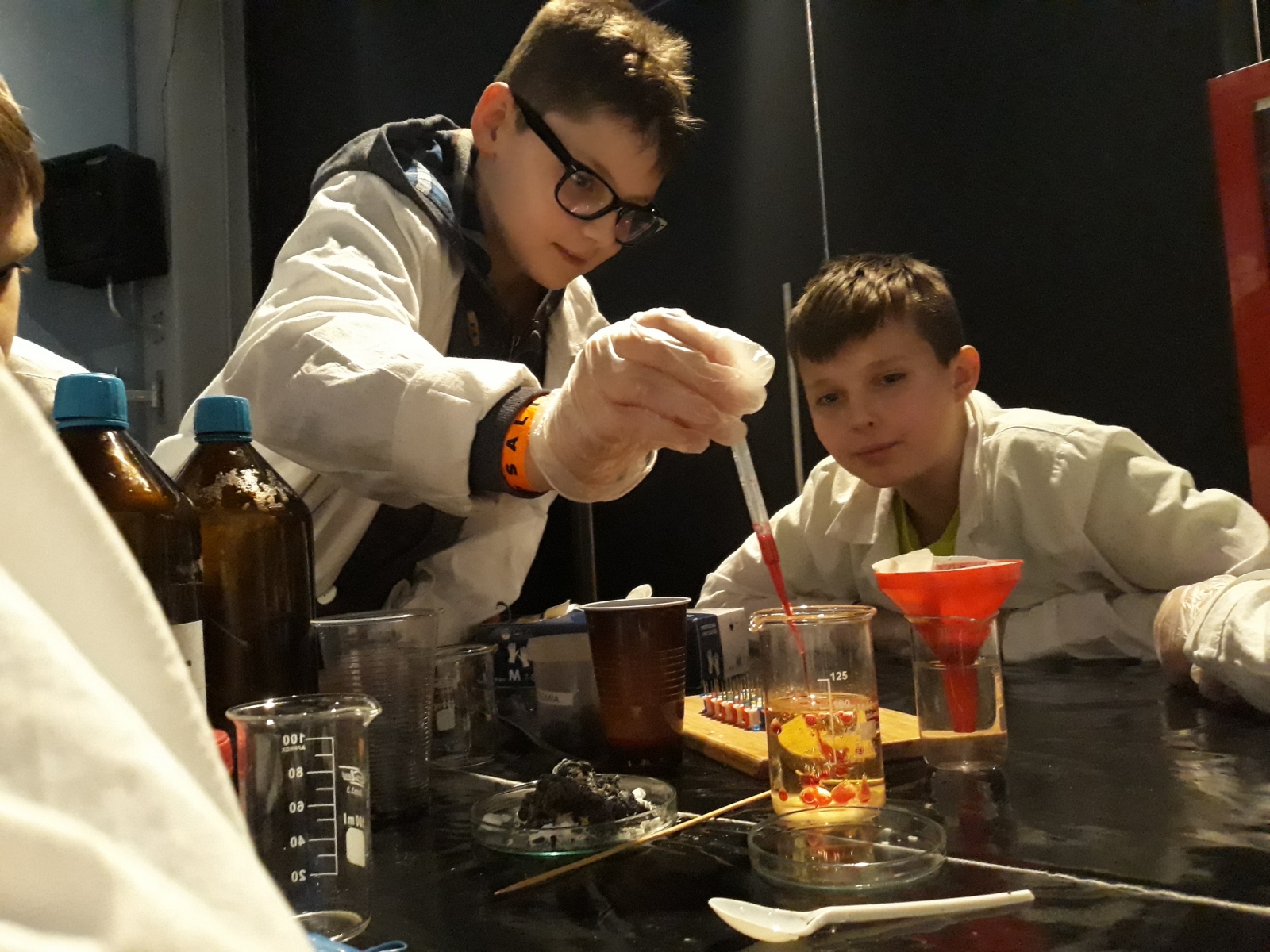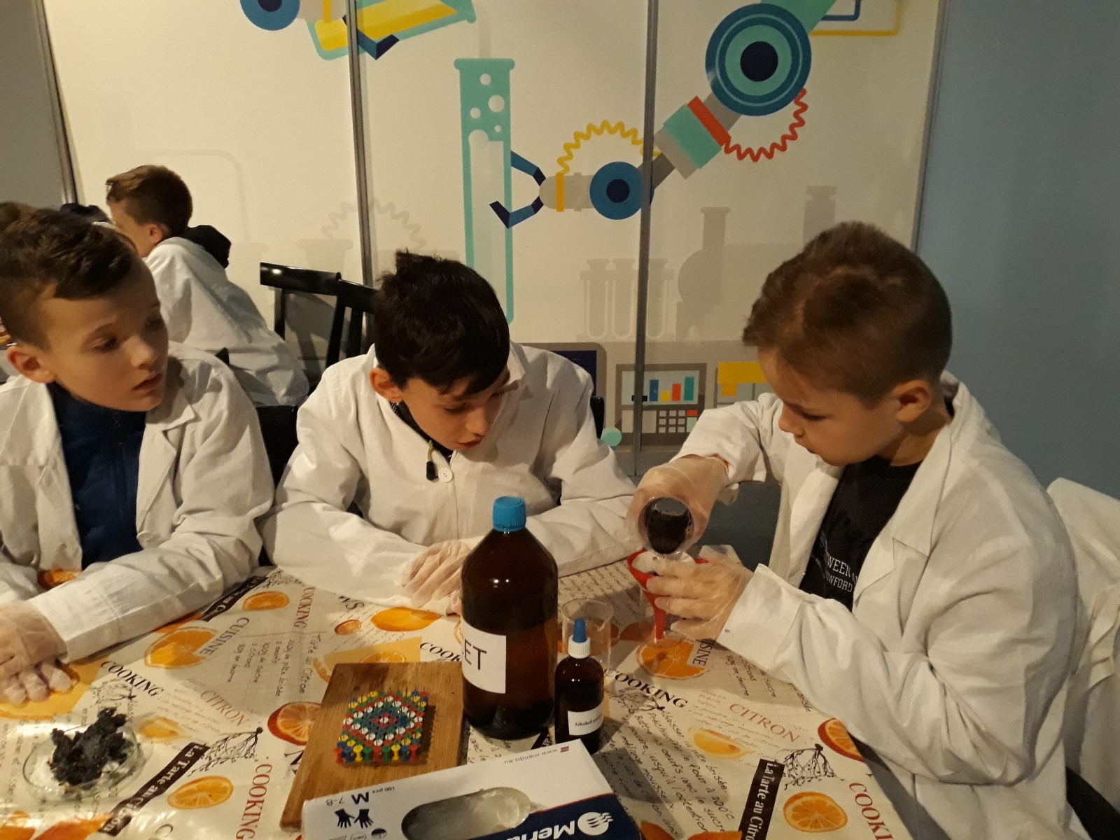 Drugą atrakcją wycieczki był udział w warsztatach w Centrum Nauki „Experymentarium” – ośrodku, w którym nauka nie ma tajemnic i każdy poprzez zabawę może samodzielnie poznać i zrozumieć nawet najbardziej skomplikowane zagadnienia dotyczące czasem bardzo trudnych zjawisk i procesów. Uczestnicy warsztatów dowiedzieli się, jak w bezpieczny sposób wykonać ciekawe eksperymenty z wykorzystaniem artykułów znajdujących się w każdej kuchni. Udało im się uzyskać tak zwane „węże faraona”, lampę lawę czy szaszłyk z balonika. Mogli również przeprowadzić doświadczenia z wykorzystaniem profesjonalnych odczynników, które pozwoliły uczniom poczuć się jak prawdziwi naukowcy.