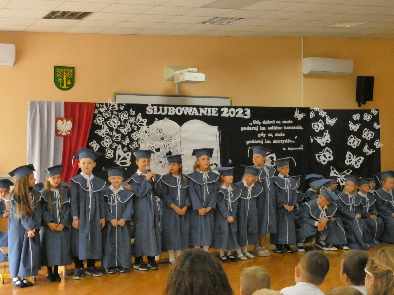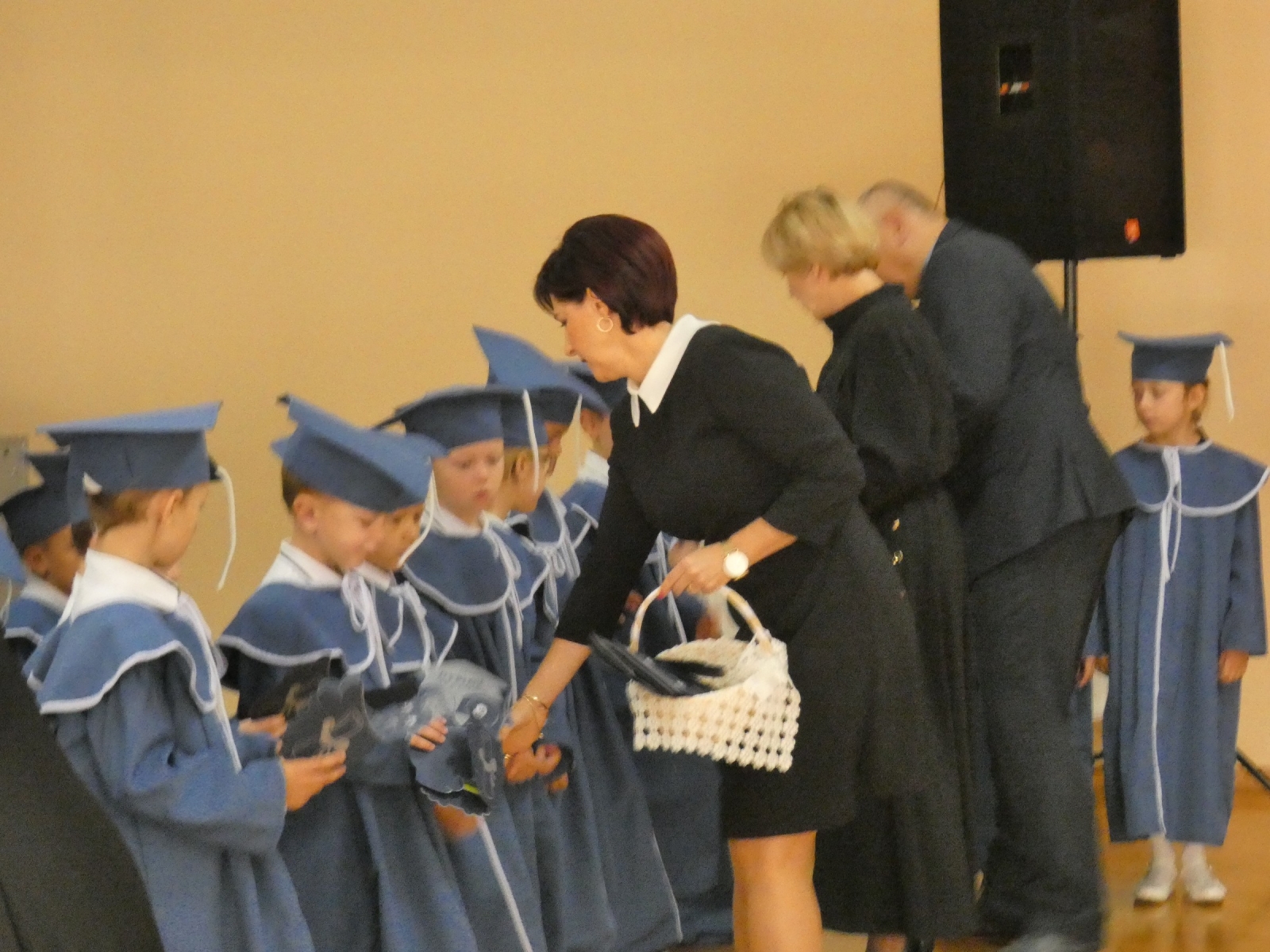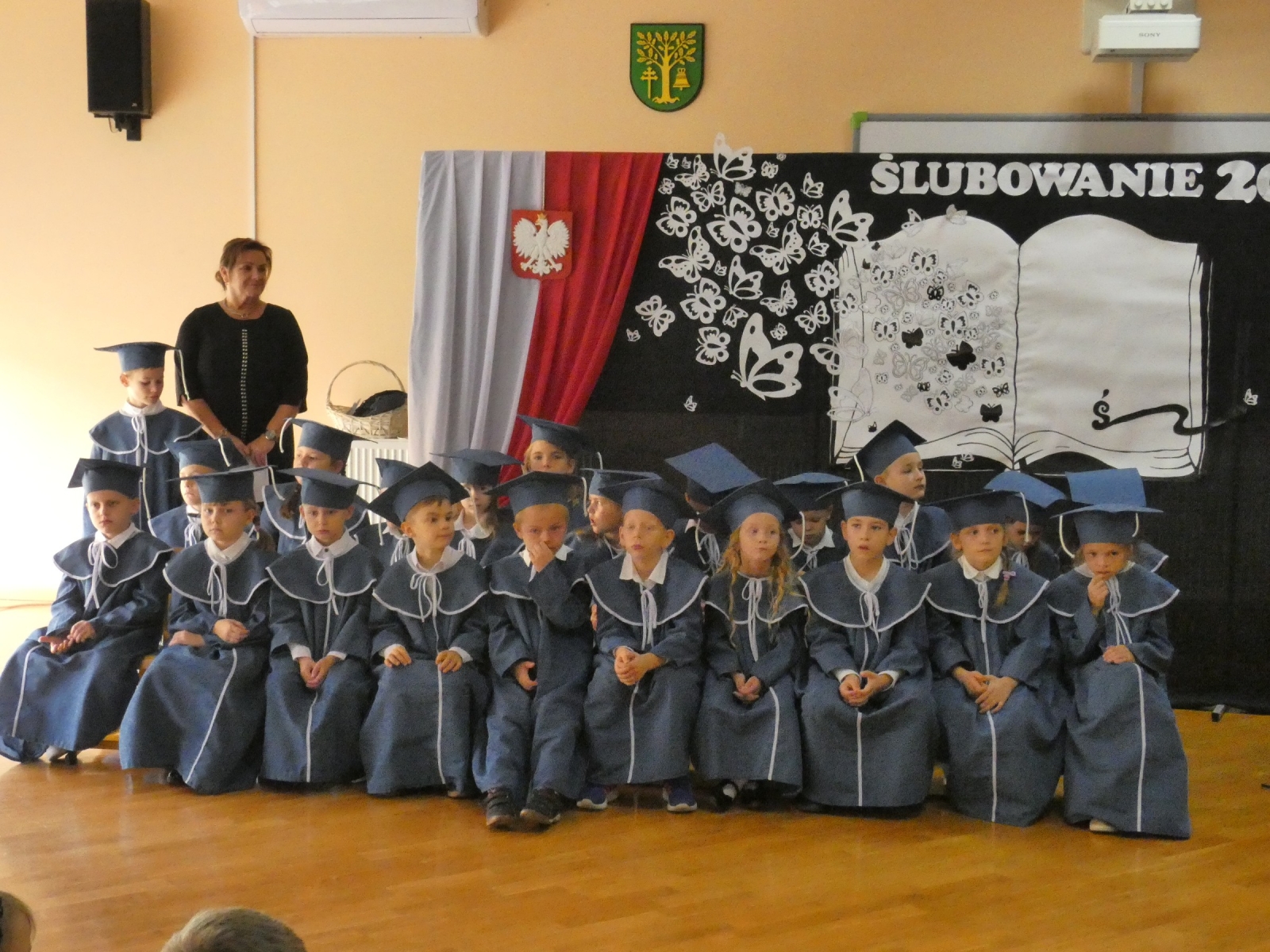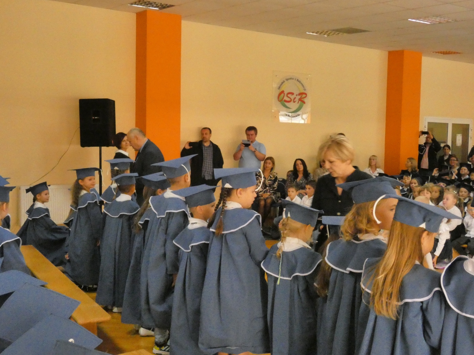 Podekscytowane Pierwszaki przygotowywały się do uroczystości od kilku tygodni. W uroczystym i podniosłym nastroju, odświętnie ubrane w togi i birety, z niecierpliwością czekały na Gości, Rodziców i rozpoczęcie ważnego wydarzenia. Pan Dyrektor powitał wszystkich przybyłych, a Pierwszaki z niewielką tremą, ale sprawnie, zaczęły prezentować program artystyczny. Swój pierwszy, ważny egzamin na ucznia zdały śpiewająco. Państwo Dyrektorzy, zgromadzeni Goście, Rodzice i Nauczyciele wspólnie potwierdzili dobre przygotowanie dzieci, więc Pan Dyrektor mógł dokonać Ślubowania i Pasowania na ucznia. Z rąk pani Wicedyrektor U. Kamińskiej, dzieci otrzymały tarcze uczniowskie, a Wychowawczynie gratulowały swoim Wychowankom, wręczając pamiątkowe dyplomy.