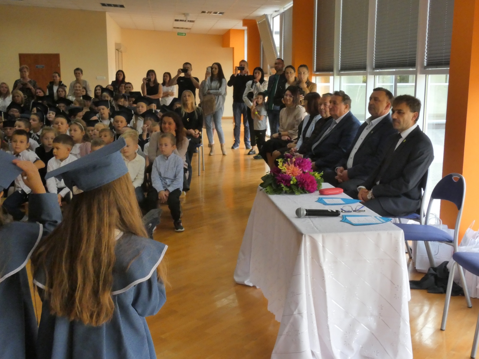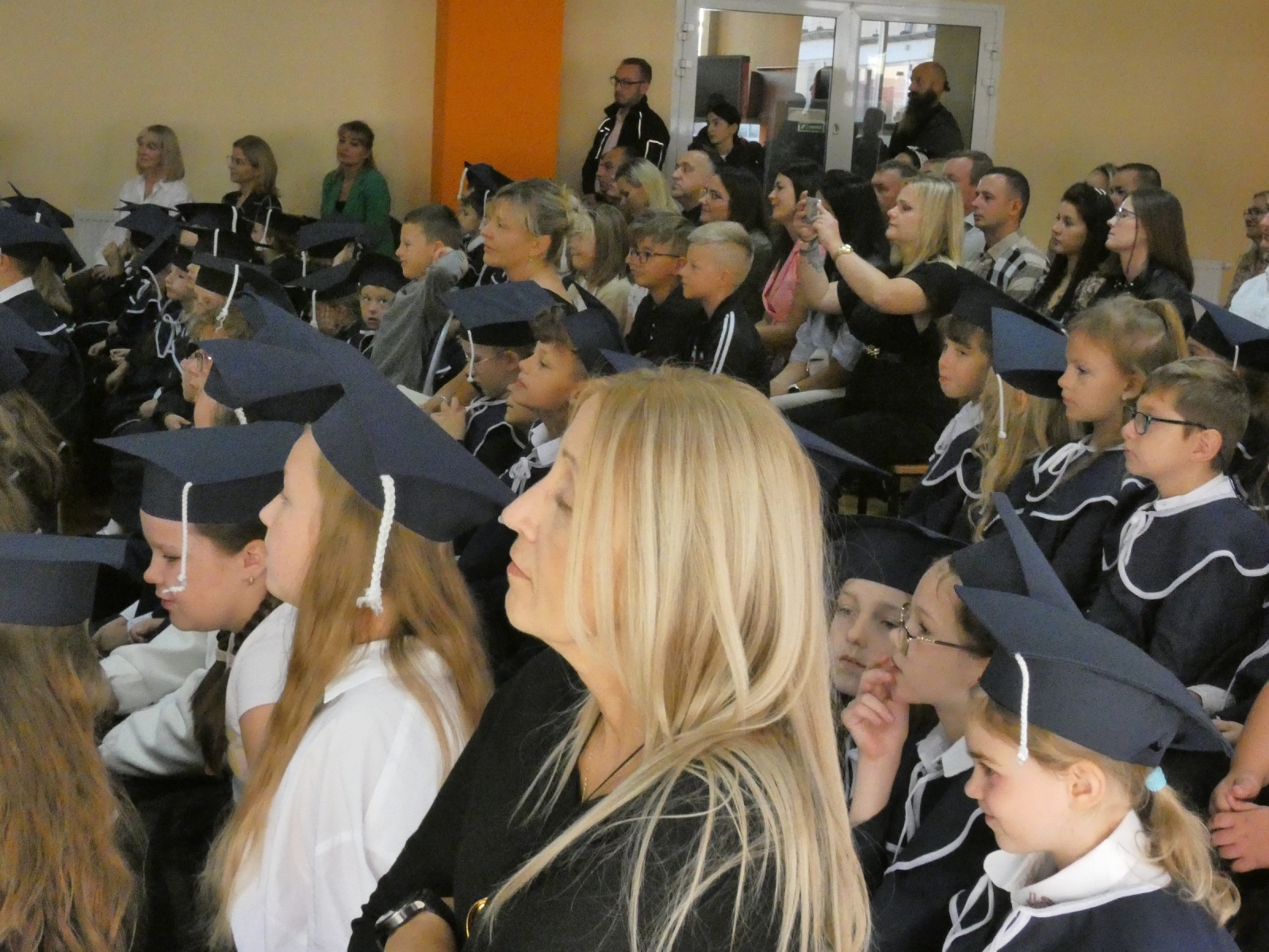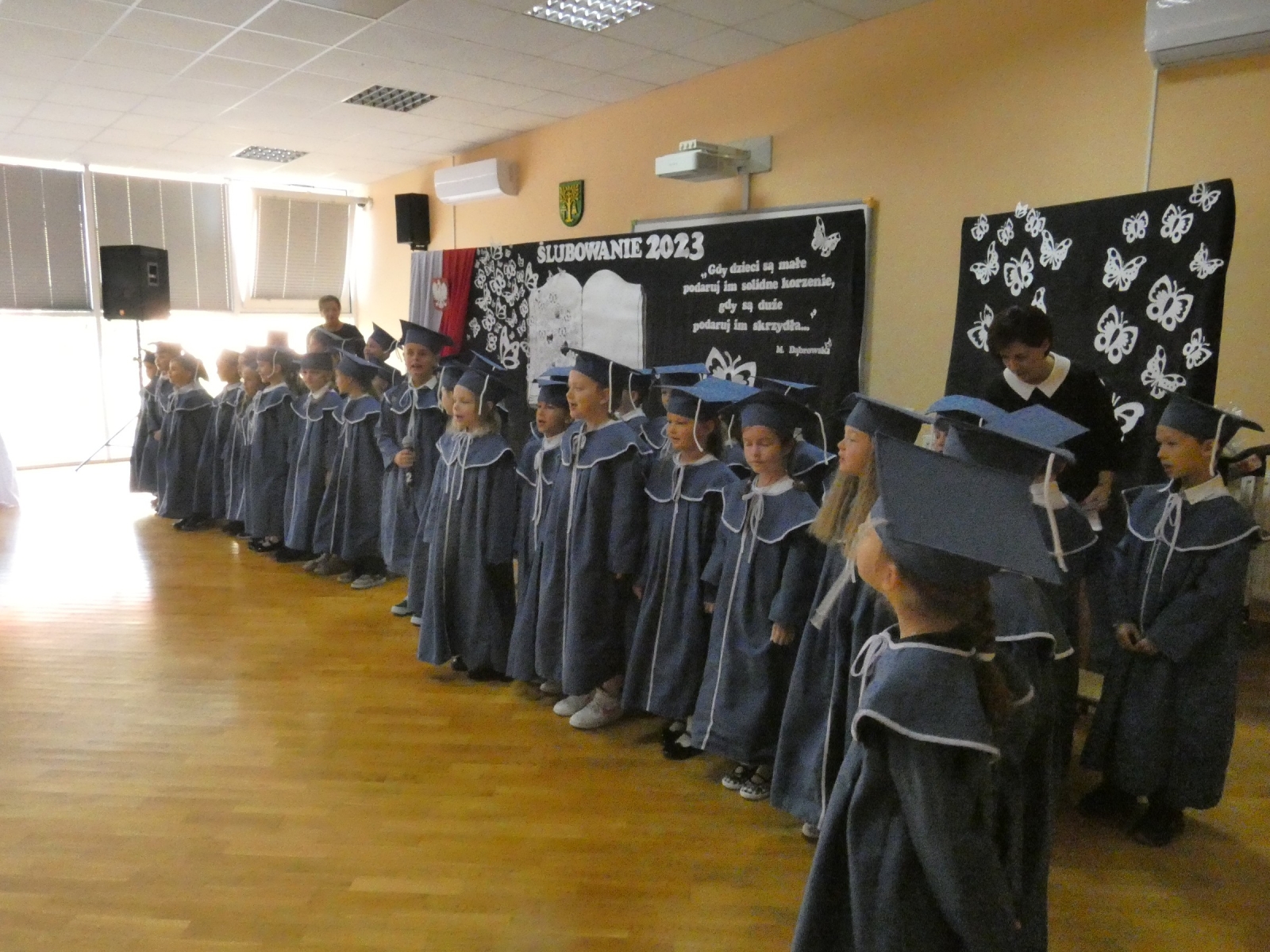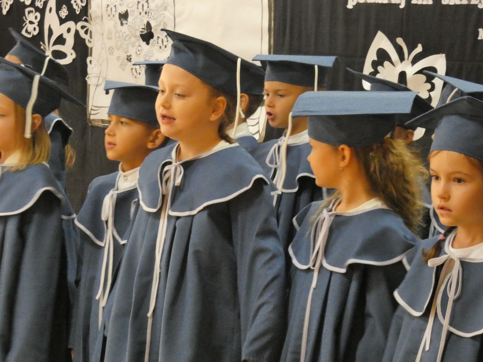 Podekscytowane Pierwszaki przygotowywały się do uroczystości od kilku tygodni. W uroczystym i podniosłym nastroju, odświętnie ubrane w togi i birety, z niecierpliwością czekały na Gości, Rodziców i rozpoczęcie ważnego wydarzenia. Pan Dyrektor powitał wszystkich przybyłych, a Pierwszaki z niewielką tremą, ale sprawnie, zaczęły prezentować program artystyczny. Swój pierwszy, ważny egzamin na ucznia zdały śpiewająco. Państwo Dyrektorzy, zgromadzeni Goście, Rodzice i Nauczyciele wspólnie potwierdzili dobre przygotowanie dzieci, więc Pan Dyrektor mógł dokonać Ślubowania i Pasowania na ucznia. Z rąk pani Wicedyrektor U. Kamińskiej, dzieci otrzymały tarcze uczniowskie, a Wychowawczynie gratulowały swoim Wychowankom, wręczając pamiątkowe dyplomy.