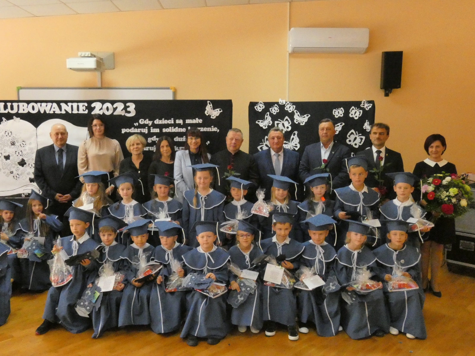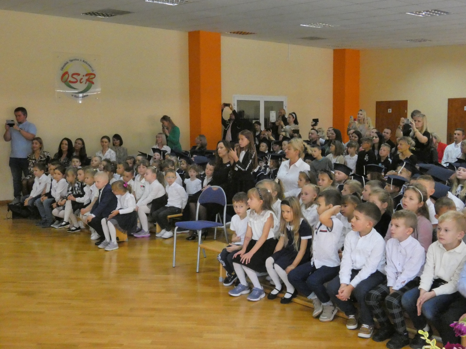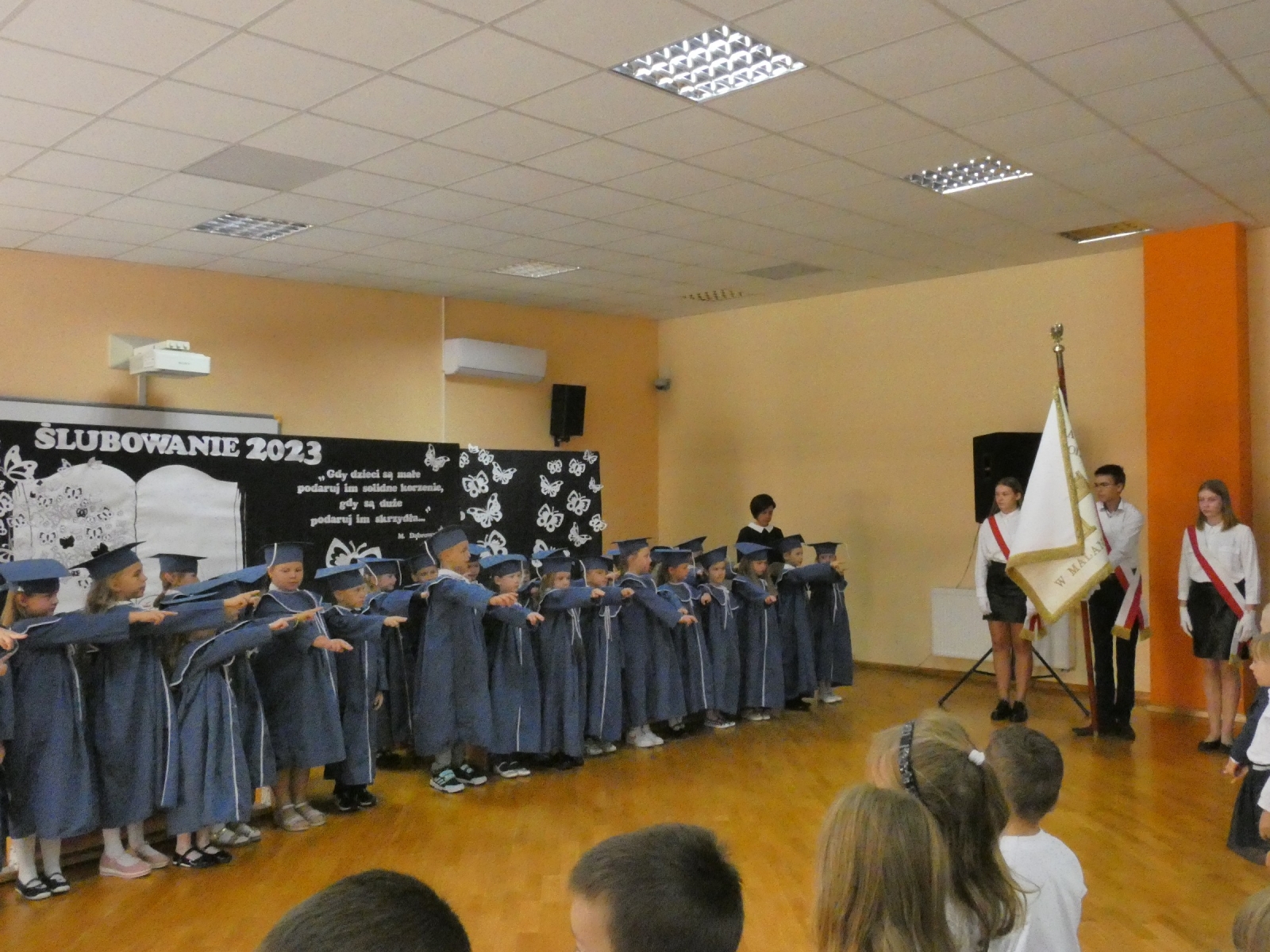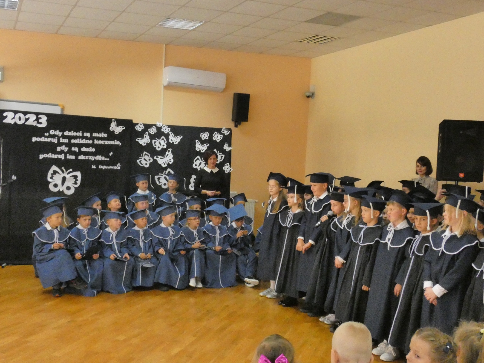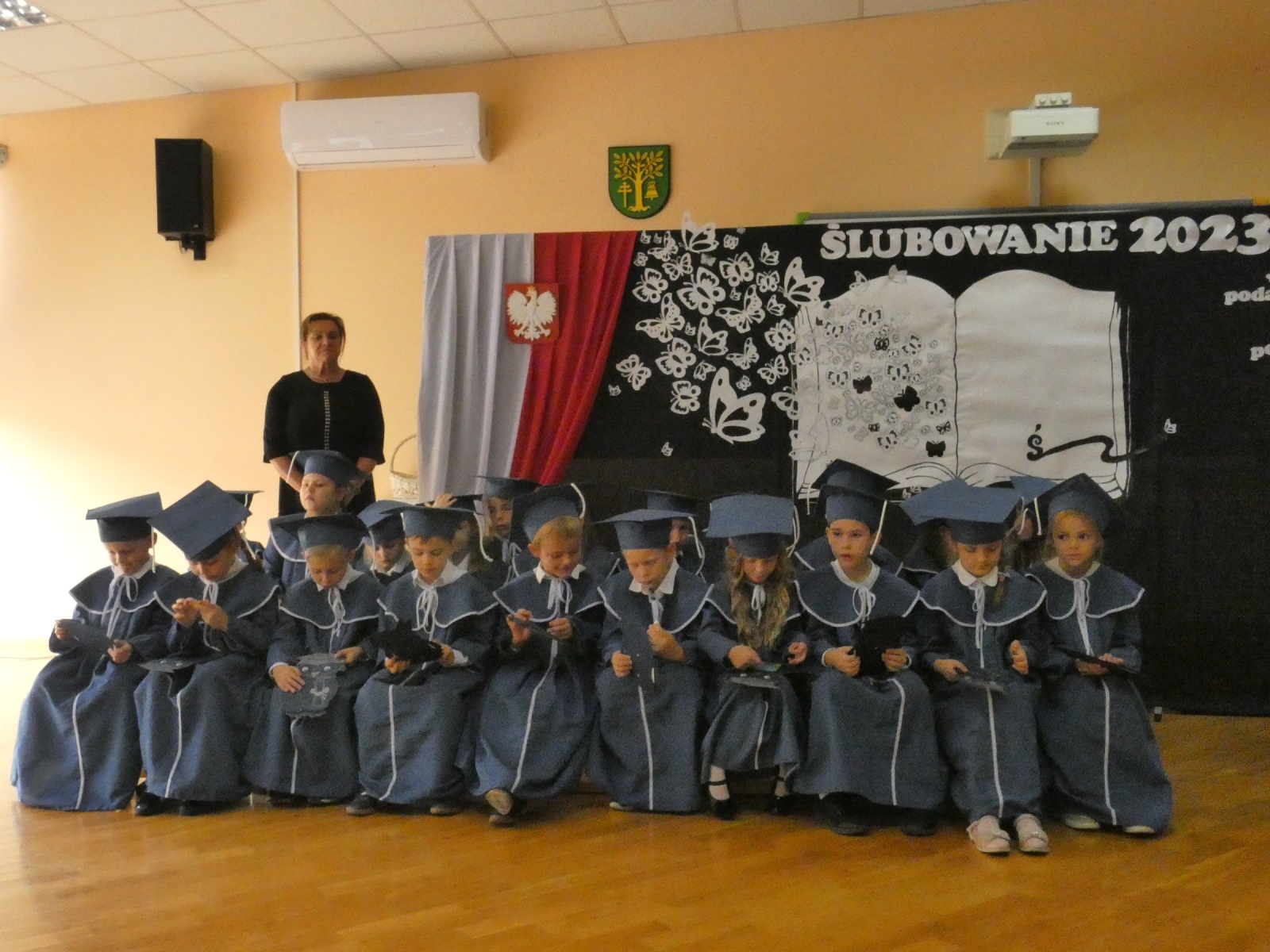 Podekscytowane Pierwszaki przygotowywały się do uroczystości od kilku tygodni. W uroczystym i podniosłym nastroju, odświętnie ubrane w togi i birety, z niecierpliwością czekały na Gości, Rodziców i rozpoczęcie ważnego wydarzenia. Pan Dyrektor powitał wszystkich przybyłych, a Pierwszaki z niewielką tremą, ale sprawnie, zaczęły prezentować program artystyczny. Swój pierwszy, ważny egzamin na ucznia zdały śpiewająco. Państwo Dyrektorzy, zgromadzeni Goście, Rodzice i Nauczyciele wspólnie potwierdzili dobre przygotowanie dzieci, więc Pan Dyrektor mógł dokonać Ślubowania i Pasowania na ucznia. Z rąk pani Wicedyrektor U. Kamińskiej, dzieci otrzymały tarcze uczniowskie, a Wychowawczynie gratulowały swoim Wychowankom, wręczając pamiątkowe dyplomy.