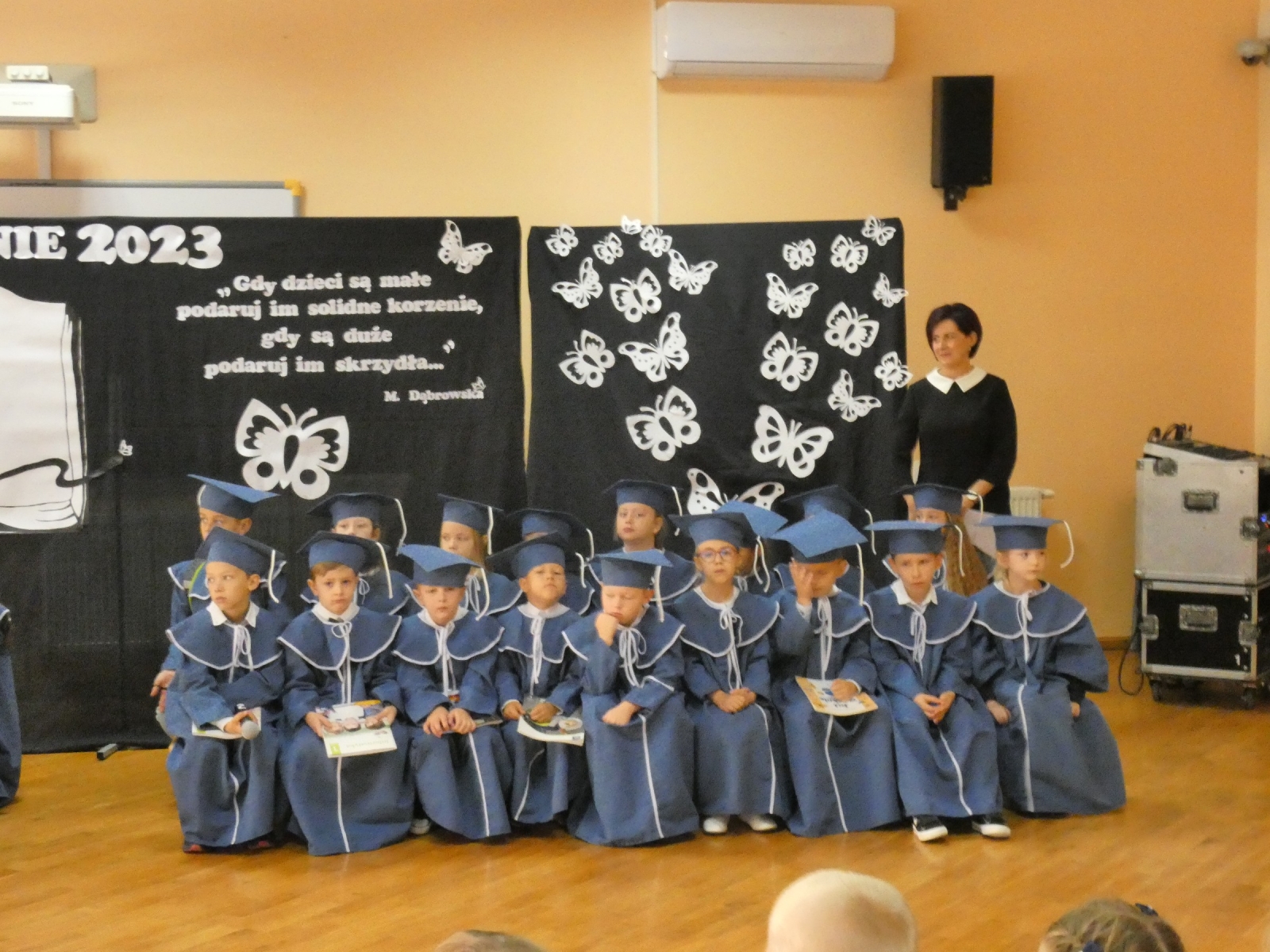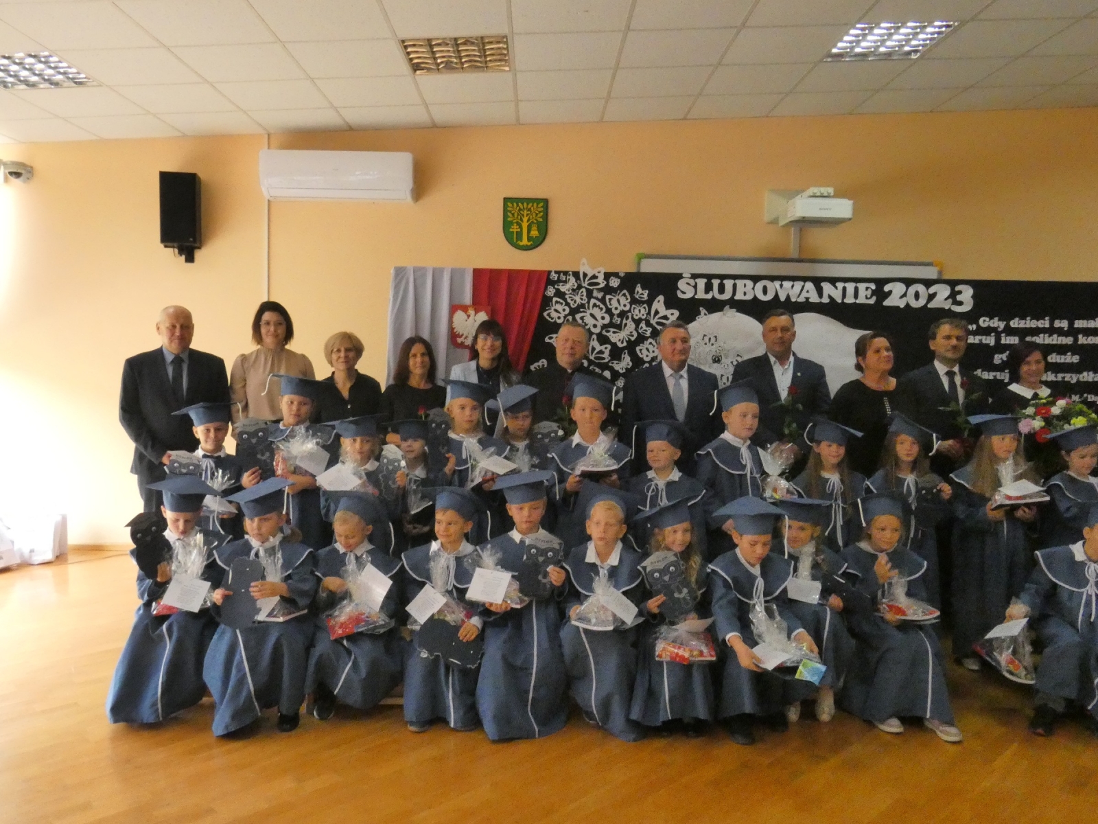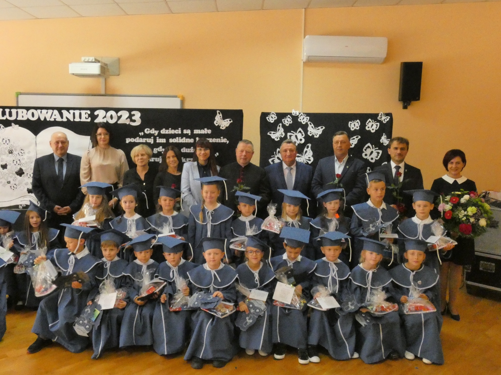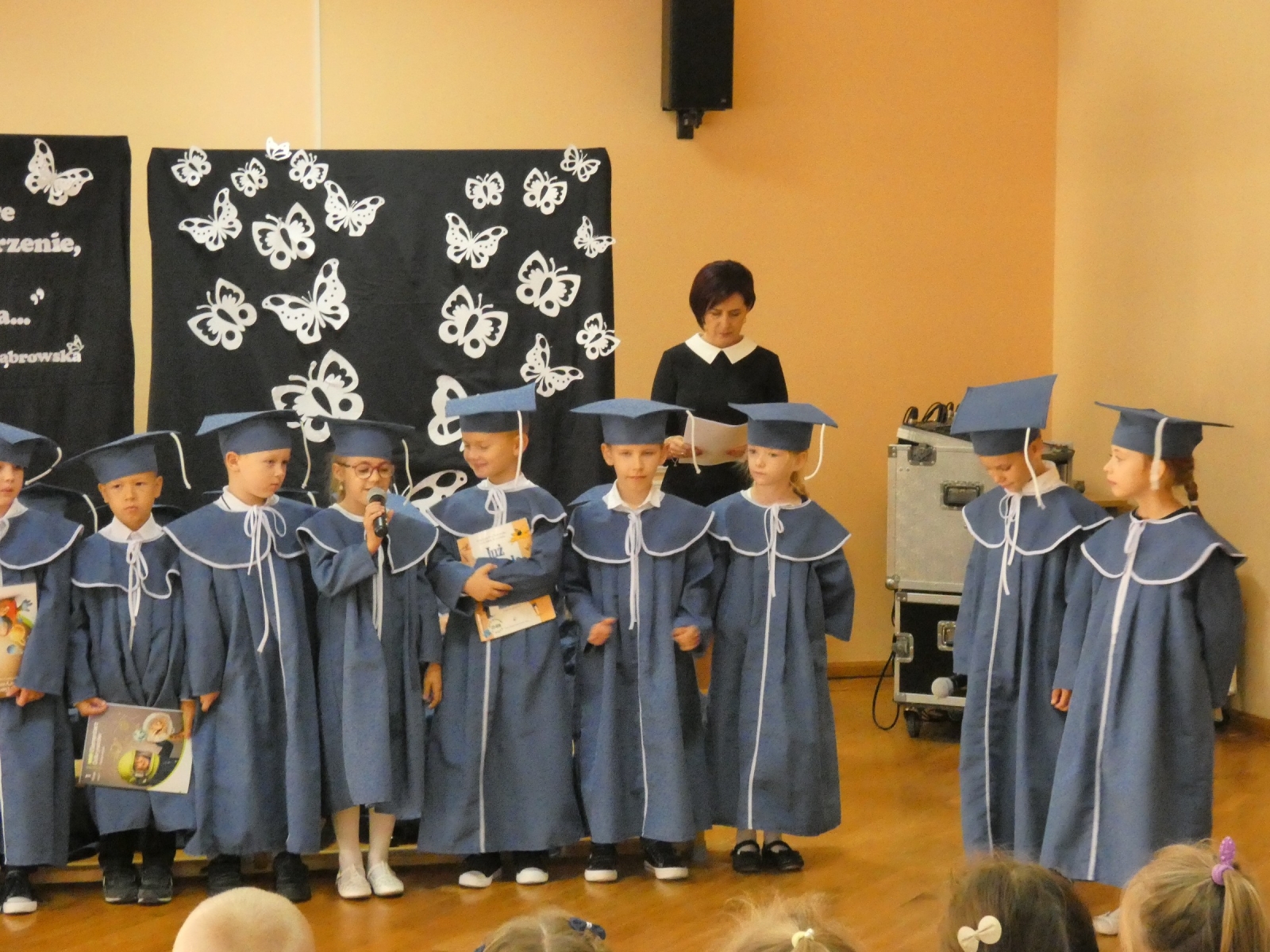 Podekscytowane Pierwszaki przygotowywały się do uroczystości od kilku tygodni. W uroczystym i podniosłym nastroju, odświętnie ubrane w togi i birety, z niecierpliwością czekały na Gości, Rodziców i rozpoczęcie ważnego wydarzenia. Pan Dyrektor powitał wszystkich przybyłych, a Pierwszaki z niewielką tremą, ale sprawnie, zaczęły prezentować program artystyczny. Swój pierwszy, ważny egzamin na ucznia zdały śpiewająco. Państwo Dyrektorzy, zgromadzeni Goście, Rodzice i Nauczyciele wspólnie potwierdzili dobre przygotowanie dzieci, więc Pan Dyrektor mógł dokonać Ślubowania i Pasowania na ucznia. Z rąk pani Wicedyrektor U. Kamińskiej, dzieci otrzymały tarcze uczniowskie, a Wychowawczynie gratulowały swoim Wychowankom, wręczając pamiątkowe dyplomy.