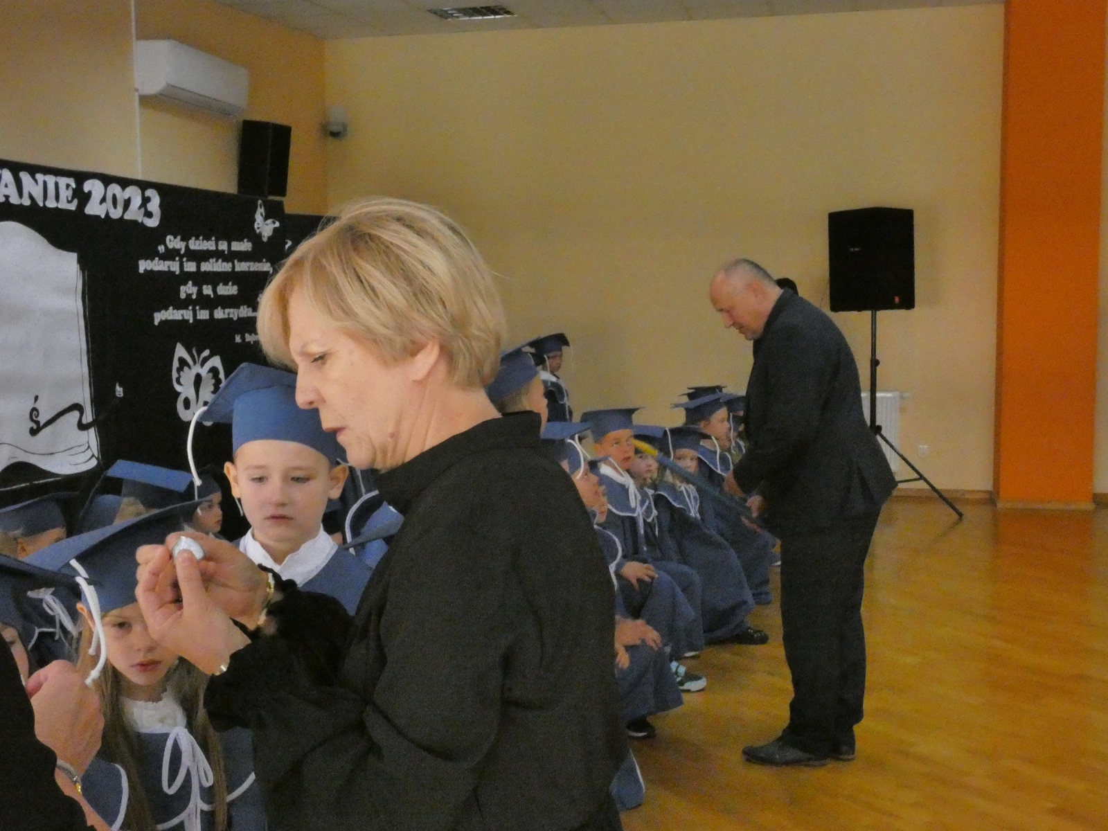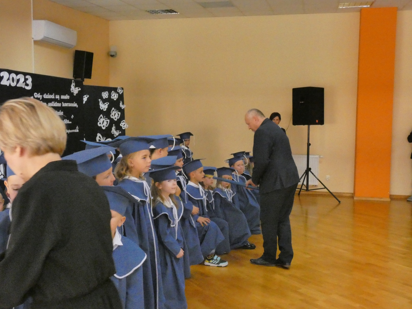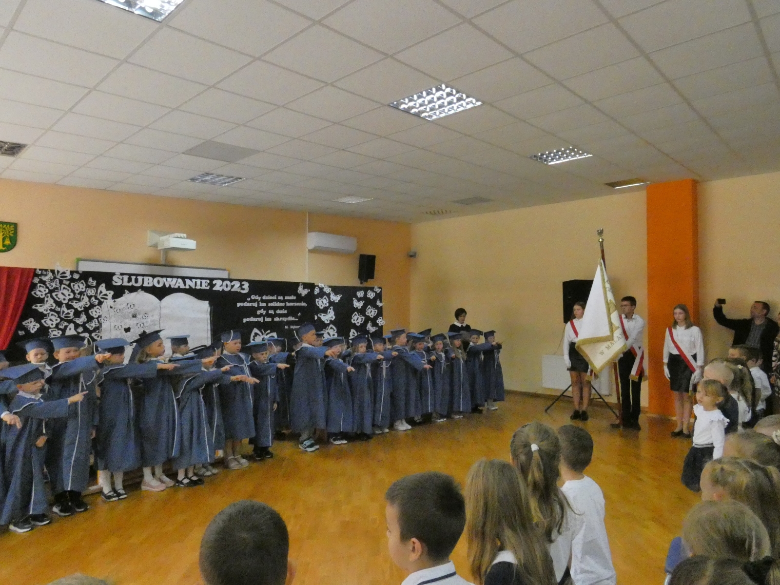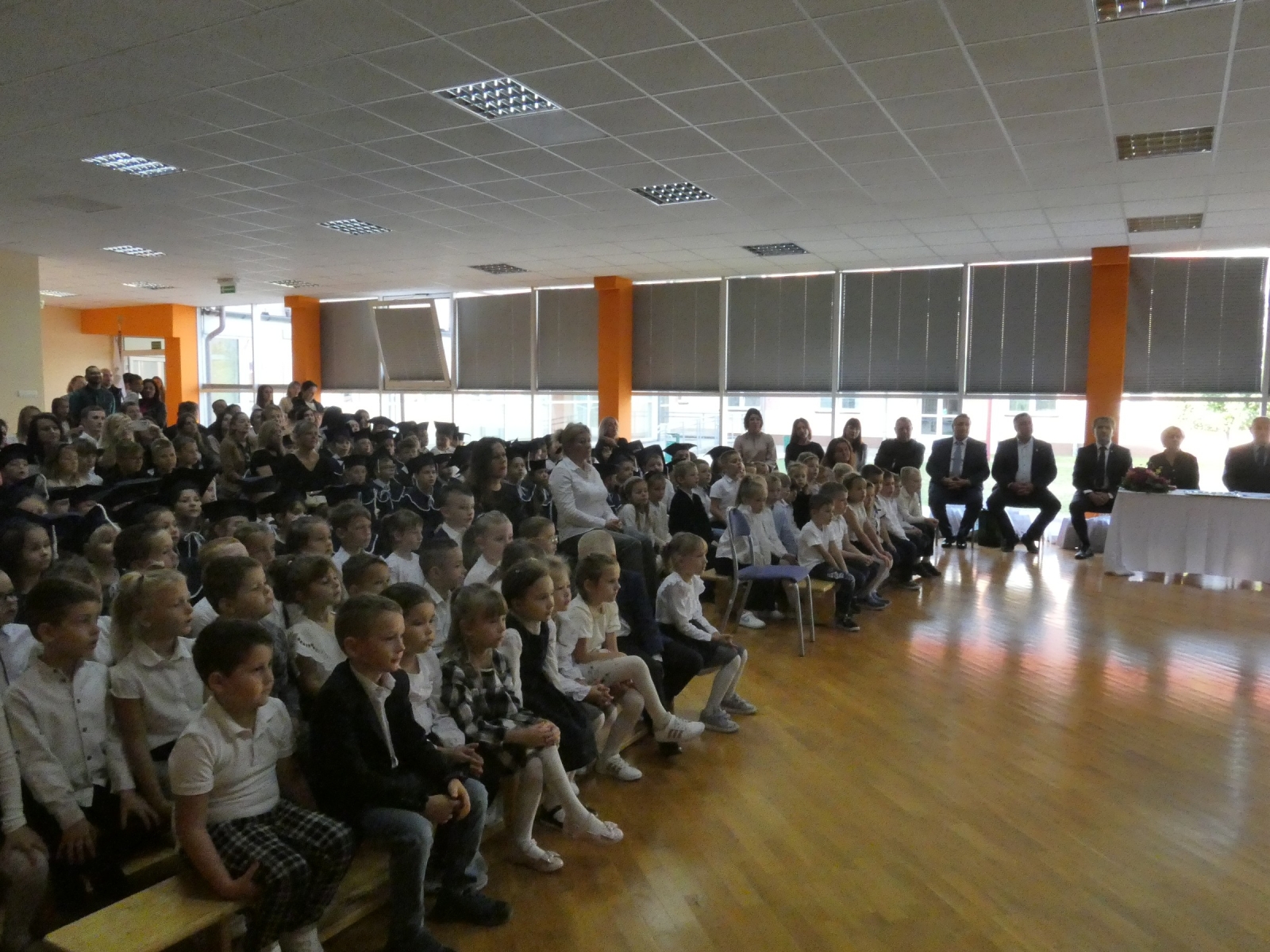 Podekscytowane Pierwszaki przygotowywały się do uroczystości od kilku tygodni. W uroczystym i podniosłym nastroju, odświętnie ubrane w togi i birety, z niecierpliwością czekały na Gości, Rodziców i rozpoczęcie ważnego wydarzenia. Pan Dyrektor powitał wszystkich przybyłych, a Pierwszaki z niewielką tremą, ale sprawnie, zaczęły prezentować program artystyczny. Swój pierwszy, ważny egzamin na ucznia zdały śpiewająco. Państwo Dyrektorzy, zgromadzeni Goście, Rodzice i Nauczyciele wspólnie potwierdzili dobre przygotowanie dzieci, więc Pan Dyrektor mógł dokonać Ślubowania i Pasowania na ucznia. Z rąk pani Wicedyrektor U. Kamińskiej, dzieci otrzymały tarcze uczniowskie, a Wychowawczynie gratulowały swoim Wychowankom, wręczając pamiątkowe dyplomy.