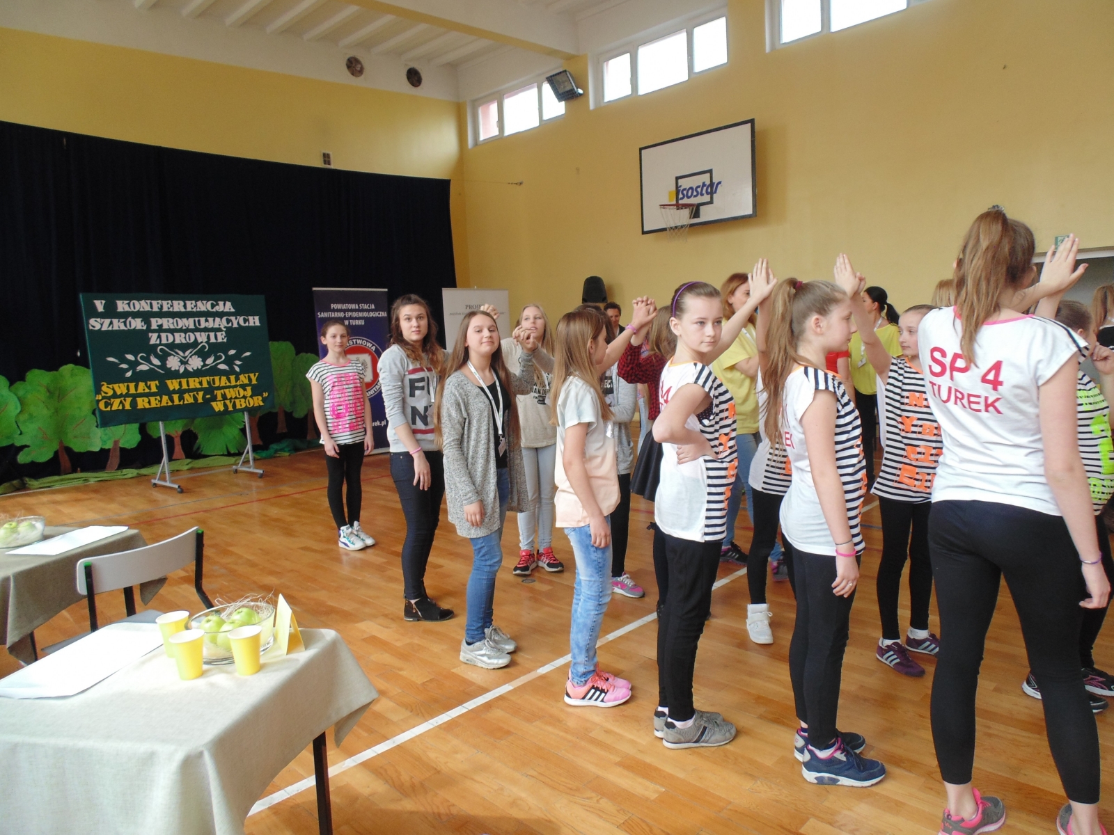 „Świat wirtualny czy realny - Twój wybór”. Tak brzmiał temat przewodni V Konferencji Szkół Promujących Zdrowie, w której uczestniczyliśmy dn. 27 kwietnia. Tym razem na konferencję zaprosiła nas dyrekcja i nauczyciele Szkoły Podstawowej nr. 4 w Turku. Naszą szkołę na konferencji prezentowały dwie uczennice klasy VI B Daria Balcerzak oraz Dobrosława Dembińska z koordynatorem szkolnym Julitą Muszalską oraz dyrektorem szkoły Markiem Nowickim. Po uroczystym przywitaniu przybyłych gości oraz przemówieniach obejrzeliśmy przedstawienie w wykonaniu uczniów pt. „Gucio w Internecie”. Wysłuchaliśmy również prelekcji Władysława Szuszfalaka psychologa z Poradni Psychologiczno- Pedagogicznej w Turku na temat tego jak umiejętnie korzystać z Internetu i innych technologii informacyjnych. Atrakcyjną częścią spotkania okazały się zajęcia integracyjne uczniów, nauczycieli i zaproszonych gości, czyli wspólne układanie krzyżówki, zabawy i nauka tańca zumba.