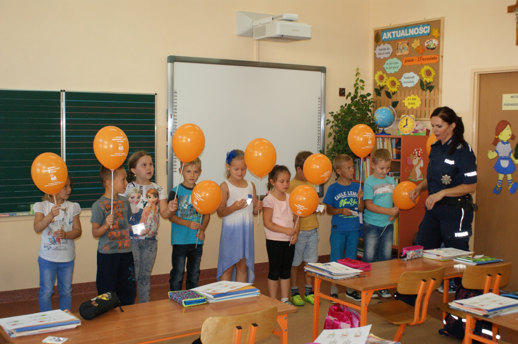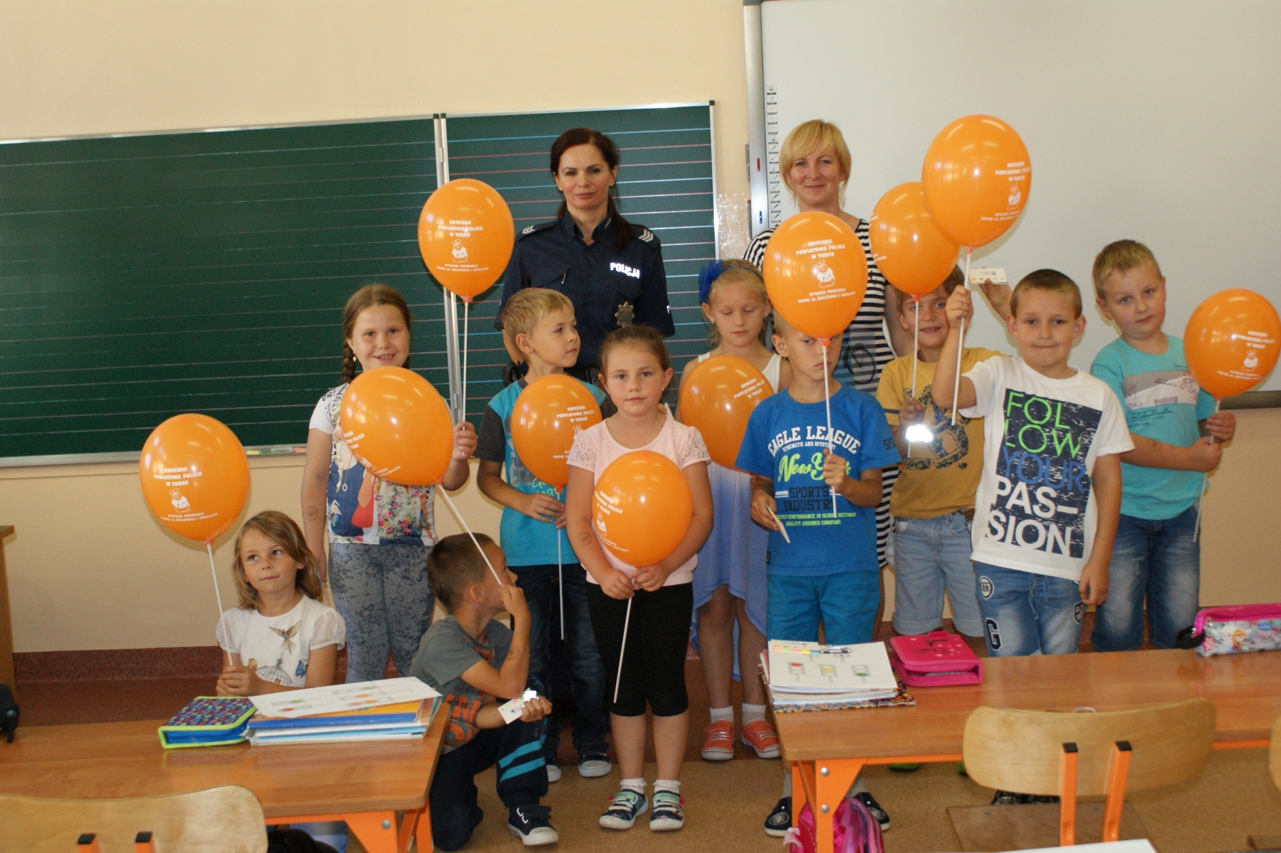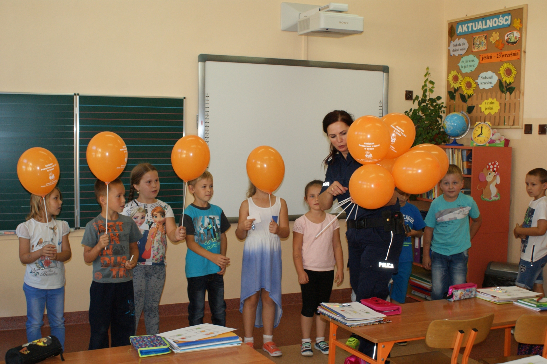Na zakończenie spotkania uczniowie otrzymali pamiątki: notesiki z karteczkami samoprzylepnymi, odblaski, balony oraz pieczątkę Pyrka stemplowaną na rękach dzieci.