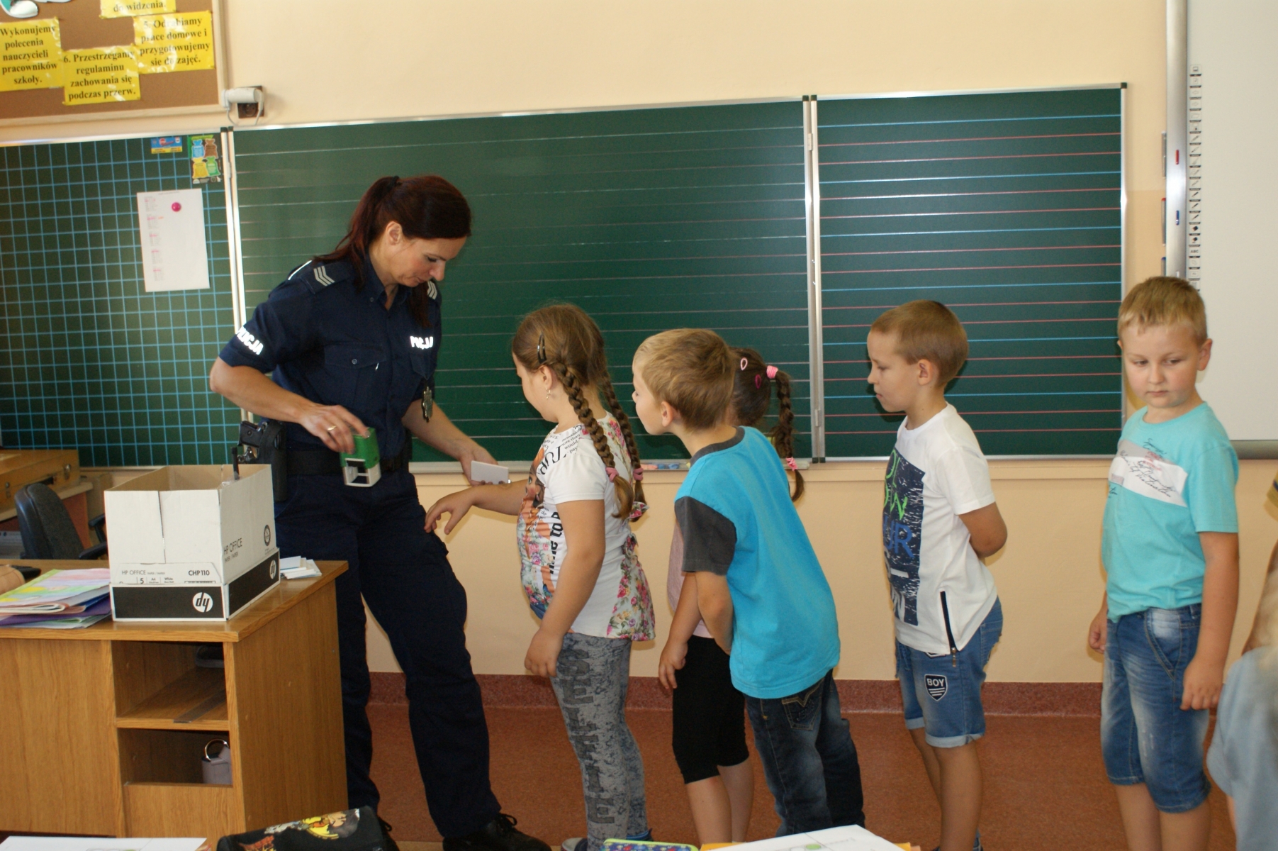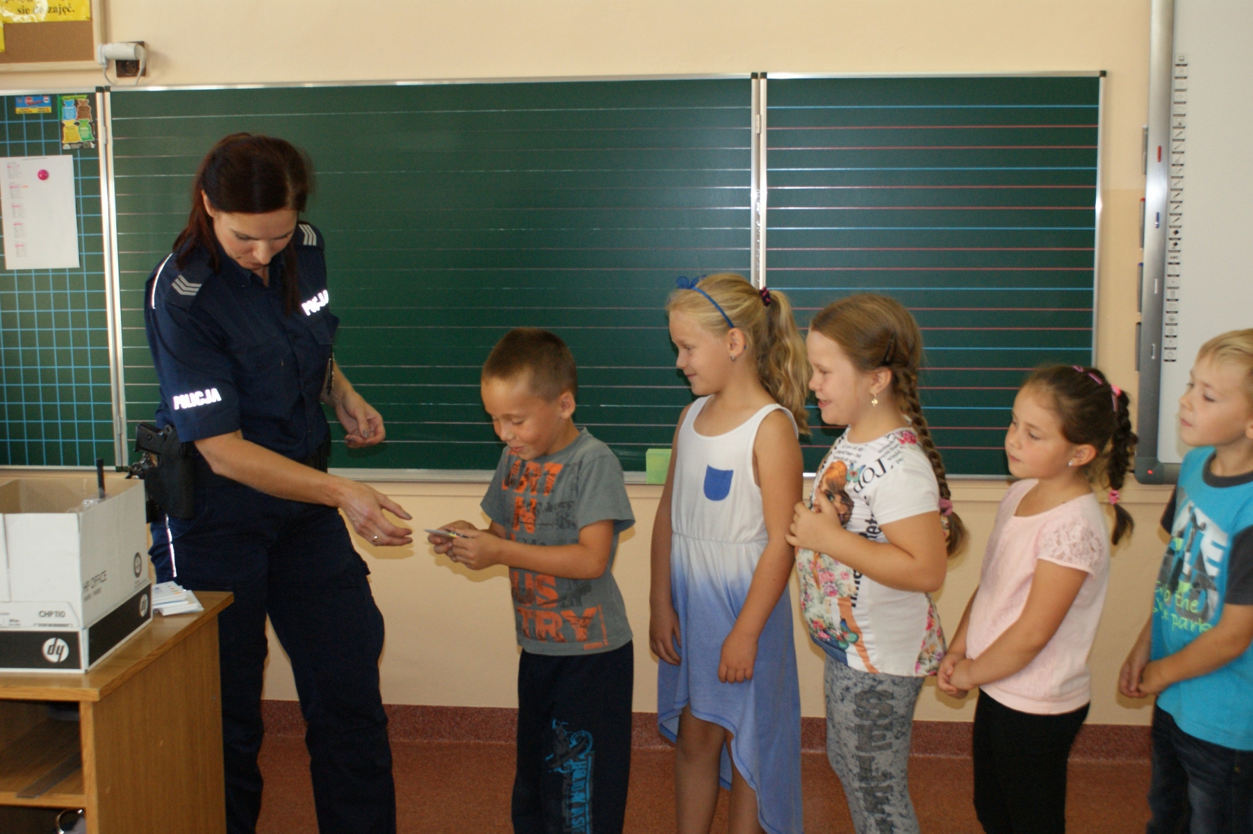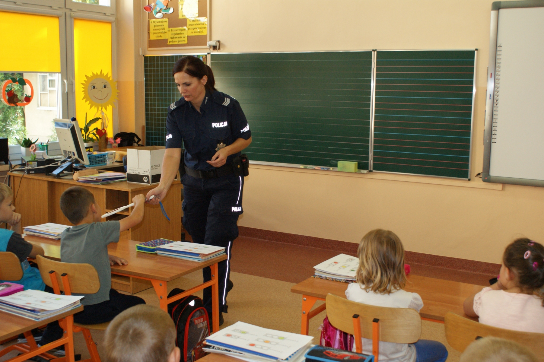 Tematem spotkania było utrwalenie z dziećmi zasad ruchu drogowego oraz przypomnienie zagadnień dotyczących bezpieczeństwa dzieci w szkole i w domu. Pani policjant przypomniała podstawowe zasady zachowania się podczas przechodzenia przez jezdnię i dojeżdżania autobusem do szkoły. Następnie wytłumaczyła, jak należy zachować się w kontaktach z obcymi ludźmi, nieznanymi psami, jak dbać o bezpieczeństwo własne i innych oraz do kogo zwracać się o pomoc w sytuacji zagrożenia. Pani policjant podkreśliła, jak ważną rolę pełnią elementy odblaskowe, które powinien posiadać każdy uczeń. Opowiedziała o pracy policjanta i jego atrybutach.