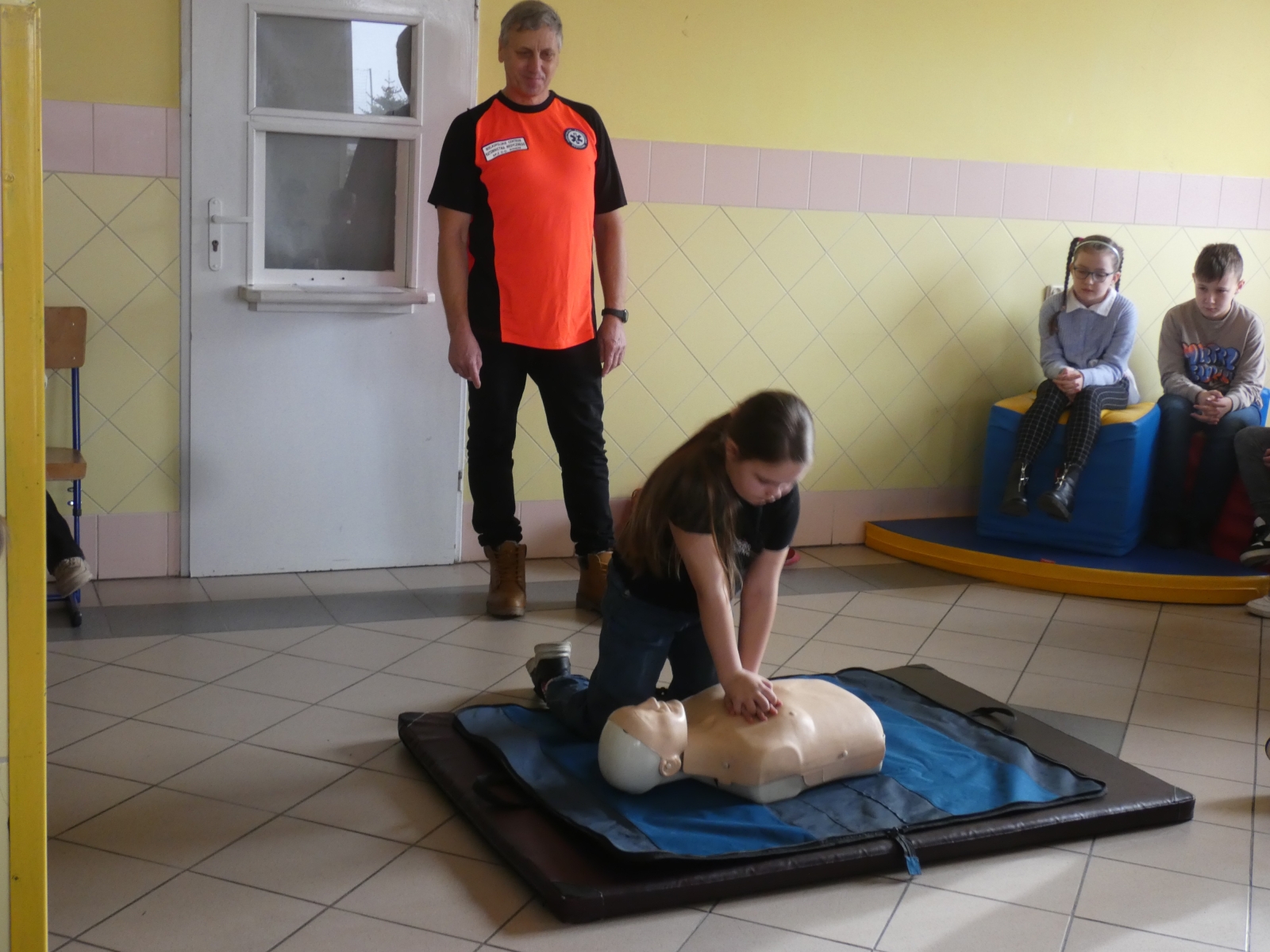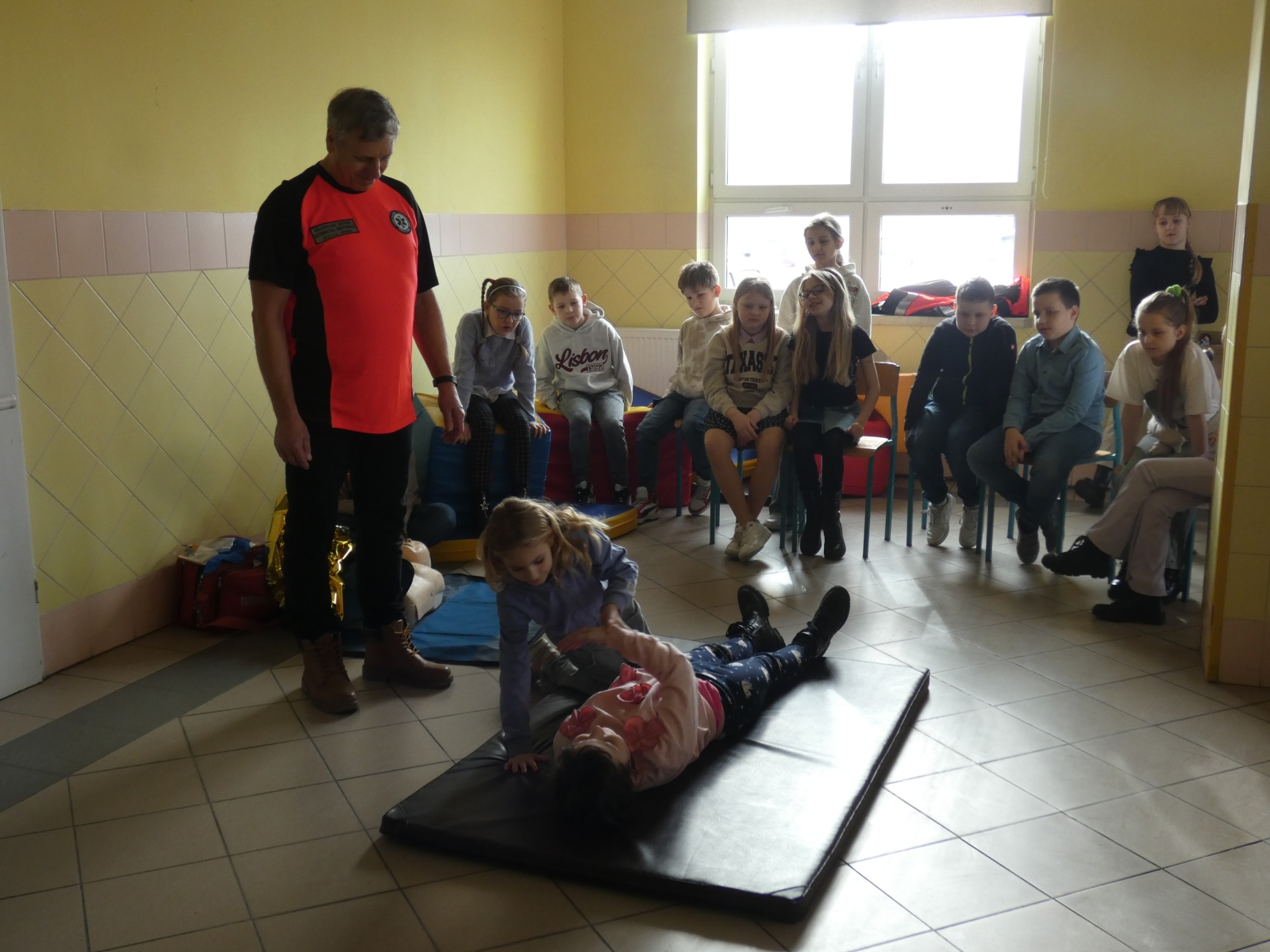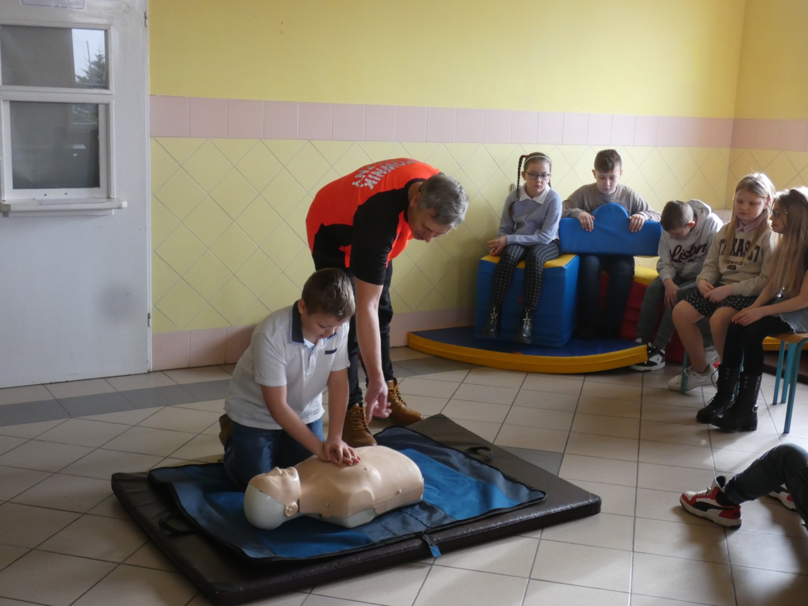 Na początku spotkania pan Andrzej sprawdził znajomość numerów alarmowych. Omówił kolejne etapy pomocy poszkodowanemu z utratą przytomności. Zaprezentował na fantomie jak trzeba sprawdzić przytomność, oddech poszkodowanego oraz jak jemu pomóc zanim przyjedzie zespół ratownictwa medycznego. Po omówieniu zasad udzielania pomocy każdy uczeń mógł wykonać uciśnięcia klatki piersiowej na fantomie osoby dorosłej. Dzieci mogły się naocznie przekonać, jak trudno jest uciskać osobę poszkodowaną. Kolejnym punktem spotkania było przećwiczenie pozycji bocznej ustalonej, czyli tzw. pozycji bezpiecznej. Pan ratownik wytłumaczył dzieciom jak to należy wykonać i w parach uczniowie ćwiczyli właściwe ułożenie poszkodowanego. Uczniowie dowiedzieli się również jak trudna jest praca ratownika medycznego.
