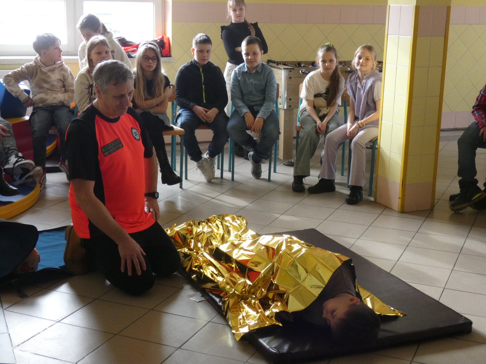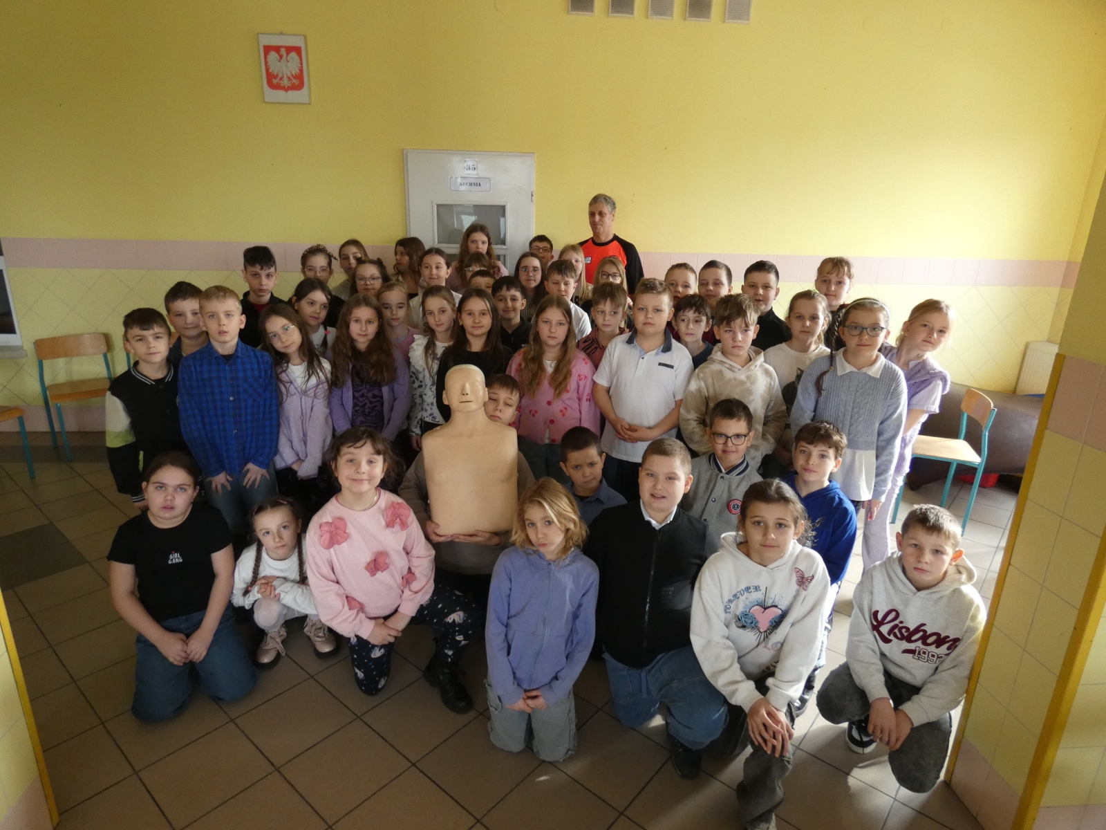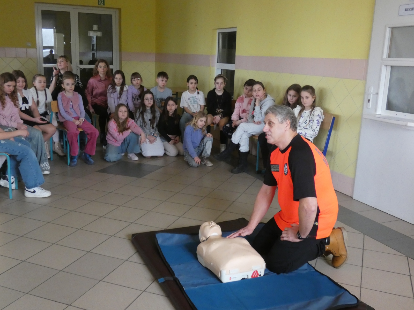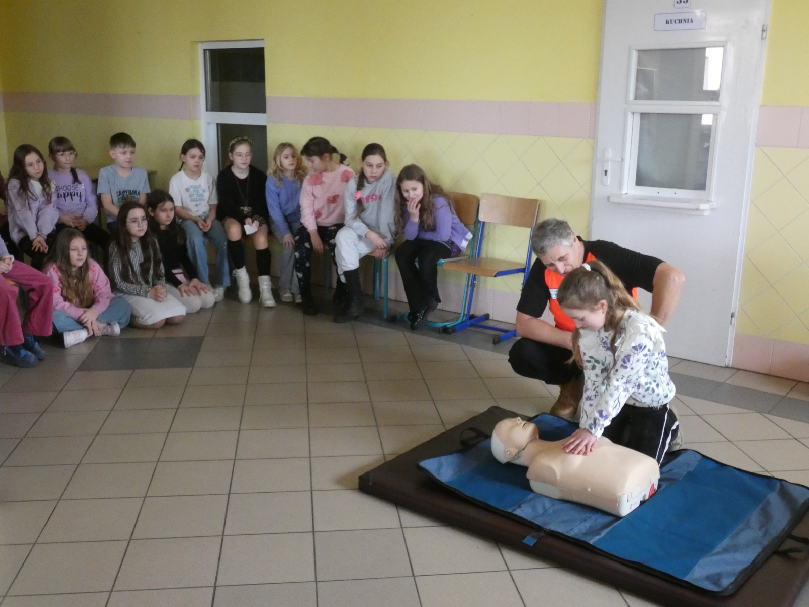 Na początku spotkania pan Andrzej sprawdził znajomość numerów alarmowych. Omówił kolejne etapy pomocy poszkodowanemu z utratą przytomności. Zaprezentował na fantomie jak trzeba sprawdzić przytomność, oddech poszkodowanego oraz jak jemu pomóc zanim przyjedzie zespół ratownictwa medycznego. Po omówieniu zasad udzielania pomocy każdy uczeń mógł wykonać uciśnięcia klatki piersiowej na fantomie osoby dorosłej. Dzieci mogły się naocznie przekonać, jak trudno jest uciskać osobę poszkodowaną. Kolejnym punktem spotkania było przećwiczenie pozycji bocznej ustalonej, czyli tzw. pozycji bezpiecznej. Pan ratownik wytłumaczył dzieciom jak to należy wykonać i w parach uczniowie ćwiczyli właściwe ułożenie poszkodowanego. Uczniowie dowiedzieli się również jak trudna jest praca ratownika medycznego.