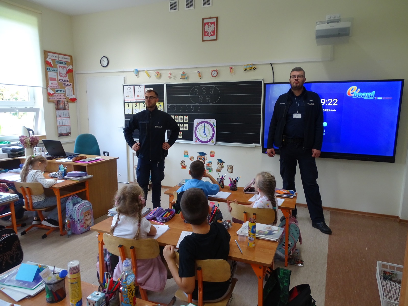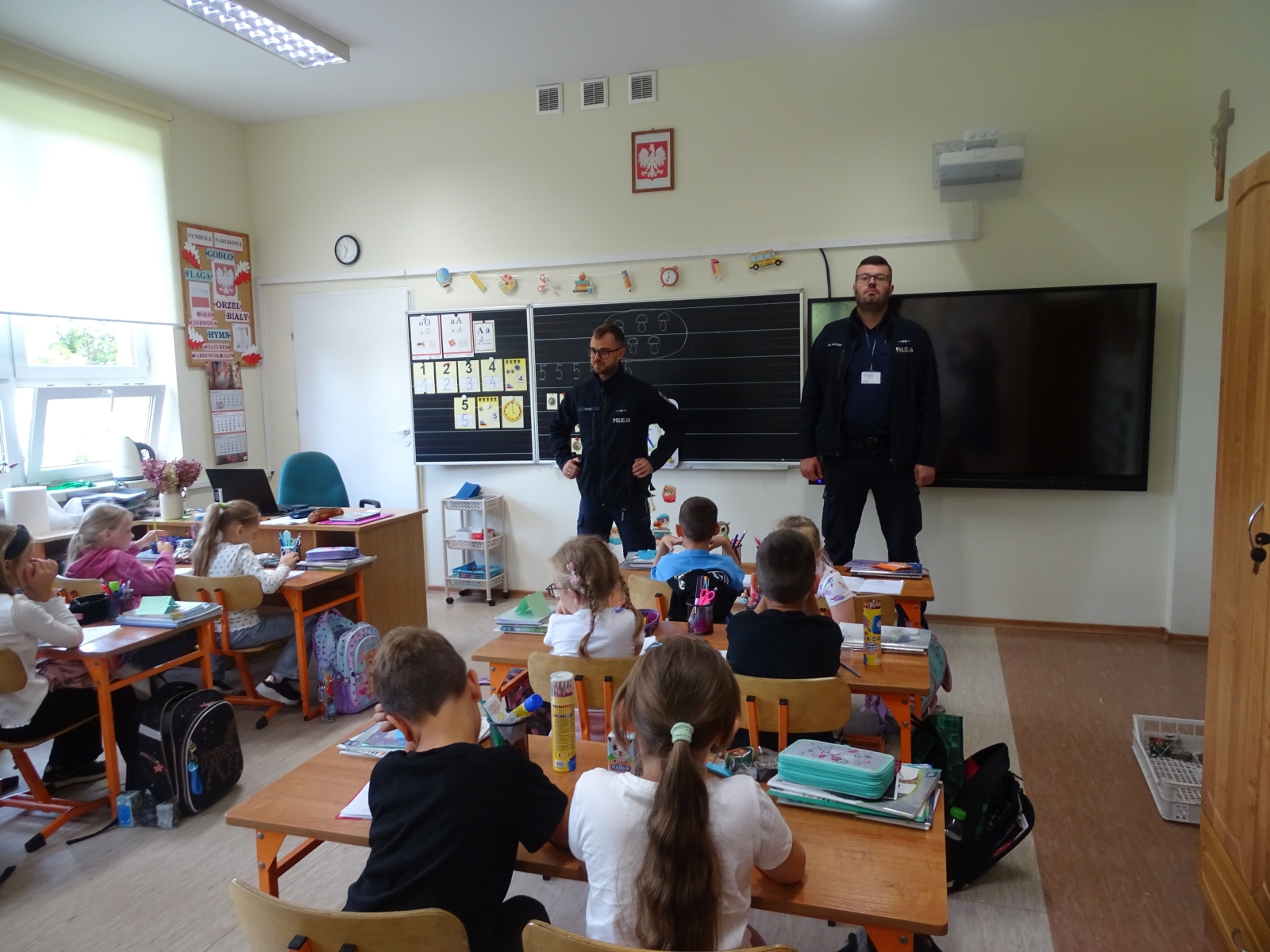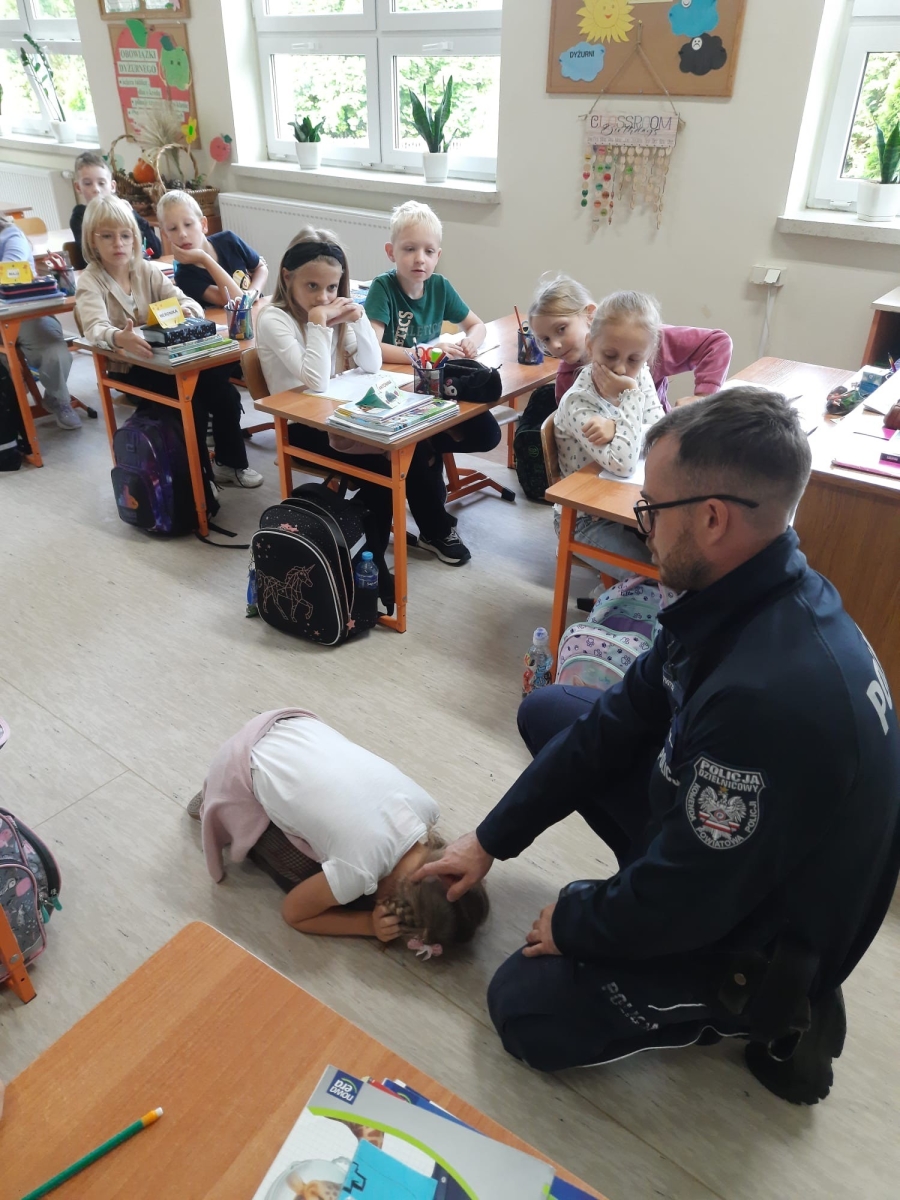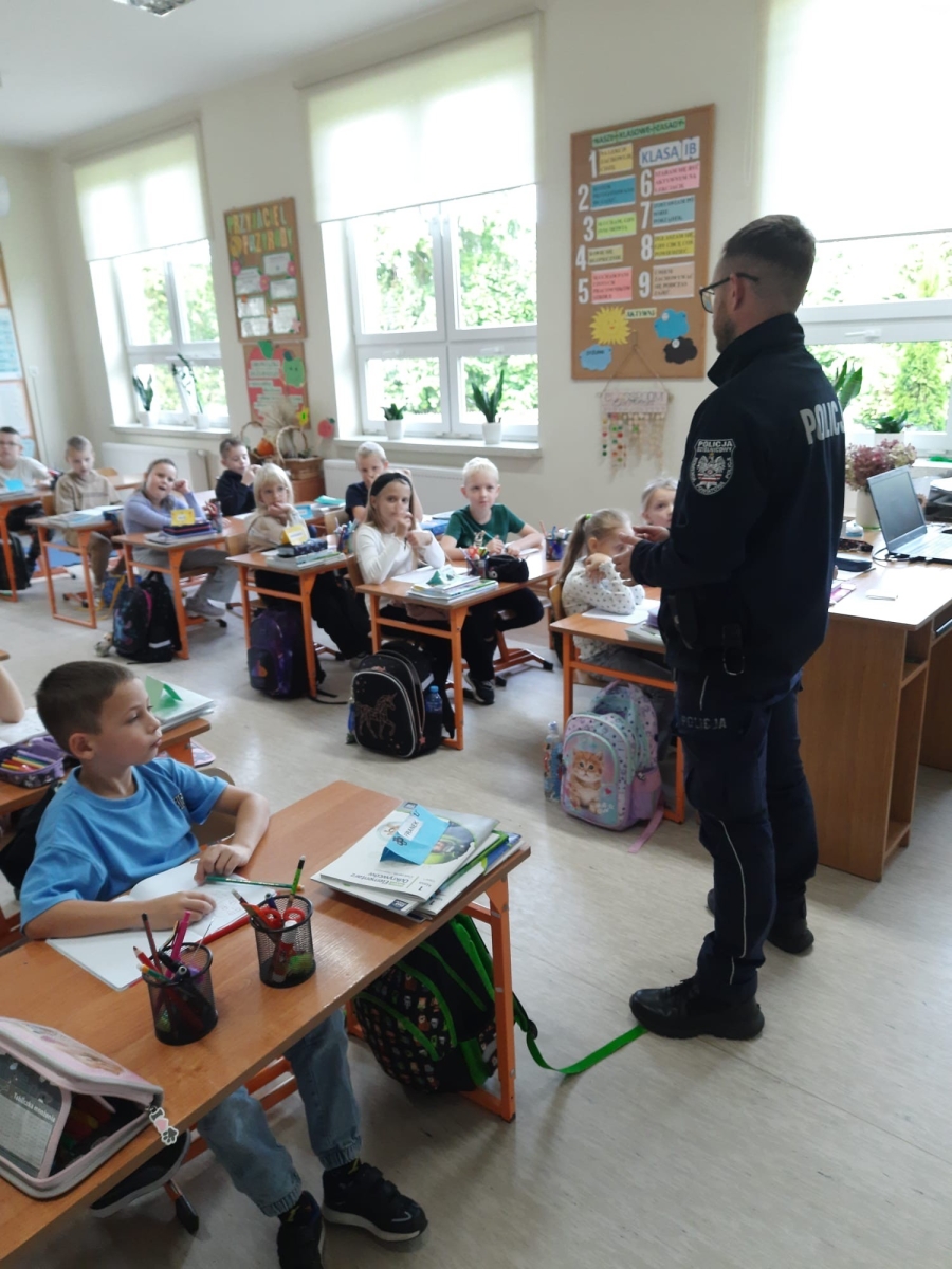 W dniu 23 września uczniowie klas pierwszych uczestniczyli w spotkaniu z policjantem. Naszych uczniów odwiedzili mł. asp. Michał Pękacz, dzielnicowy gminy Malanów oraz asp. Mariusz Spławski, dzielnicowy gminy Turek. Panowie policjanci omówili z dziećmi różne zasady dotyczące bezpieczeństwa. Jednym z tematów poruszonych na spotkaniu było zachowanie na drodze, możliwość korzystania z rowerów i hulajnóg oraz zasady bezpiecznego poruszania się i przechodzenia przez jezdnię. Dzieci dowiedziały się też jak się zachowywać w razie napotkania zwierząt, w szczególności nieznanych psów. Policjanci rozmawiali też z dziećmi o korzystaniu z telefonu i Internetu. Dzieci wykazały duże zainteresowanie spotkaniem i chętnie zadawały pytania panom policjantom.
