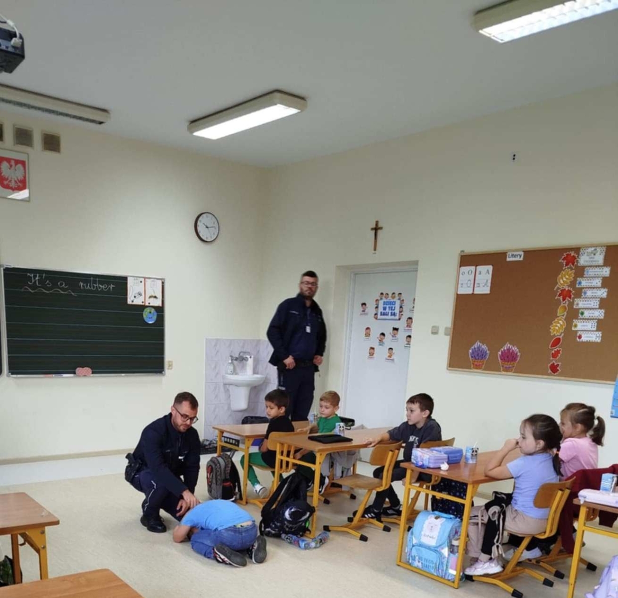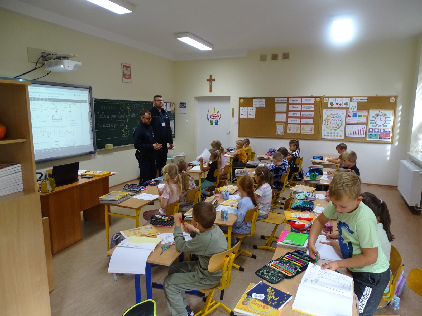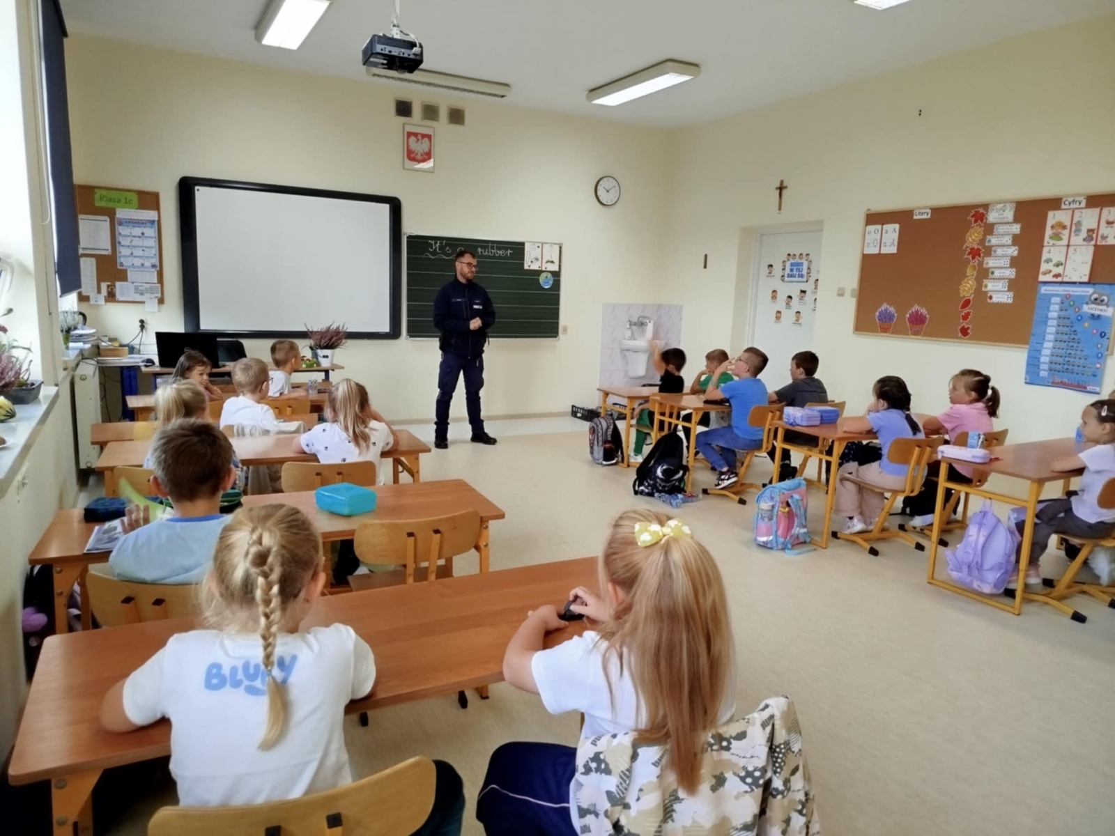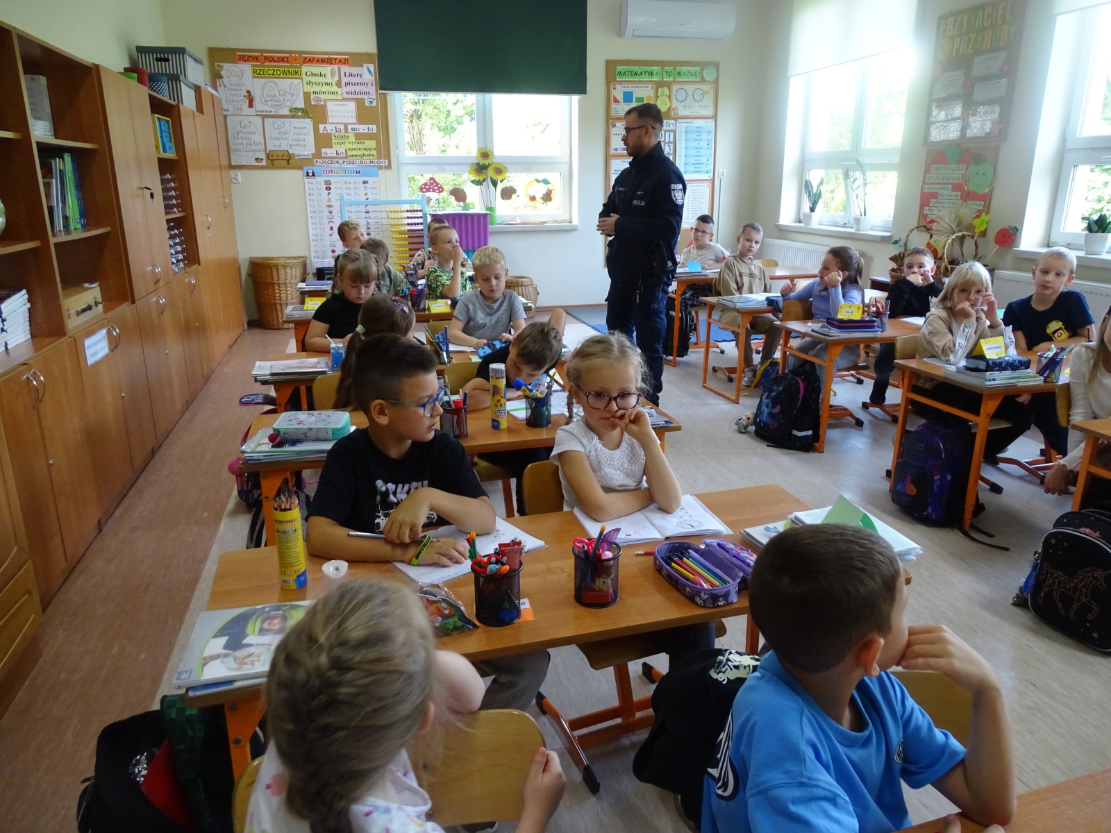 W dniu 23 września uczniowie klas pierwszych uczestniczyli w spotkaniu z policjantem. Naszych uczniów odwiedzili mł. asp. Michał Pękacz, dzielnicowy gminy Malanów oraz asp. Mariusz Spławski, dzielnicowy gminy Turek. Panowie policjanci omówili z dziećmi różne zasady dotyczące bezpieczeństwa. Jednym z tematów poruszonych na spotkaniu było zachowanie na drodze, możliwość korzystania z rowerów i hulajnóg oraz zasady bezpiecznego poruszania się i przechodzenia przez jezdnię. Dzieci dowiedziały się też jak się zachowywać w razie napotkania zwierząt, w szczególności nieznanych psów. Policjanci rozmawiali też z dziećmi o korzystaniu z telefonu i Internetu. Dzieci wykazały duże zainteresowanie spotkaniem i chętnie zadawały pytania panom policjantom.