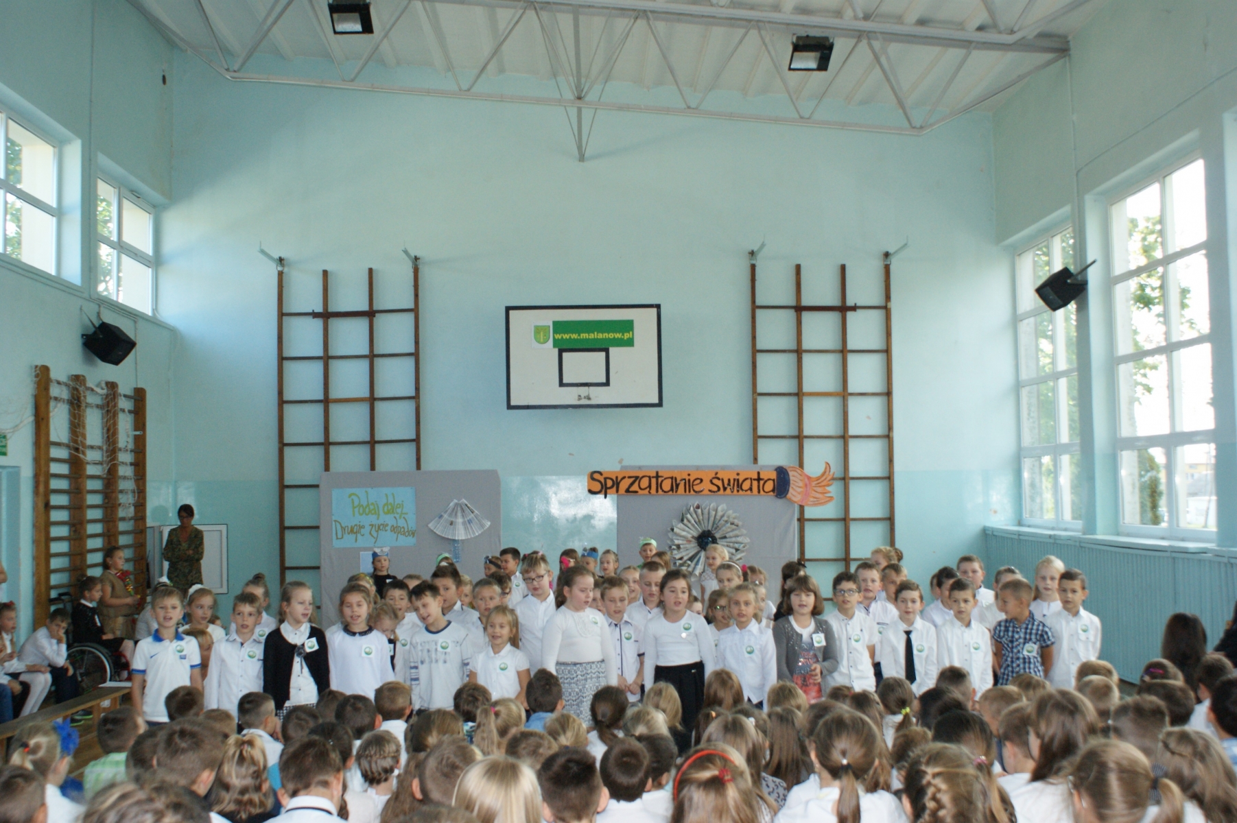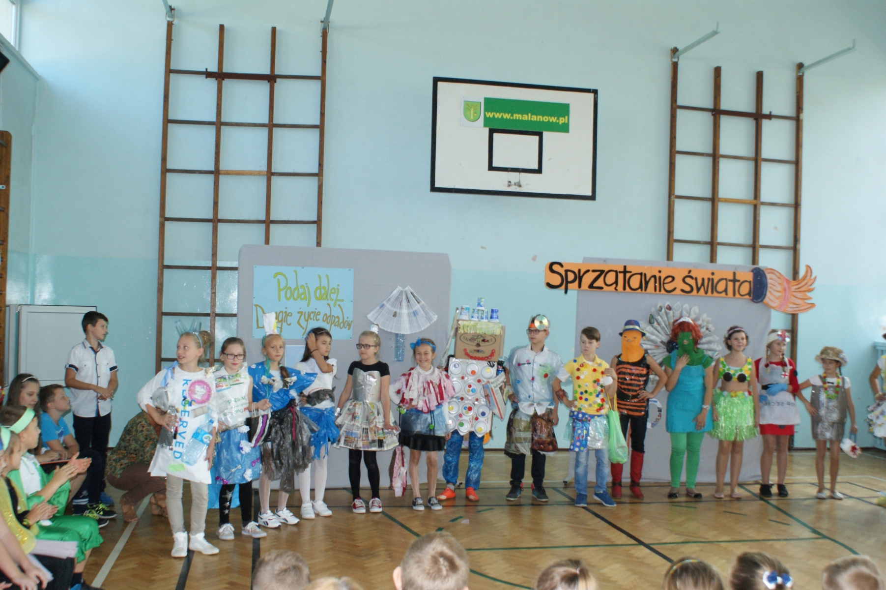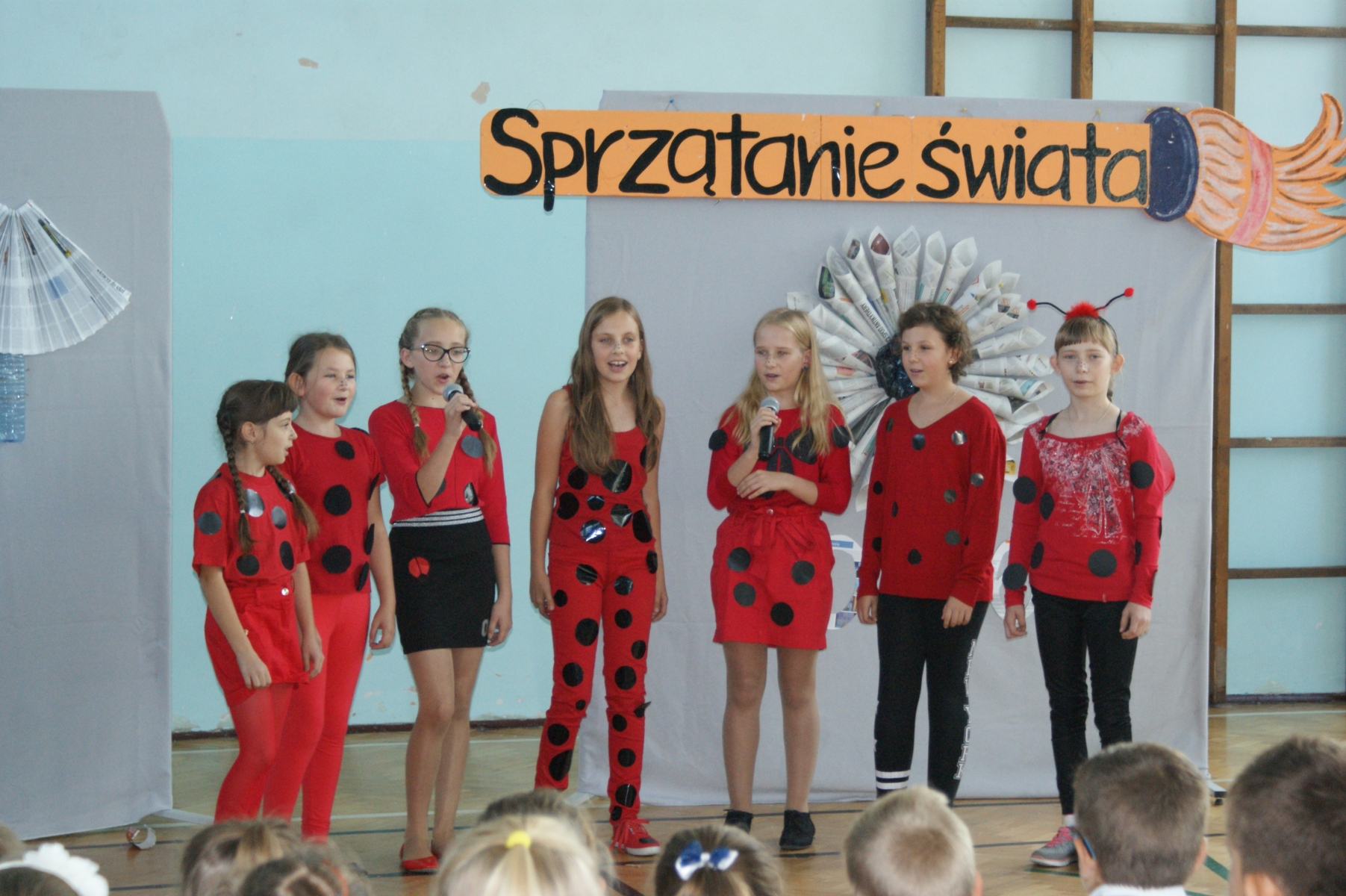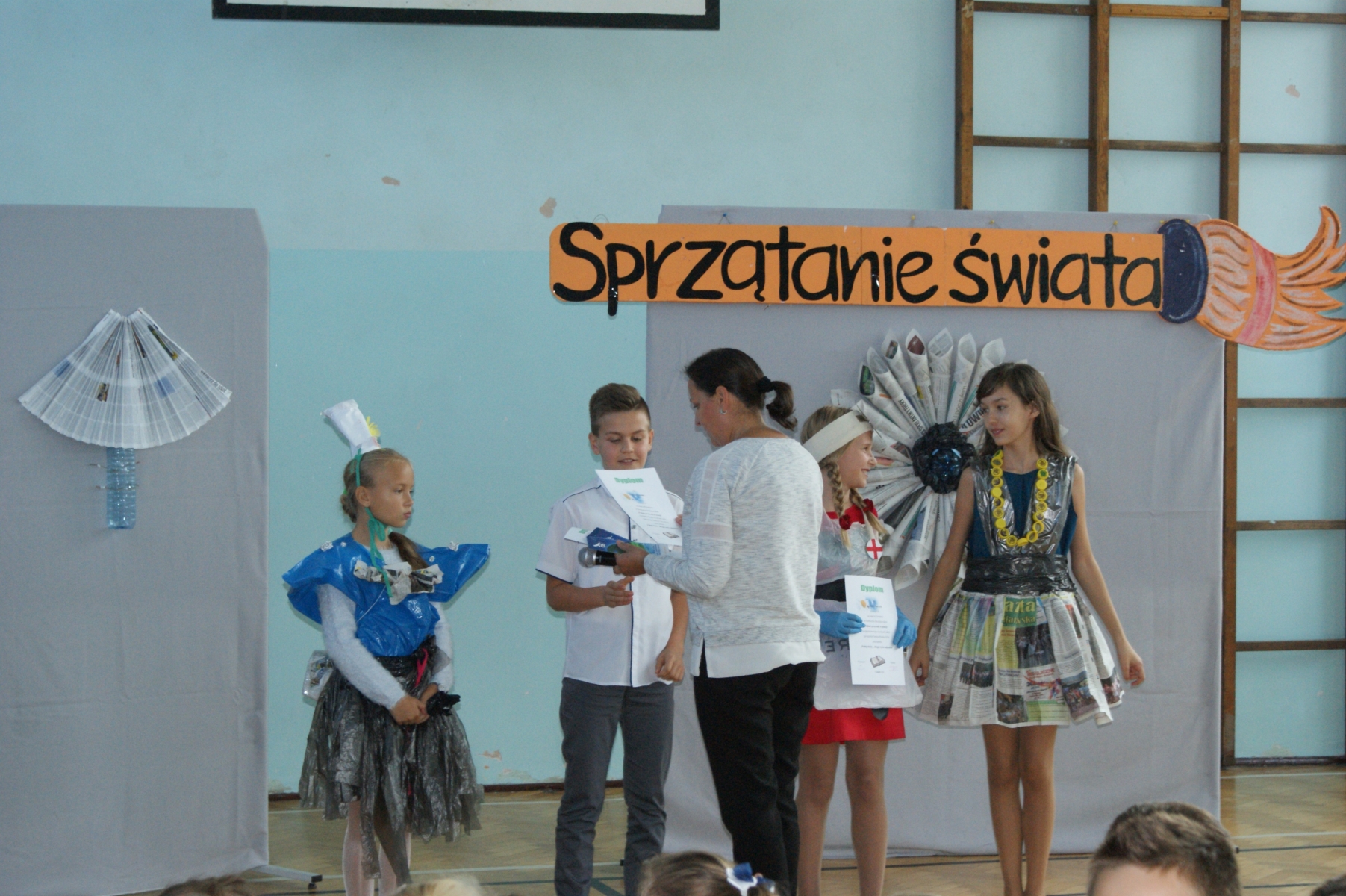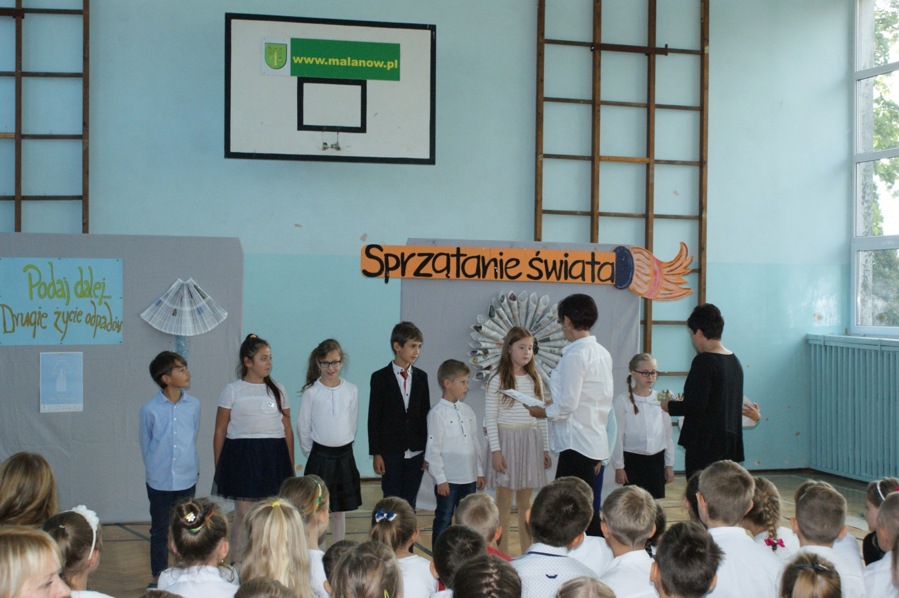 Podsumowanie akcji Sprzątanie Świata-Polska 2016 odbyło się podczas uroczystego apelu, którego oprawa artystyczna została przygotowana przez uczniów klasy IVa pod kierunkiem wychowawczyni Julity Muszalskiej oraz klasy trzecie pod kierunkiem wychowawczyń Ewy Stelmaszak, Marii Prentczyńskiej i Aleksandry Jasnowskiej. Uczniowie uświadomili nam, że wszyscy powinniśmy współuczestniczyć w działaniach podejmowanych dla środowiska.
