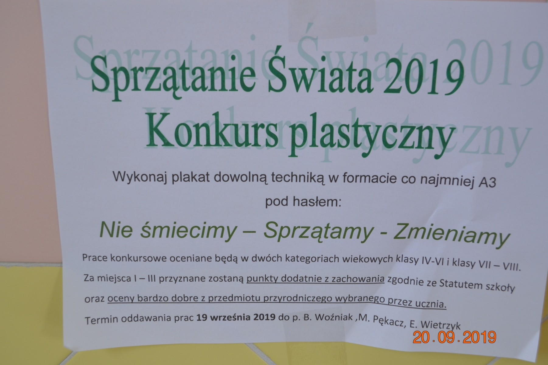 "Nie śmiecimy - sprzątamy - zmieniamy" - pod takim hasłem odbyła się tegoroczna akcja sprzątania świata. W ramach akcji uczniowie naszej szkoły wzięli udział w konkursie plastycznym zaś ich prace zostały zaprezentowane w formie wystawy szkolnej.
