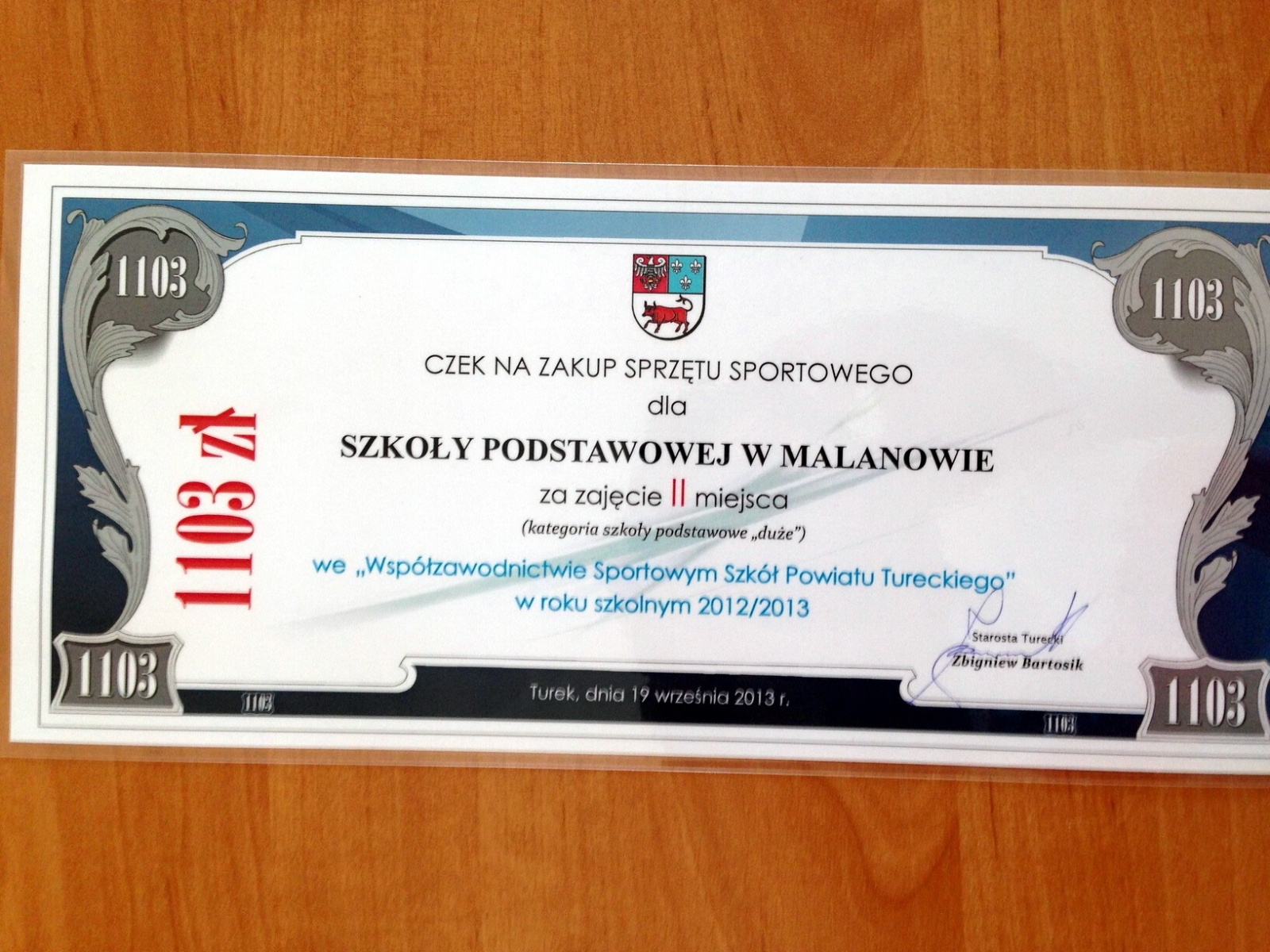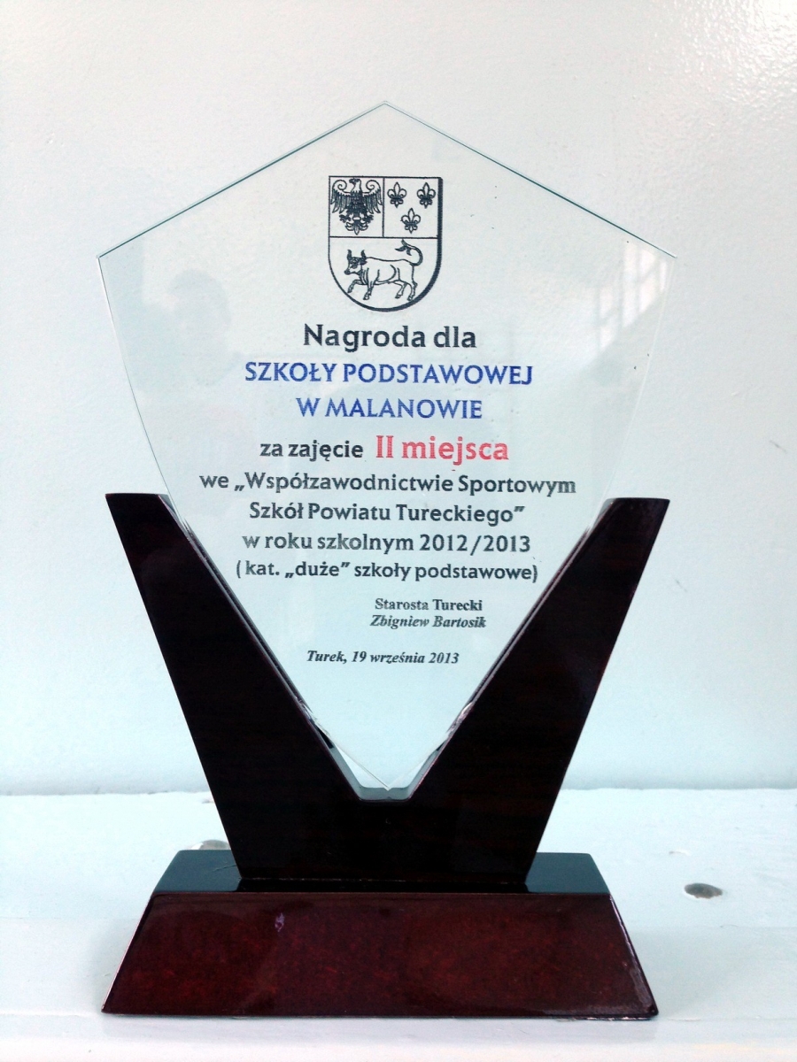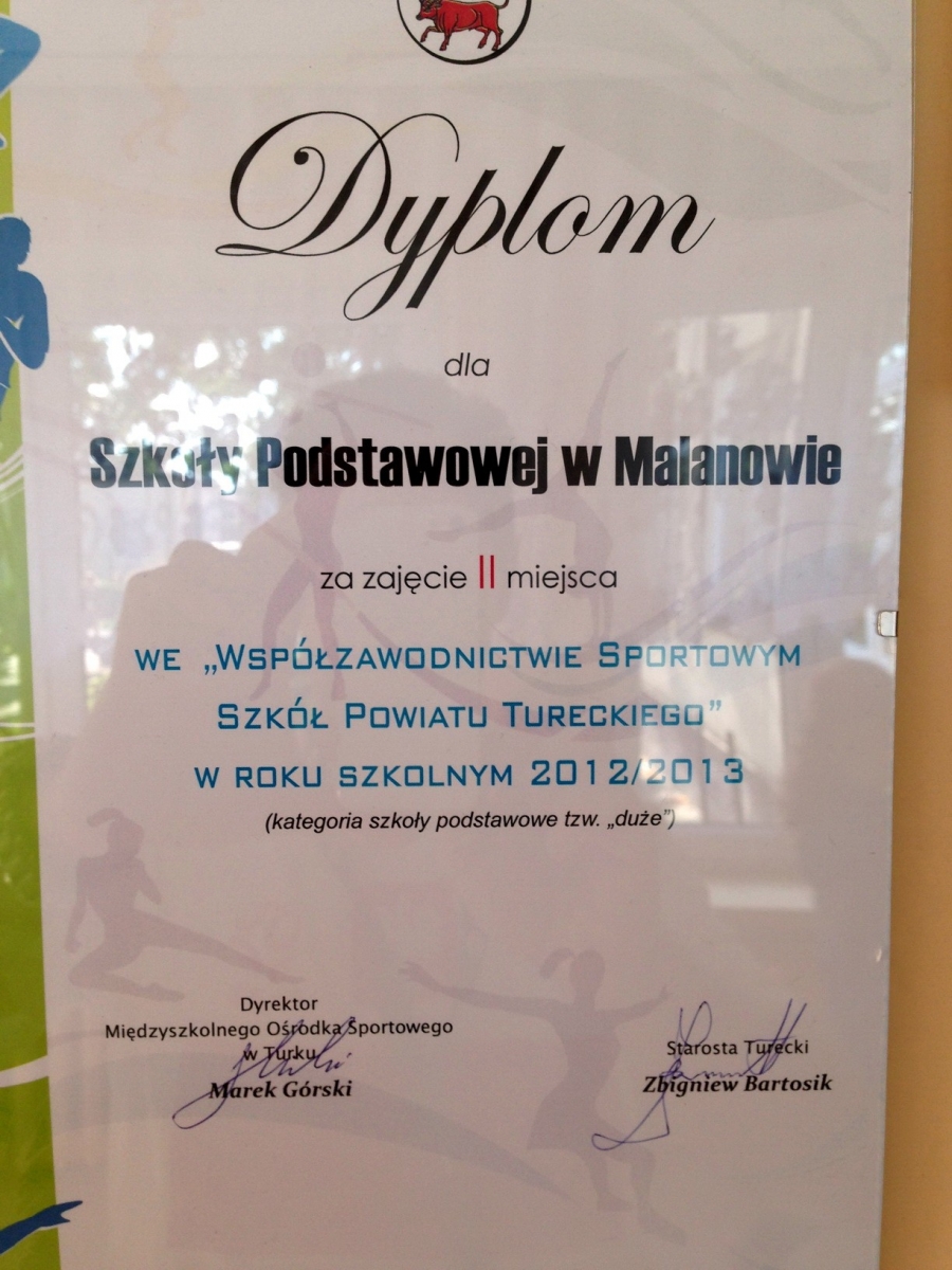 W dniu 19 września 2013 roku odbyło się podsumowanie współzawodnictwa sportowego powiatu tureckiego 2012/2013. Nasza szkoła zajęła bardzo wysokie drugie miejsce i uzyskała kwotę ponad tysiąc złotych na zakup sprzętu sportowego. Na takie wysokie miejsce miał wpływ udział naszej młodzieży w prawie wszystkich zawodach sportowych organizowanych przez MOS Turek. Sam udział nie wystarczy by osiągnąć takie prestiżowe miejsce, zostawiając za sobą takie „potęgi” jak SP 5 Turek czy SP 4 Turek musieliśmy często wygrywać , lub stawać na niższych szczeblach podium. To ogromne zaangażowanie i ciężka praca naszych uczniów dała ten świetny wynik . Mam nadzieję, iż taka wysoka lokata wpłynie pozytywnie mobilizując do dalszej pracy naszych wychowanków.