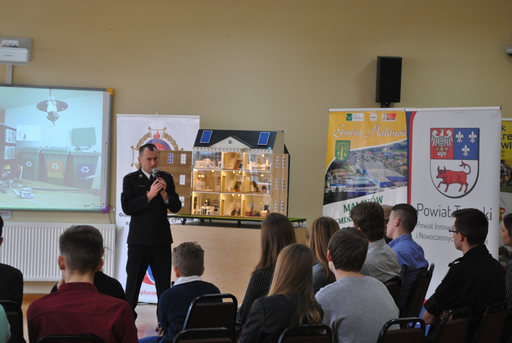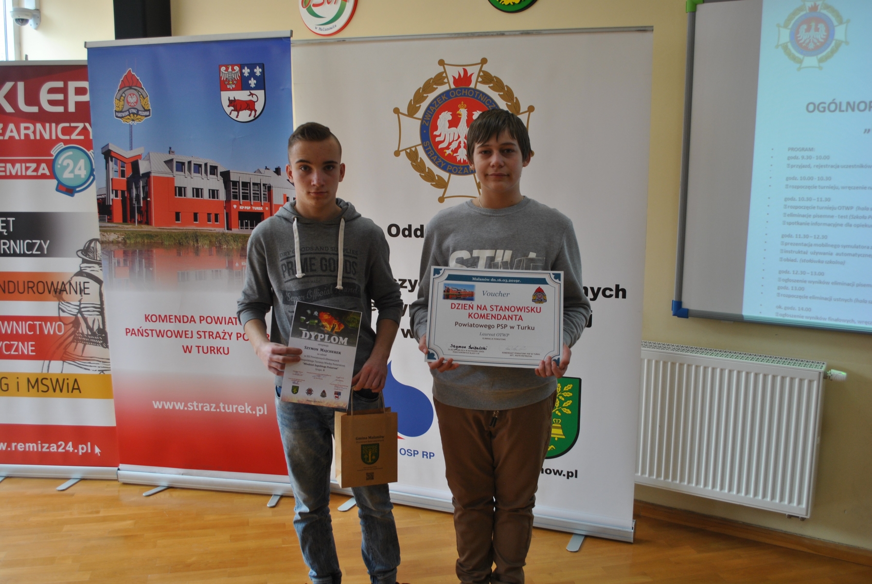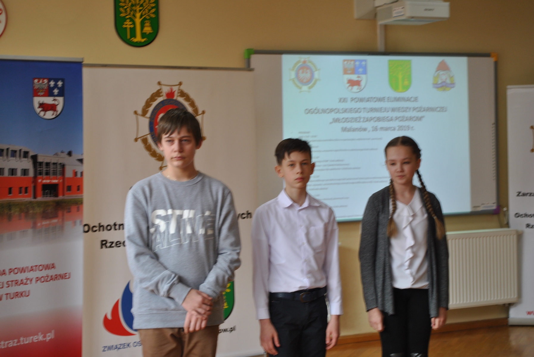 W sobotę 16 marca 2019r. w Malanowie odbyły się powiatowe eliminacje Ogólnopolskiego Turnieju Wiedzy Pożarniczej "Młodzież zapobiega pożarom". W turnieju wzięli udział zwycięzcy gminnych eliminacji ze szkół podstawowych, gimnazjów i szkół średnich z powiatu tureckiego. Szkołę Podstawową w Malanowie reprezentowali: Szymon Świtalski - uczeń klasy VI i Szymon Majcherek - uczeń klasy VIII. Uczestnicy rozwiązywali test składający się z 30 pytań. Po podsumowaniu punktacji z części pisemnej wyłoniono troje uczestników, którzy przystąpili do części ustnej konkursu. Do tego etapu zakwalifikował się Szymon Świtalski. Okazało się, że Szymon zajął I miejsce. Bedzie on reprezentował naszą szkołę i powiat w eliminacjach wojewódzkich, które odbędą się 27 kwietnia 2019r. w Koninie.