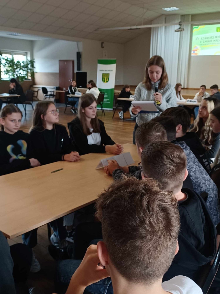 W konkursowej rywalizacji uczniowie odpowiadali na pytania dotyczące historii gminy, geografii, przyrody, życia kulturalnego, społecznego i gospodarczego. Pozostali uczniowie dopingowali swoją drużynę oraz zmagali się odpowiedziami na pytania otwarte. Wszyscy zawodnicy konkursu wykazali się dużą wiedzą o naszej gminie. Po podsumowaniu ostatecznej punktacji reprezentacja z klasy VII a zdobyła największą liczbę punktów i zajęła I miejsce. Drużyna z klasy VII b uplasowała się na miejscu IV.