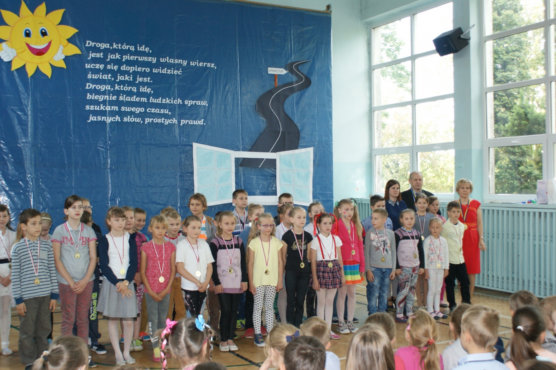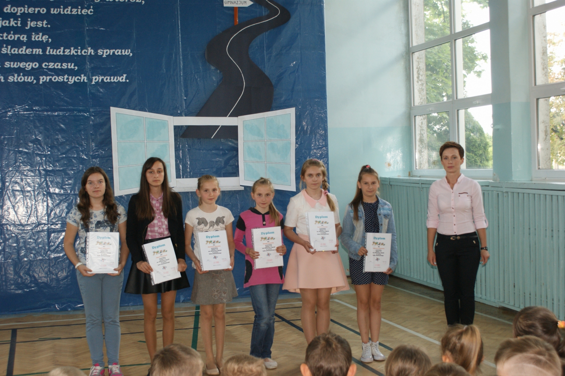Następnie Pani Dyrektor – Urszula Kamińska przedstawiła wyniki Ogólnopolskiego Konkursu Historycznego OLIMPUS. Pani Justyna Pietrzak podsumowała wyniki Ogólnopolskiego Konkursu „Zuch” i „Logicznego Myślenia”. Pani Julita Muszalska wręczyła dyplomy konkursu wiedzy na temat ekologii i ochrony środowiska – EKOTEST.