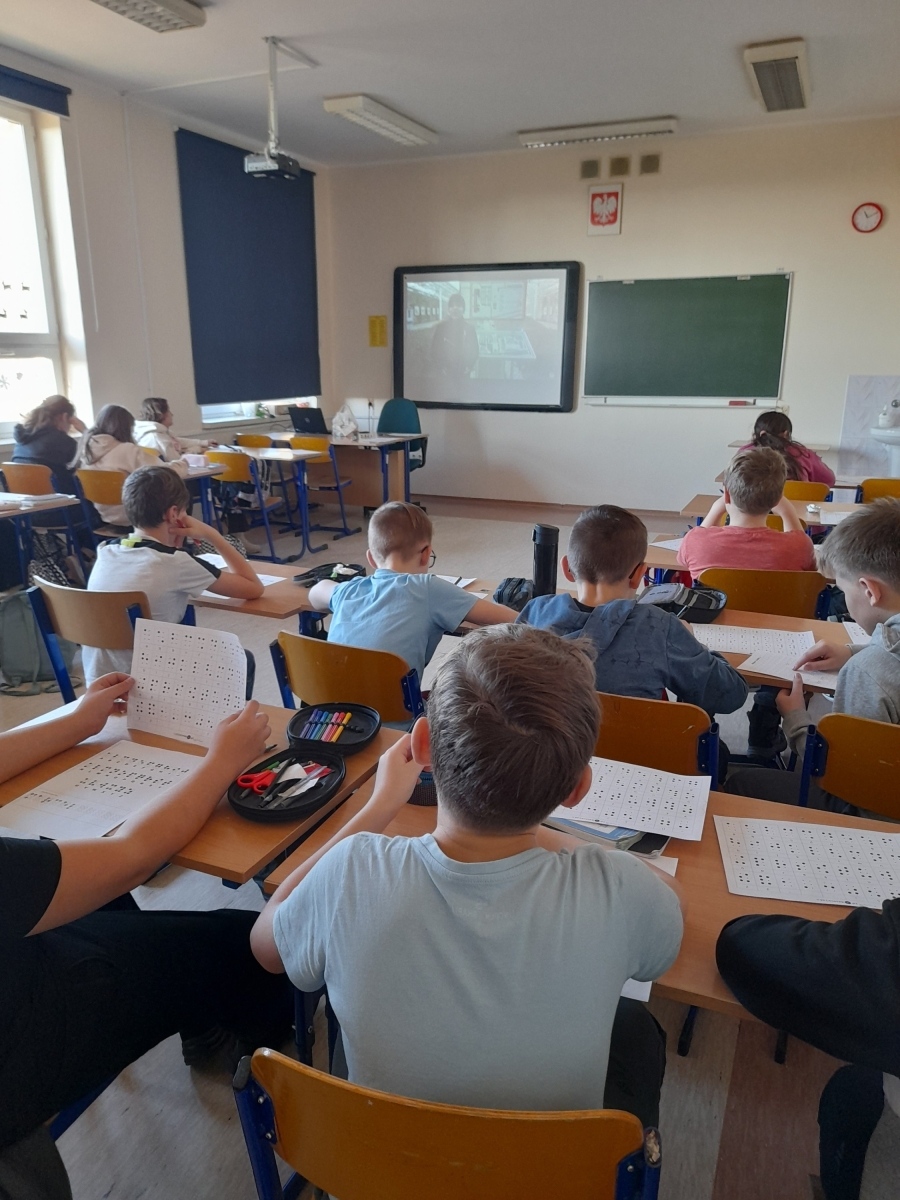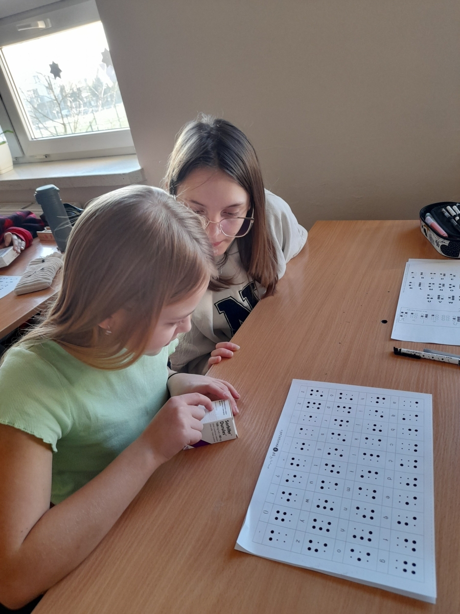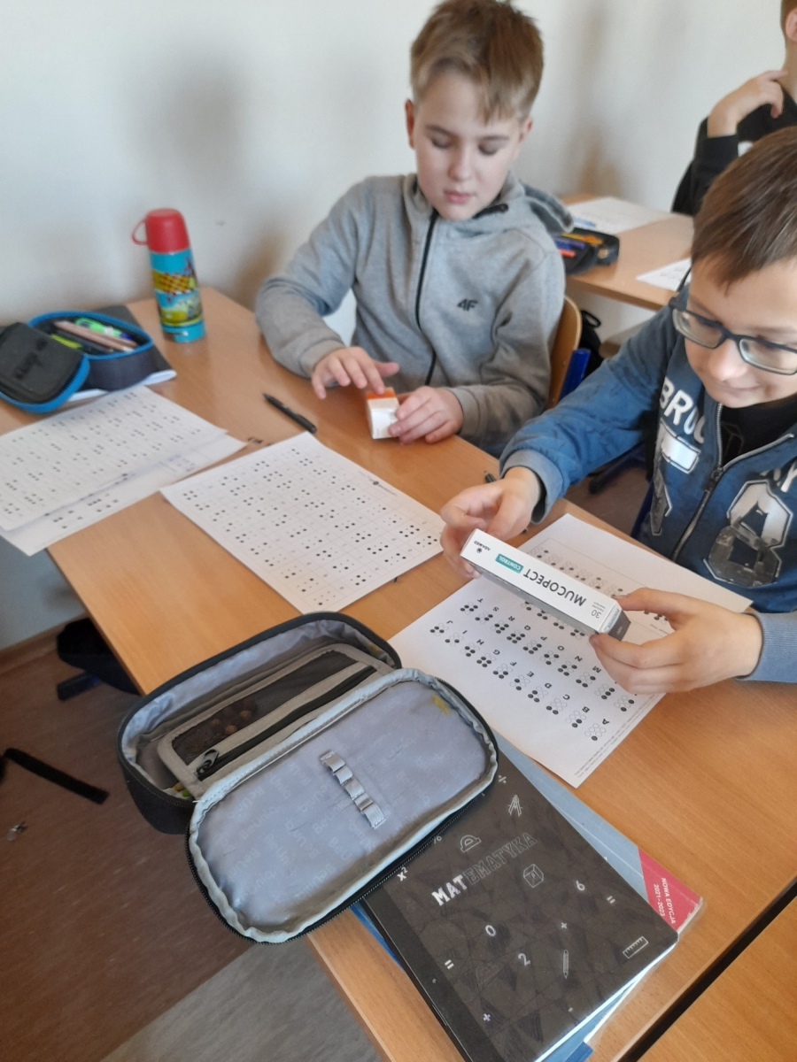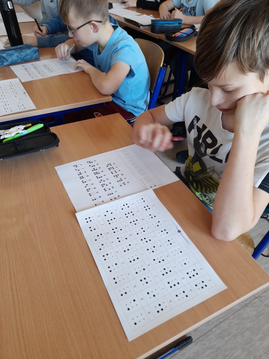 W związku z obchodami Światowego Dnia Braille’a, 9 stycznia, uczniowie klasy 5b uczestniczyli w lekcji, podczas której poznali specyfikę alfabetu, obejrzeli krótki film o jego twórcy, a także w sposób praktyczny wykorzystali zdobyte informacje, pisząc alfabetem Baraille’a swoje imię i podane zdanie. Mieli również za zadanie „odczytanie” nazwy leku zapisanej alfabetem Braille,a. Uczestnicy lekcji zgodnie przyznali, że „czytanie brajla” nie jest zadaniem łatwym.