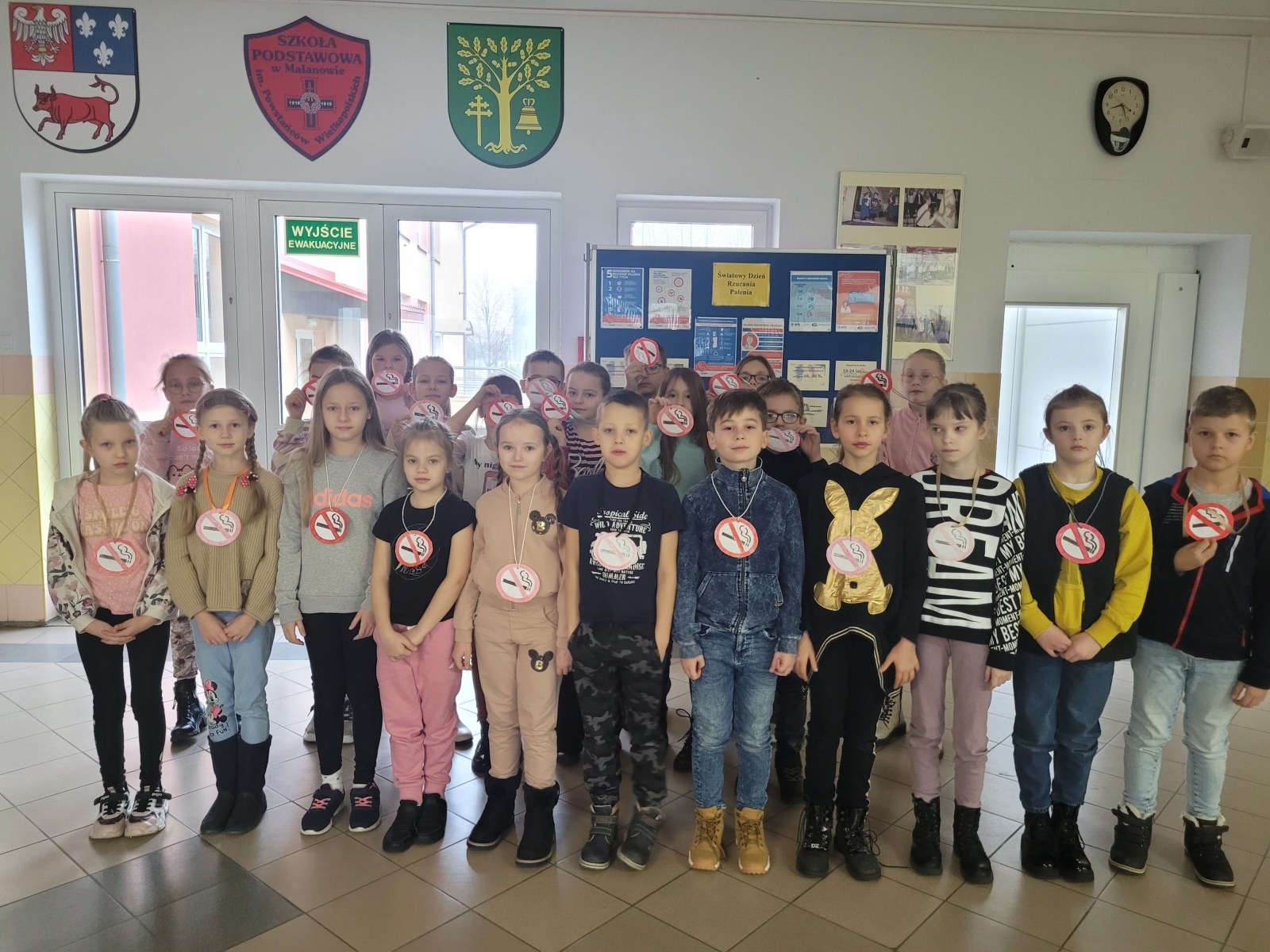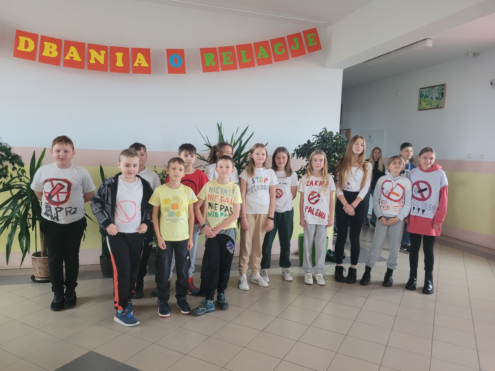 W tym roku Światowy Dzień Rzucania Palenia obchodzony był w naszej szkole inaczej niż zazwyczaj. Uczniowie klas 4 – 8 mieli za zadanie przygotować w domu koszulki z hasłami, symbolami, rysunkami nawiązującymi do życia bez papierosów, które następnie prezentowali na sobie. Z kolei uczniowie klas I – III wykonali znaczki dotyczące zakazu palenia. Na szkolnym „telebimie”, podczas lekcji i przerw wyświetlana była prezentacja na temat mitów i faktów związanych z paleniem papierosów i e - papierosów oraz ich wpływu na zdrowie człowieka.