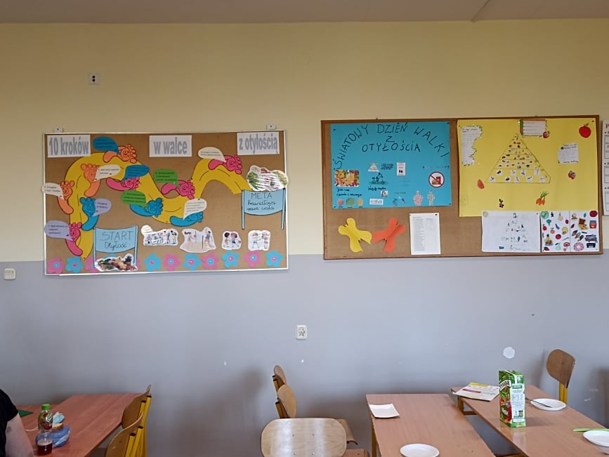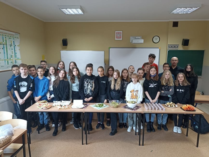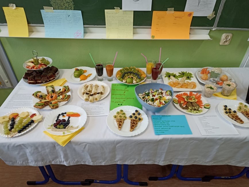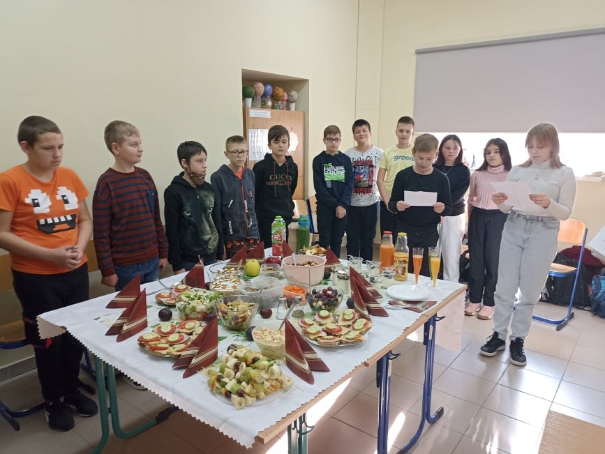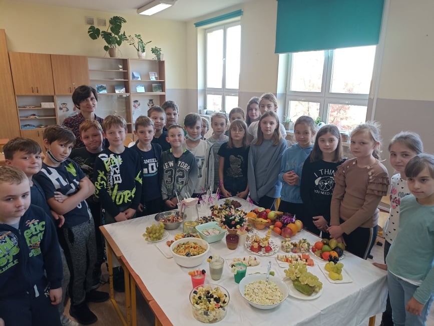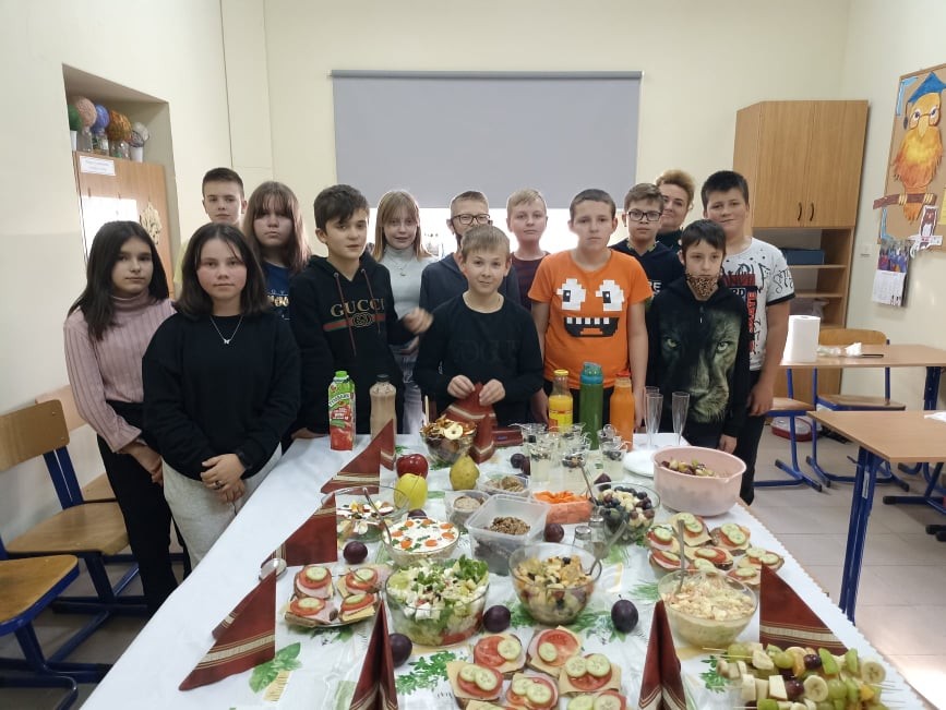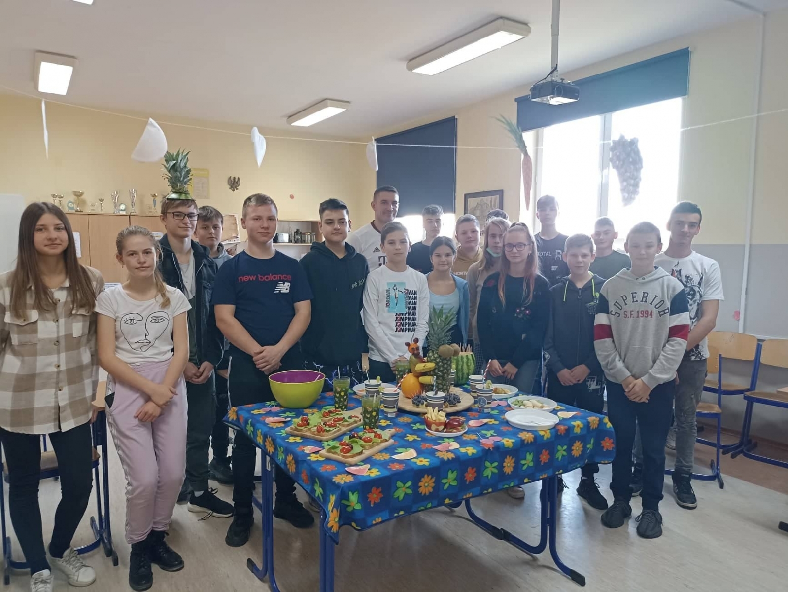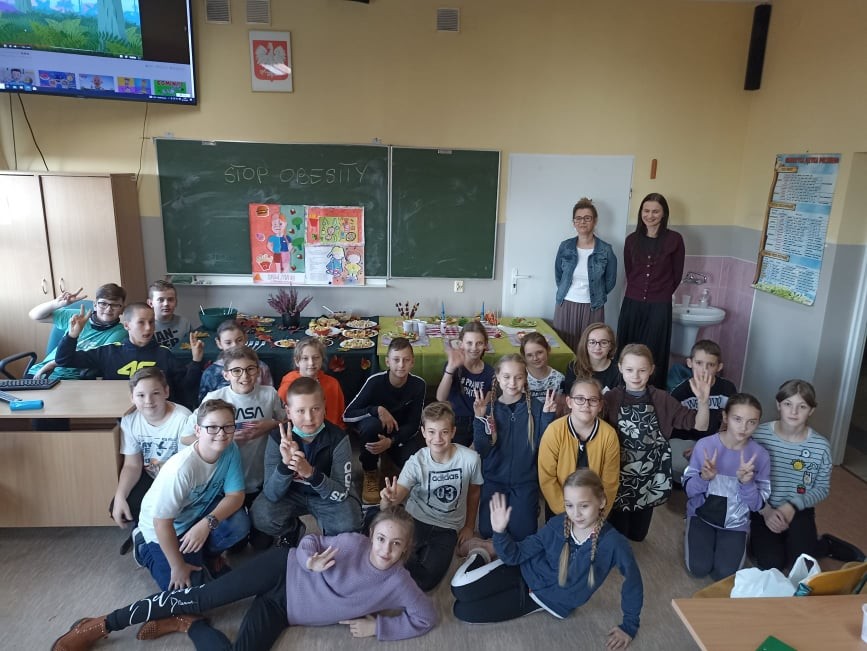 Dnia 28 października, w związku z realizacją programu edukacyjnego „Trzymaj Formę” oraz przypadającym 24 października Światowym Dniem Walki z Otyłością, w naszej szkole odbyła się impreza profilaktyczna, której celem było kształtowanie nawyków prozdrowotnych wśród dzieci i młodzieży, a przede wszystkim promocja zdrowegoi aktywnego stylu życia. W imprezie uczestniczyli uczniowie klas4-8 wrazz nauczycielami.Początek imprezy otworzył międzyklasowy konkurs na zdrowe przekąski, podczas którego nasi uczniowie wykazali się dużą kreatywnością i przedstawili bardzo ciekawe propozycje zdrowych przysmaków. Całość oceniało jury w składzie: Karolina Niespodziańska, Małgorzata Cieślak, Karolina Gałężewska.Uczniowie oceniani byliw czterech kategoriach: kreatywność, estetyka wykonania przekąski, dekoracja stołu, gazetka oraz omówienie potrawy pod względem wartości odżywczych. Po ciężkich naradach jury wyłoniło zwycięskie klasy: klasa IVa, Va, VI, VIIb, VIIIb.Jednak ze względu na to, że rywalizacja była bardzo wyrównana, wszystkie klasy zasłużyły na nagrodę.