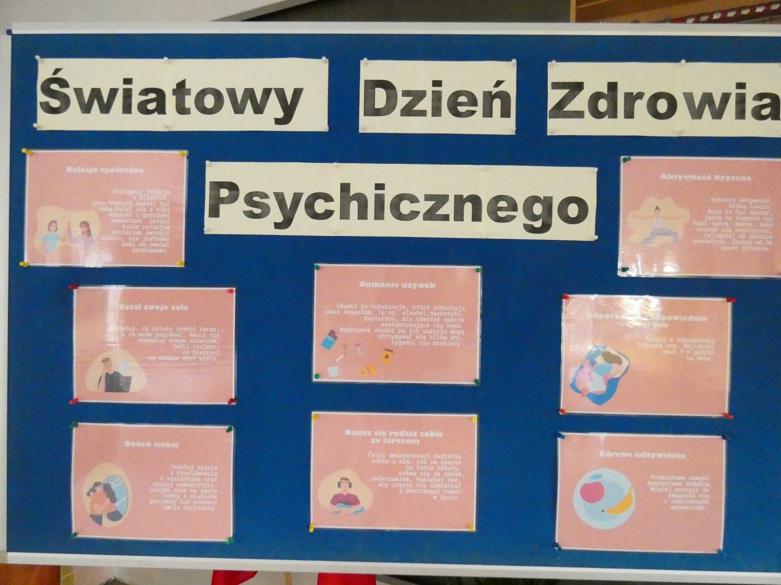 Do prawidłowego rozwoju dziecko potrzebuje w swoim życiu nie tylko działania, lecz również wyciszenia-czasu dla siebie, żeby pomyśleć, odpocząć, zregenerować siły. Odpowiednie odprężenie przywraca wewnętrzną równowagę, pozwala na uspokojenie organizmu, wyciszenie układu nerwowego, synchronizuje pracę mózgu, rozwija świadomość ciała i świadomość własnego stanu emocjonalnego. W związku z powyższym dnia 10 października, w naszej szkole w ramach obchodów „Światowego Dnia Zdrowia Psychicznego” oraz kontynuacji projektu: „Każdy inny- wszyscy równi” uczniowie uczestniczyli w relaksacyjnych przerwach. Relaksacje odbywały się w specjalnie przygotowanym pomieszczeniu w atmosferze spokoju i ciszy, z wykorzystaniem metod opartych na działalności praktycznej uczniów. Nasi uczniowie mieli także możliwość zapoznania się wskazówki dotyczącymi dbania o zdrowie psychiczne, które znalazły się na gazetce szkolnej.