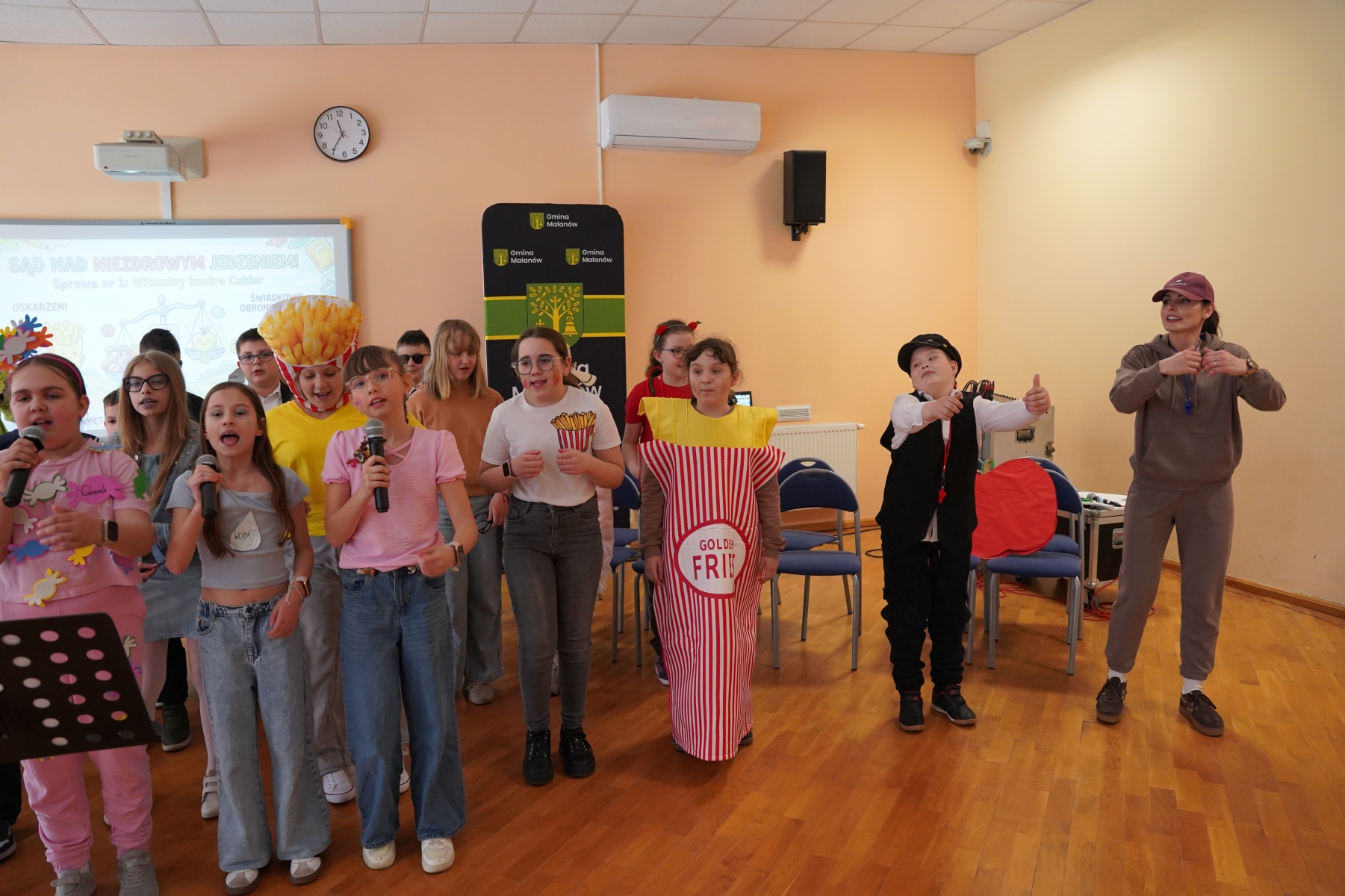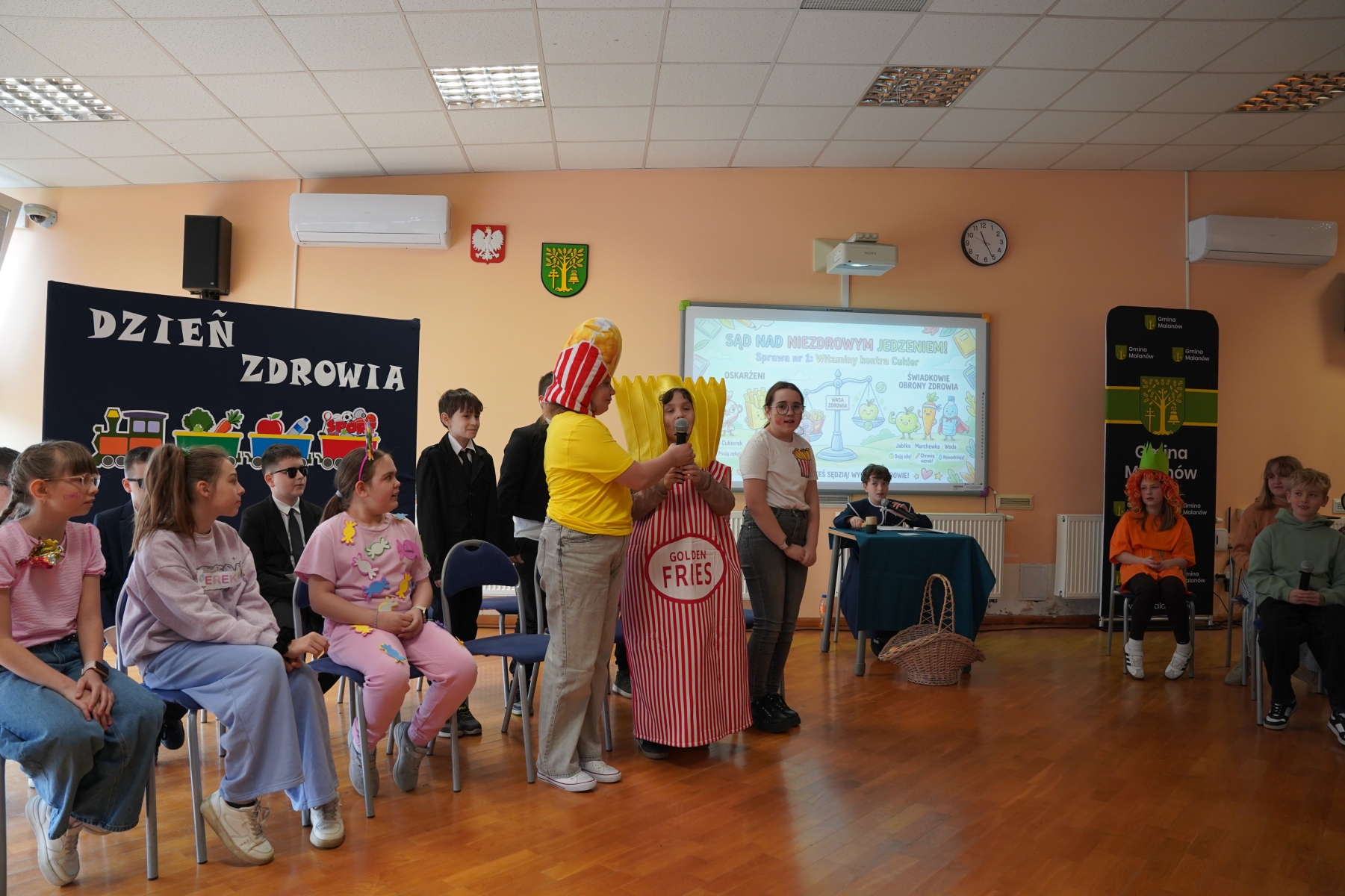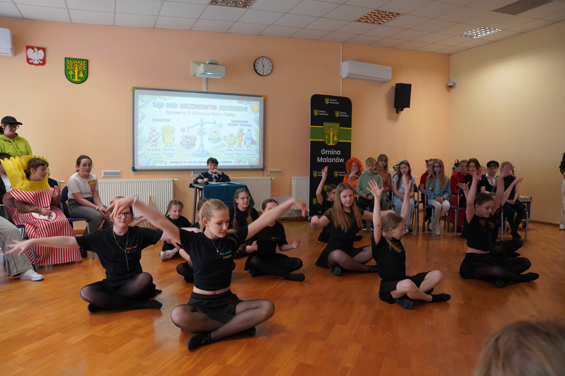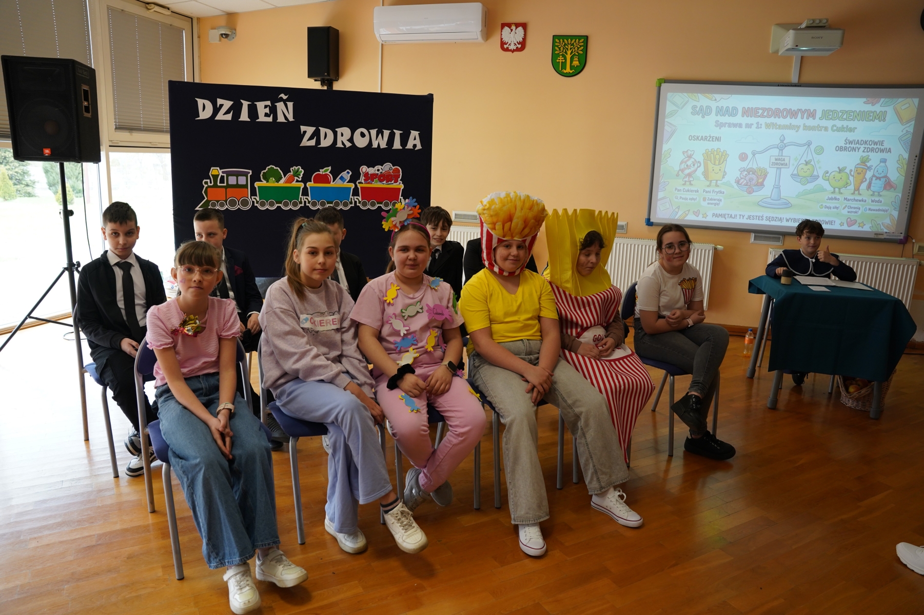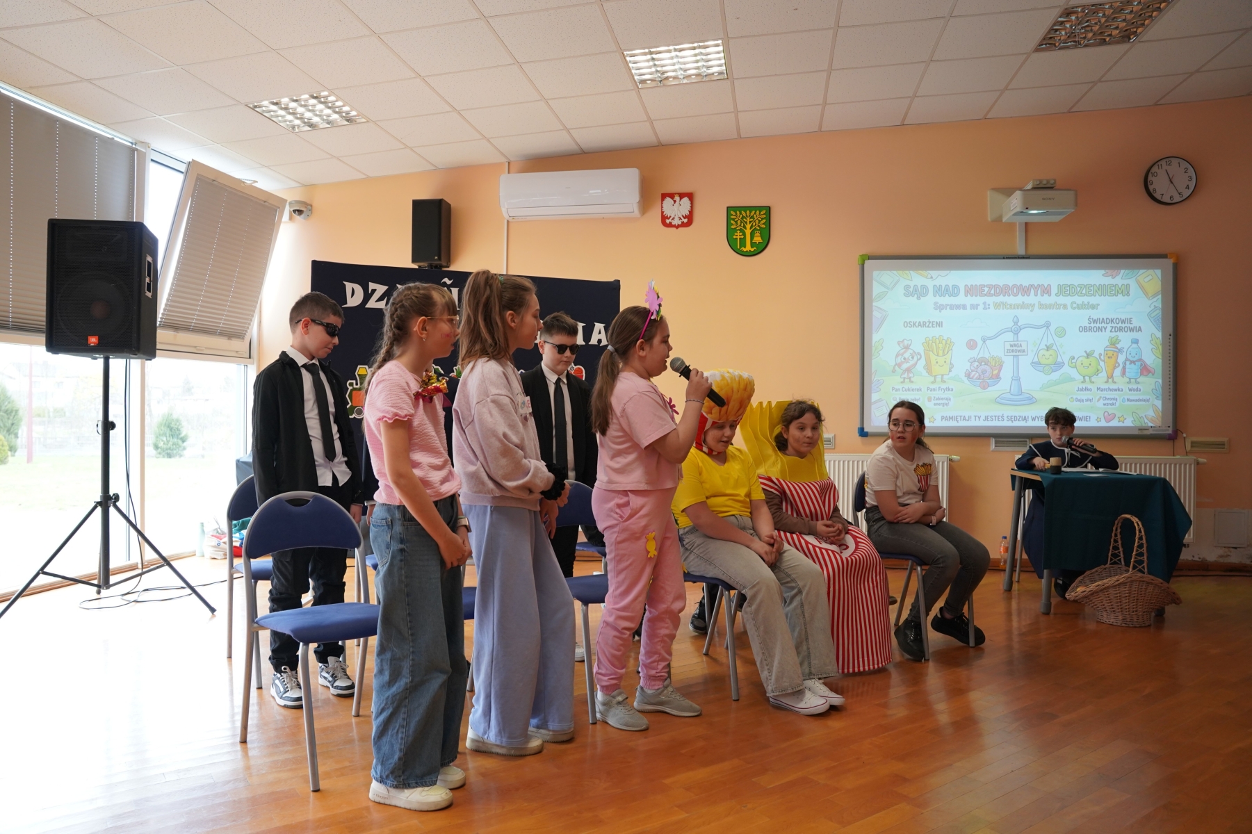 9 kwietnia sala Szklana zamieniła się w salę rozpraw. Z okazji Światowego Dnia Zdrowia uczniowie klasy IVb przygotowali przedstawienie pt. „Sąd nad Niezdrowym Jedzeniem”. Na ławie oskarżonych zasiedli najwięksi kusiciele sklepików: Pan Cukierek oraz Pani Frytka. Zarzuty były poważne – psucie zębów, odbieranie energii i namawianie do lenistwa. Proces prowadził surowy, ale sprawiedliwy Sędzia. Choć oskarżeni próbowali przekonać zgromadzonych do swoich uroków, argumentując, że są słodcy i chrupiący, świadkowie oskarżenia nie pozostawili na nich suchej nitki. Na sali pojawili się: