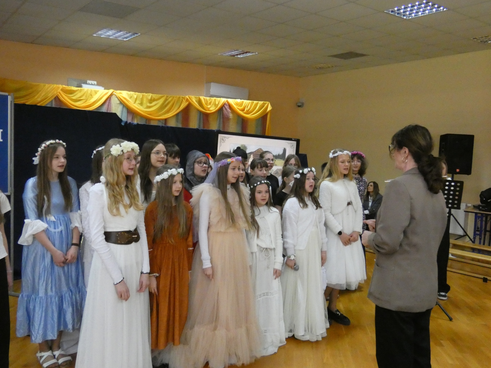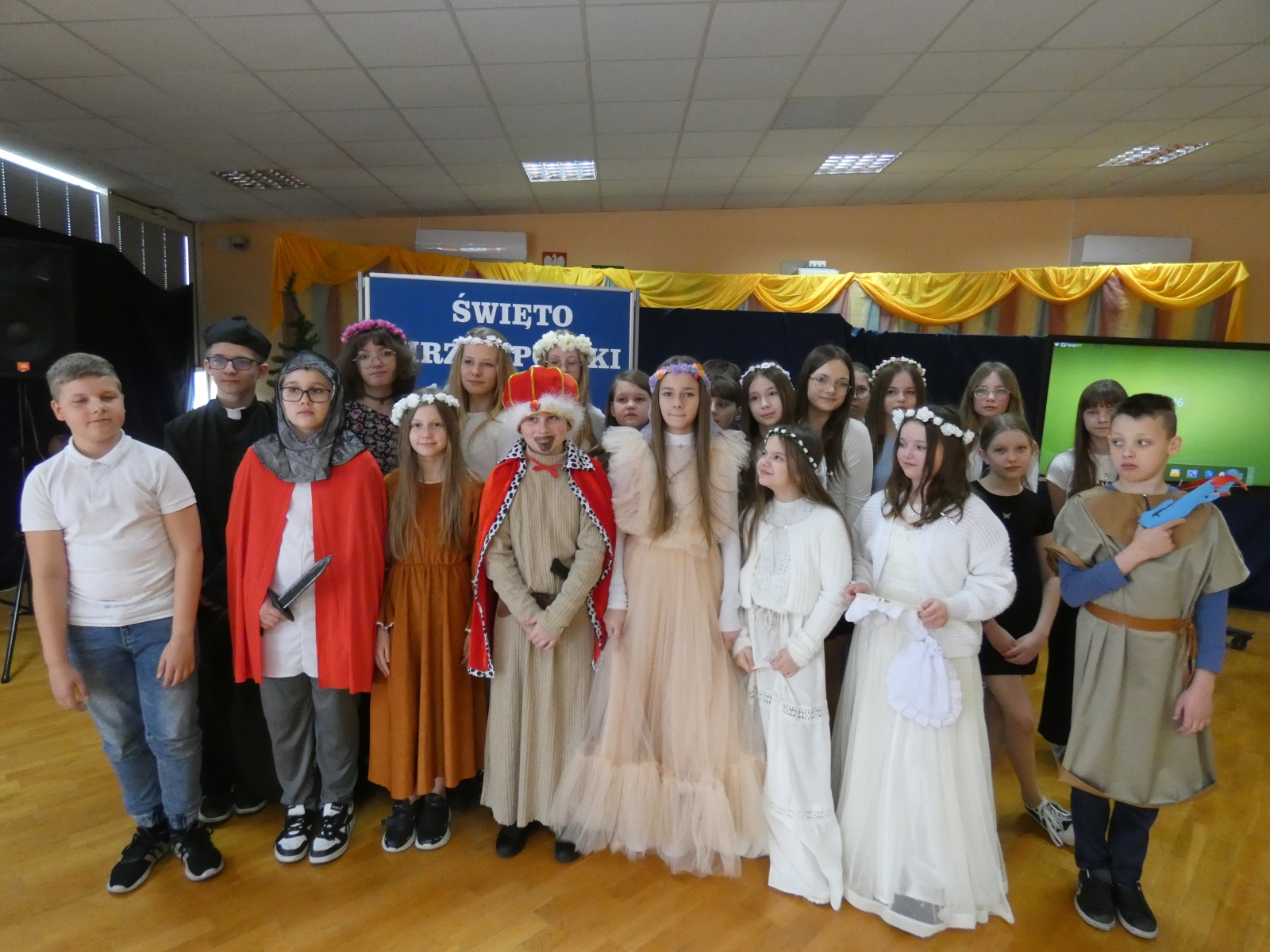 Chrzest księcia Mieszka I to przełomowe wydarzenie w dziejach państwa i narodu polskiego, uznawane za symboliczny początek polskiej państwowości. W dniu 10.04.2025r. w naszej szkole odbyła się akademia, która była niecodzienną lekcją historii. Uczniowie kl. V b pod opieką p. Eweliny Czerniak i p. Krystyny Nykiel, przygotowali widowisko, w którym przedstawili początki państwa Piastów.