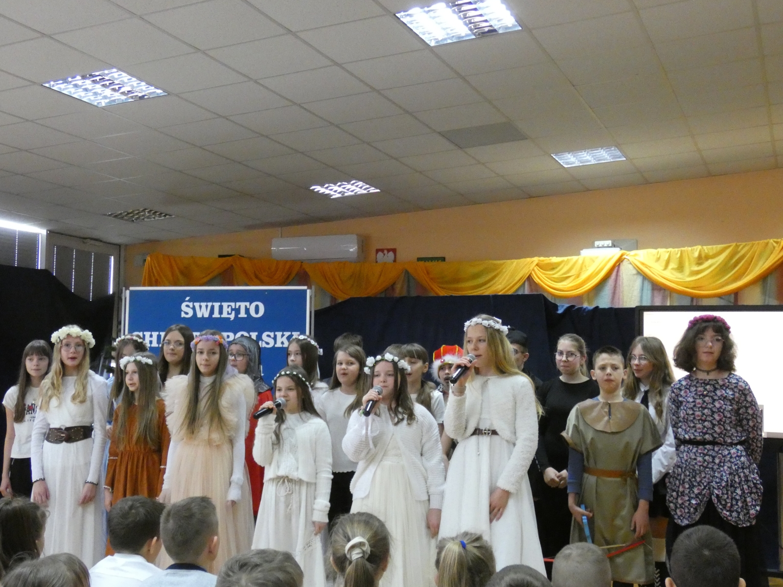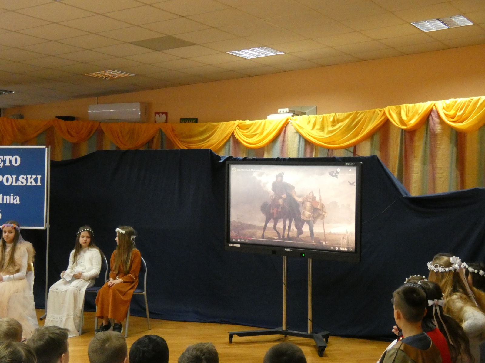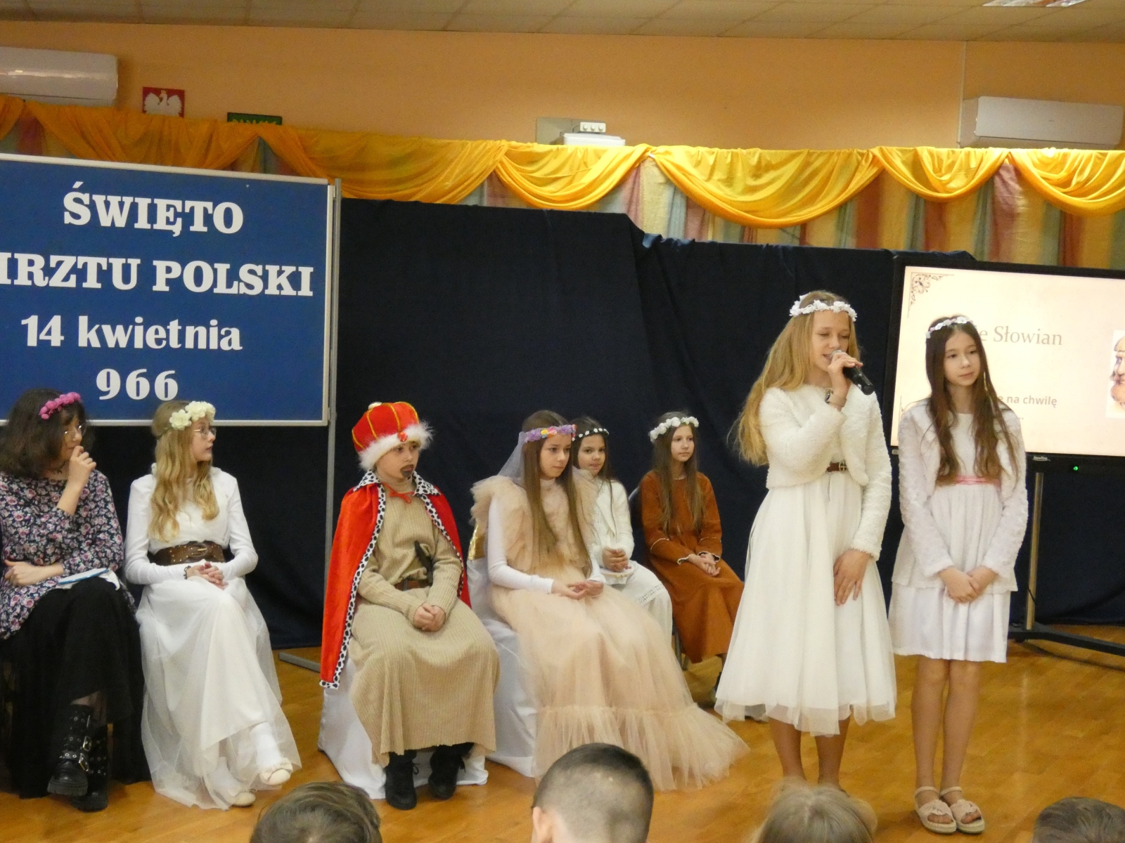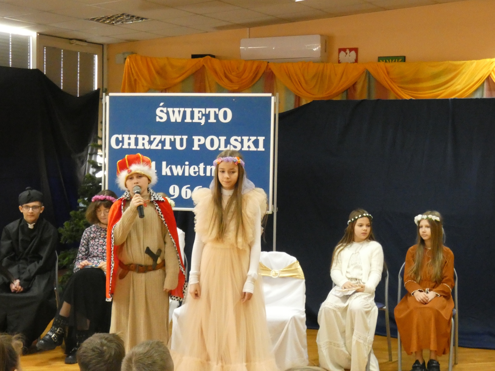 Pierwszoplanowymi postaciami byli oczywiście Mieszko i Dobrawa. Nasz władca opowiadał o sytuacji swojego państwa, życiu poddanych, ich wierzeniach (zobrazowane pokazem slajdów), Dobrawa przedstawiła okoliczności swojego przybycia na dwór Mieszka I. Kulminacyjnym momentem była scena przyjęcia chrztu. Montaż zdobiły utwory muzyczne w wykonaniu uczniów klasy V b pod kierunkiem p. Anny Marciniak. Na koniec narratorzy podkreślili wagę tego aktu. Otwarcie na pismo, na kamienne budowle, na wyższy poziom kultury materialnej i duchowej. Kolejne pokolenia piastowskiego państwa zaczęły zdobywać zdolność samodzielnego pisania i kontynuowania swojej historii, wpisywania jej w coraz bardziej dojrzały dorobek kulturalny Europy. To był także, jak się okazało, skuteczny środek utrwalania niepodległości. Wszyscy zgromadzeni na akademii mieli okazję do przypomnienia i utrwalenia jednego z najważniejszych wydarzeń historycznych naszego kraju.