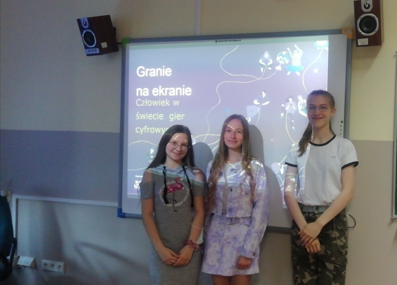 W ramach projektu Szkoła Odpowiedzialna Cyfrowo,8 i11 czerwca uczennice klasy 8a Maja Grzelka, Natalia Bielecka i Zofia Kulec uczestniczyły w szkoleniu ,,Granie na ekranie" organizowanym przez fundację Dbam o mój Zasięg. Na podstawie zdobytej wiedzy dnia 16 czerwca 2021 r. zorganizowały warsztaty dla uczniów. Uczniowie klas 4a, 4b oraz 5a, z zaangażowaniem brali udział w zajęciach. Dowiedzieli się wielu przydatnych informacji na temat zalet i wad grania w gry cyfrowe. Był przeprowadzony quiz, uczniowie oglądali filmiki edukacyjne, a ponadto chętnie wzięli udział w całości zajęć.