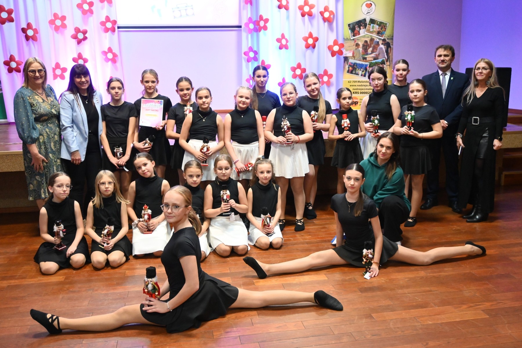 Uczennice oraz opiekun zespołu dziękują Radzie Rodziców przy Szkole Podstawowej w Malanowie za zakup nowych strojów, które wykorzystane będą w kolejnych układach tanecznych.