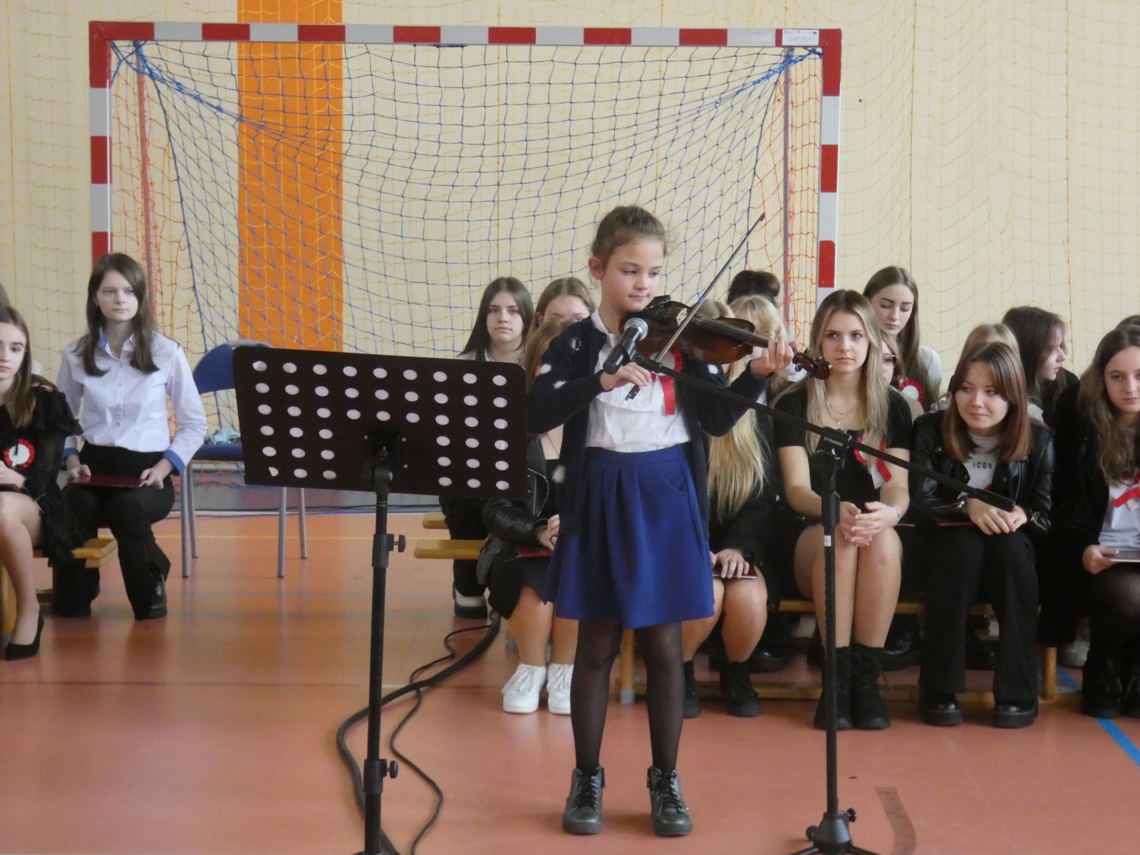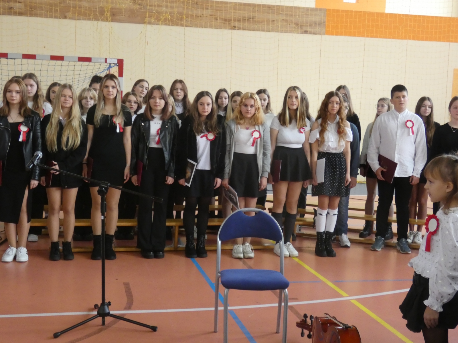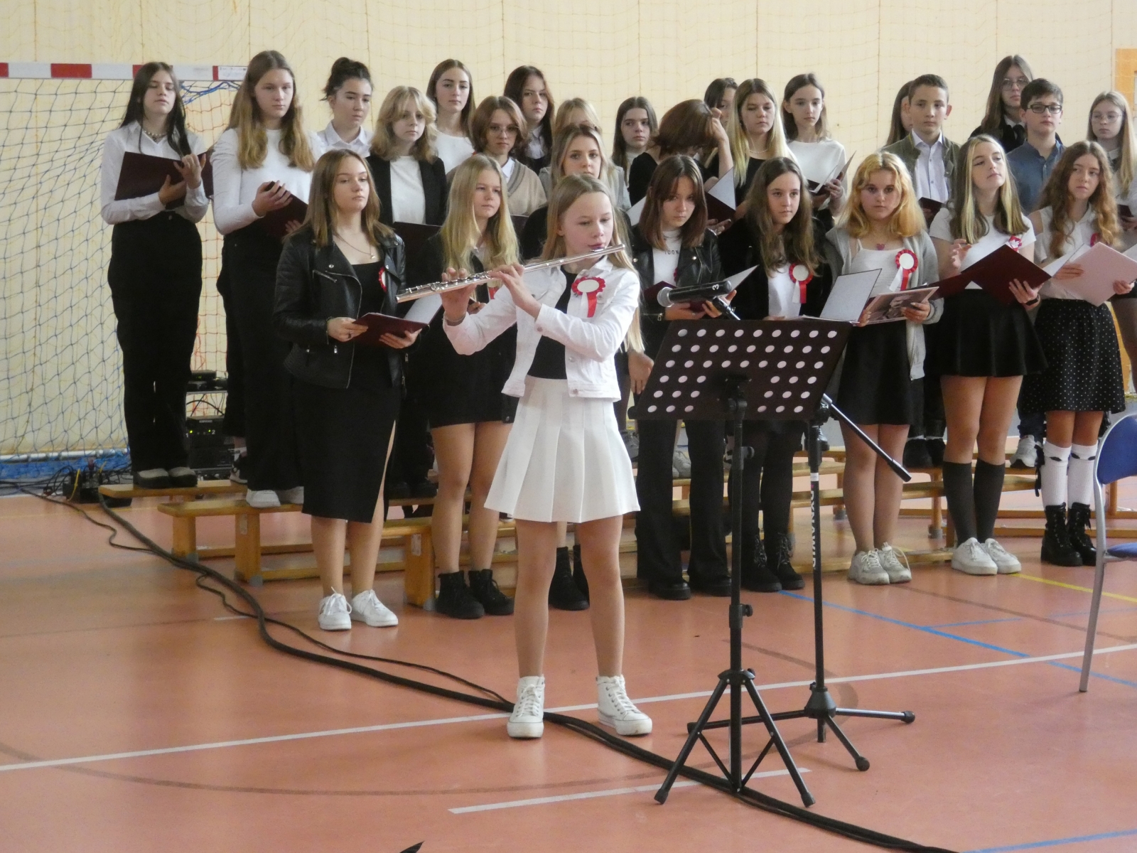 W programie słowno-muzycznym zaprezentowali się uczniowie klasy 8a oraz szkolny chór, prowadzony przez p. Katarzynę Tomczyk.