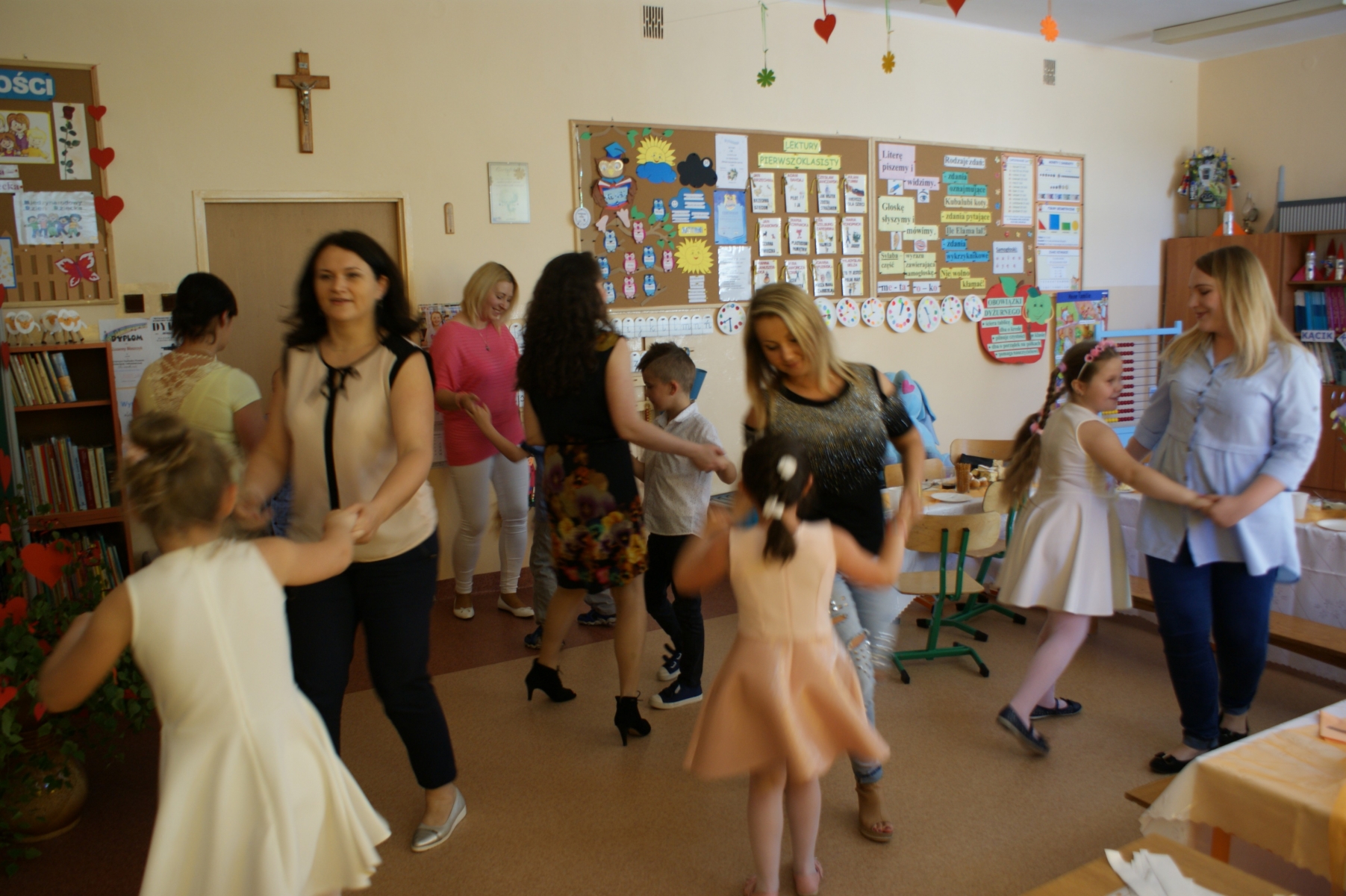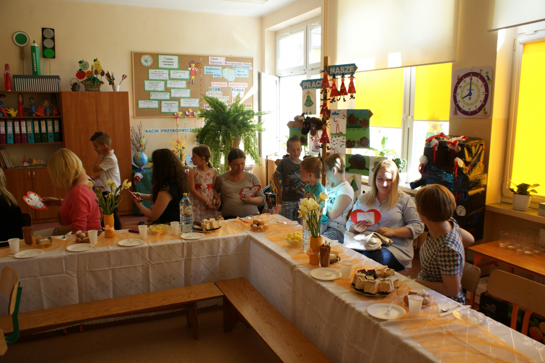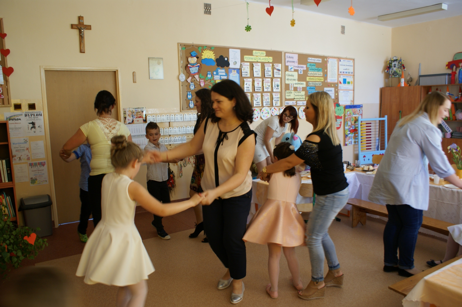 Po części artystycznej wszyscy zasiedli do wspólnego stołu, przygotowanego przez niezawodne mamy. Następnie odbyły się zabawy przy muzyce i konkursy z udziałem mam i dzieci. Dużo radości sprawiły konkursy: „Czy znasz swoją mamę?”, „Czy znasz swoje dziecko?”, „Łamańce językowe”, „Wykonanie stroju ekologicznego”, „Rozpoznaj swój portret”. Dzieci były bardzo zadowolone z obecności swoich mam, chętnie bawiły się wspólnie z mamami. Spotkanie odbyło się w miłej i serdecznej atmosferze.