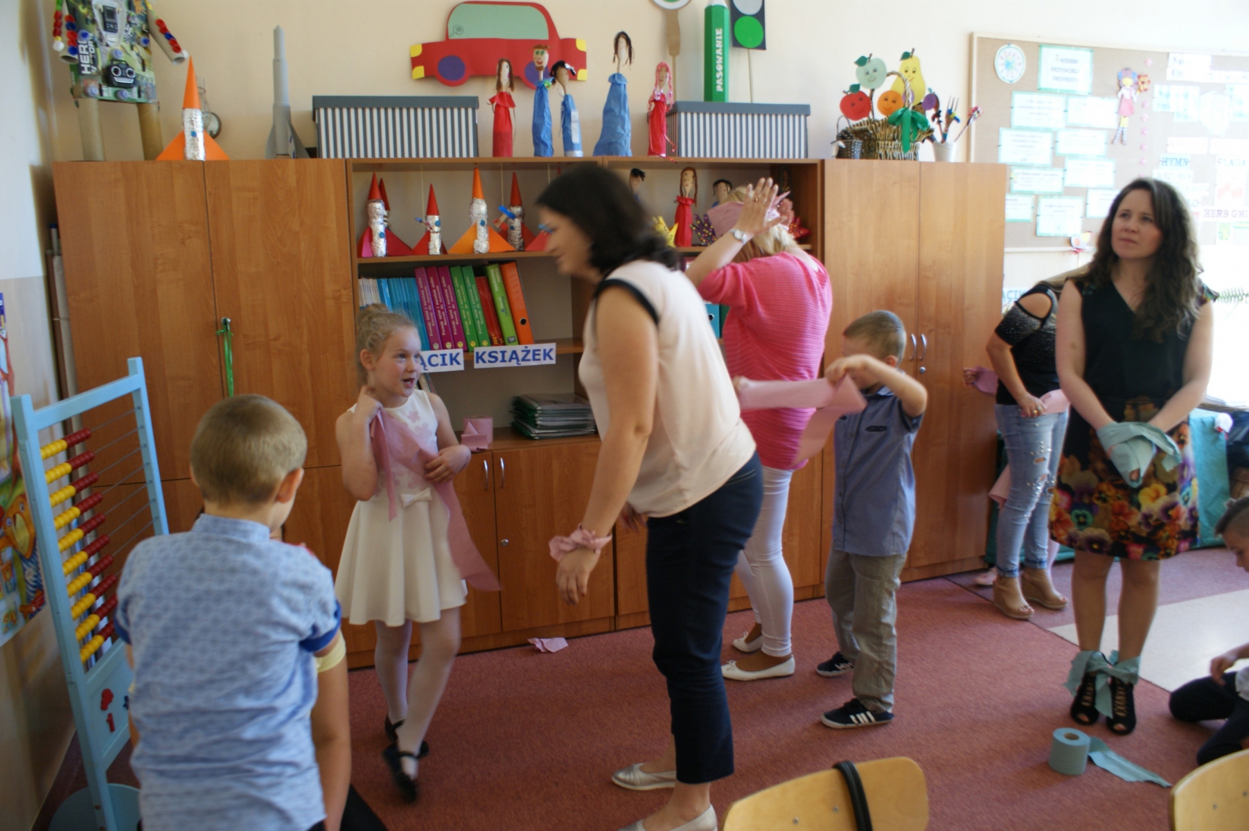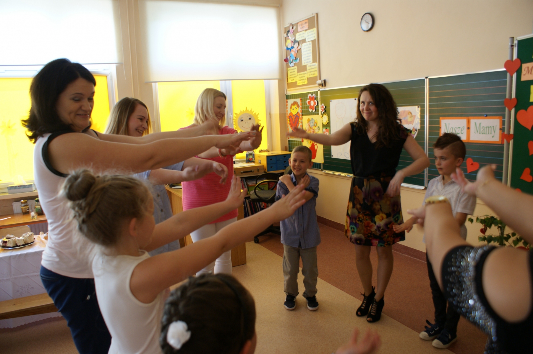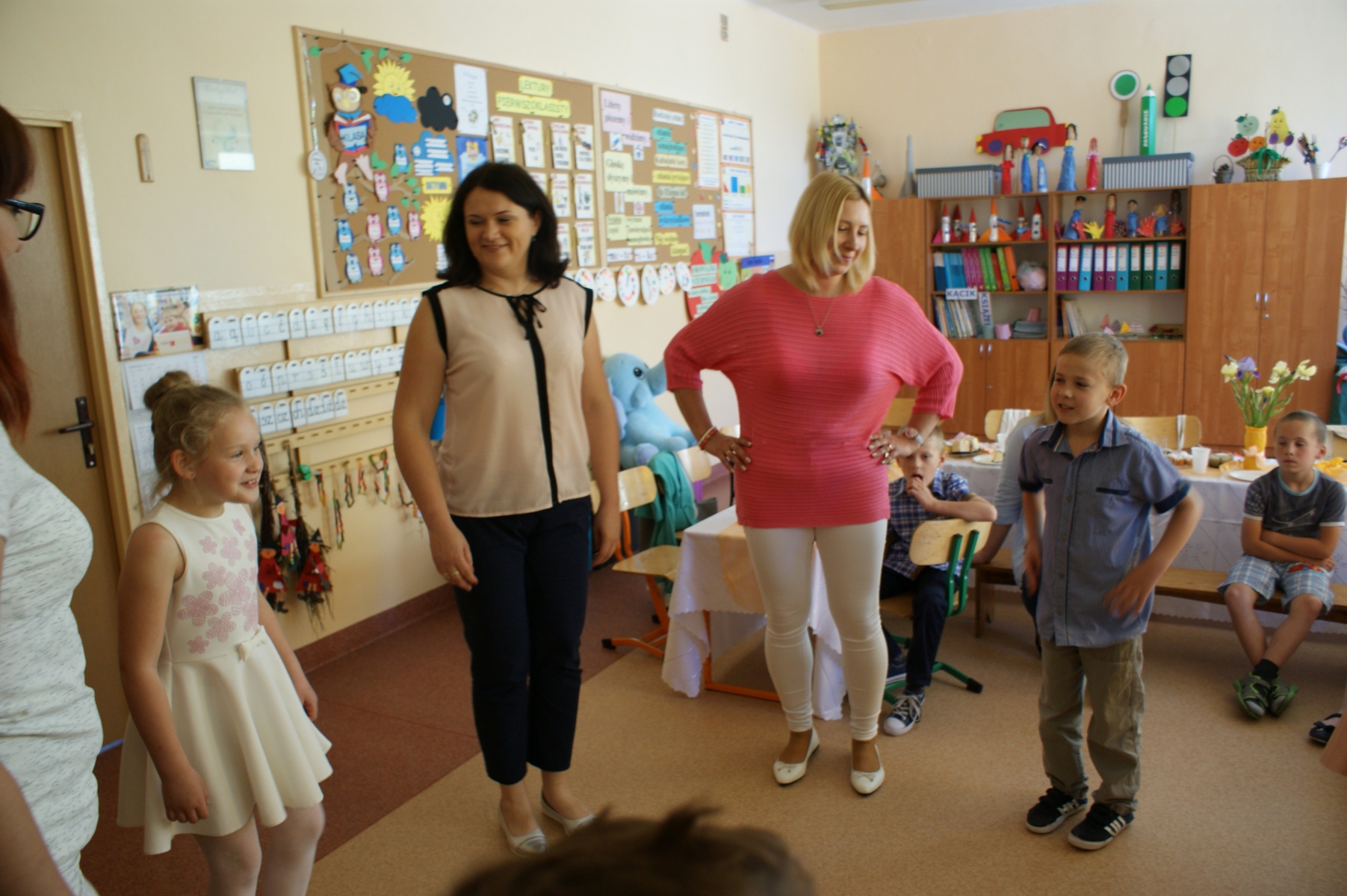 Po części artystycznej wszyscy zasiedli do wspólnego stołu, przygotowanego przez niezawodne mamy. Następnie odbyły się zabawy przy muzyce i konkursy z udziałem mam i dzieci. Dużo radości sprawiły konkursy: „Czy znasz swoją mamę?”, „Czy znasz swoje dziecko?”, „Łamańce językowe”, „Wykonanie stroju ekologicznego”, „Rozpoznaj swój portret”. Dzieci były bardzo zadowolone z obecności swoich mam, chętnie bawiły się wspólnie z mamami. Spotkanie odbyło się w miłej i serdecznej atmosferze.