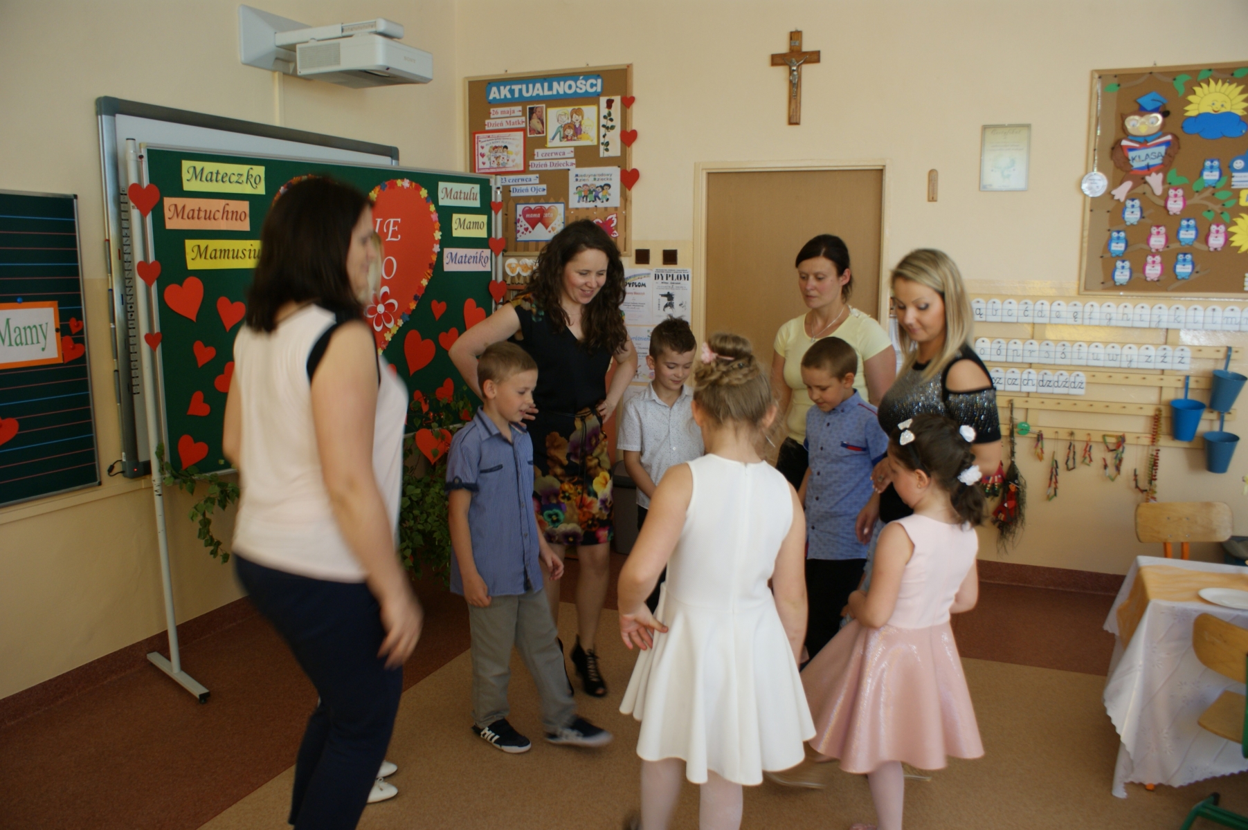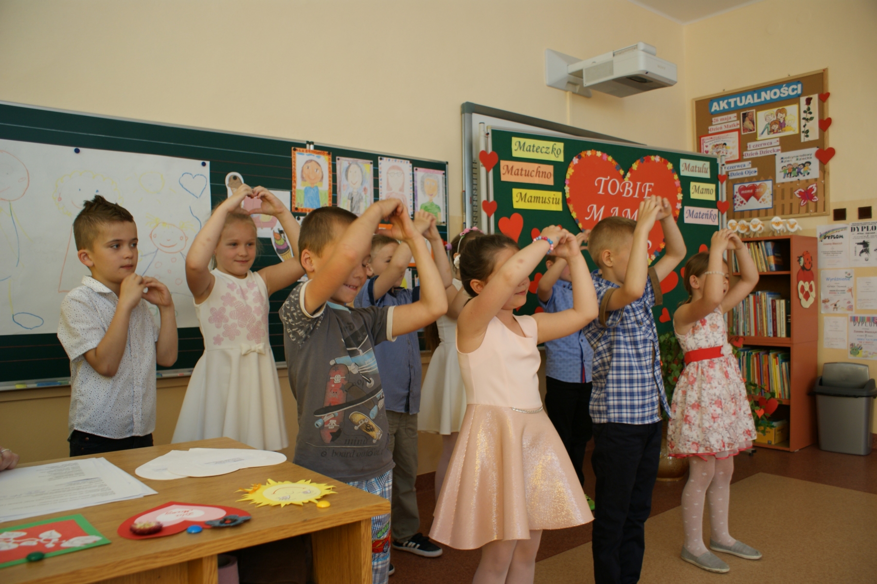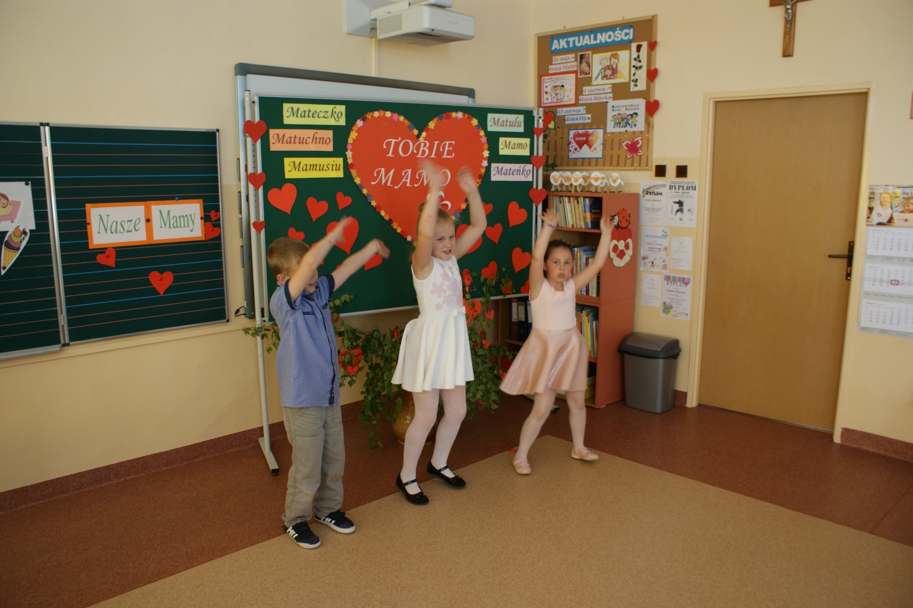 obejrzały prosty układ taneczny oraz ciekawy „Rysunek mamy”, gdzie dziewczynki śpiewały i jednocześnie rysowały na tablicy obrazek mamy zgodnie z treścią piosenki. Najbardziej wzruszającym momentem była „wiązanka serdecznych życzeń”. Dzieci mogły indywidualnie w miłych słowach wyrazić swą miłość, wdzięczność za ciepło domowej atmosfery i trud codziennego dnia, wręczając swoim mamom laurki w kształcie serca.