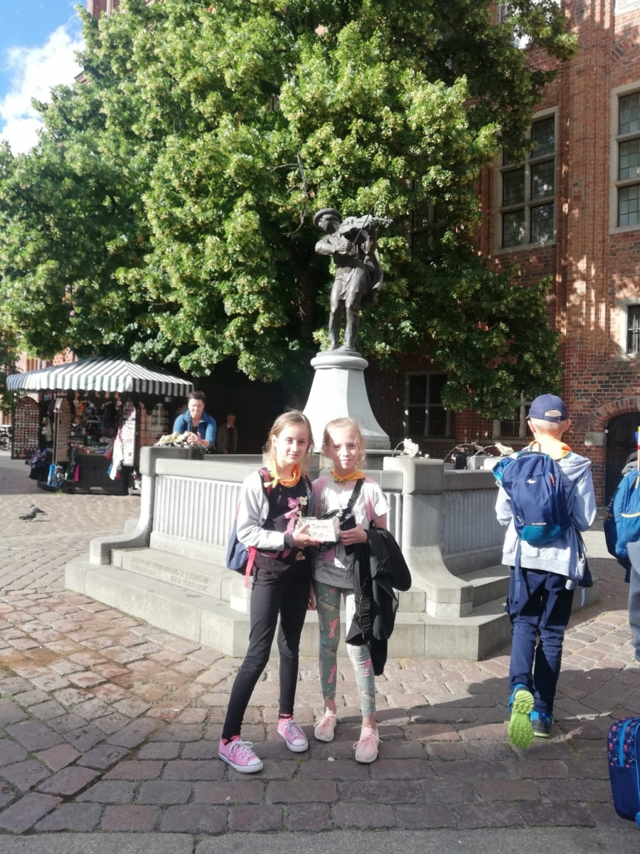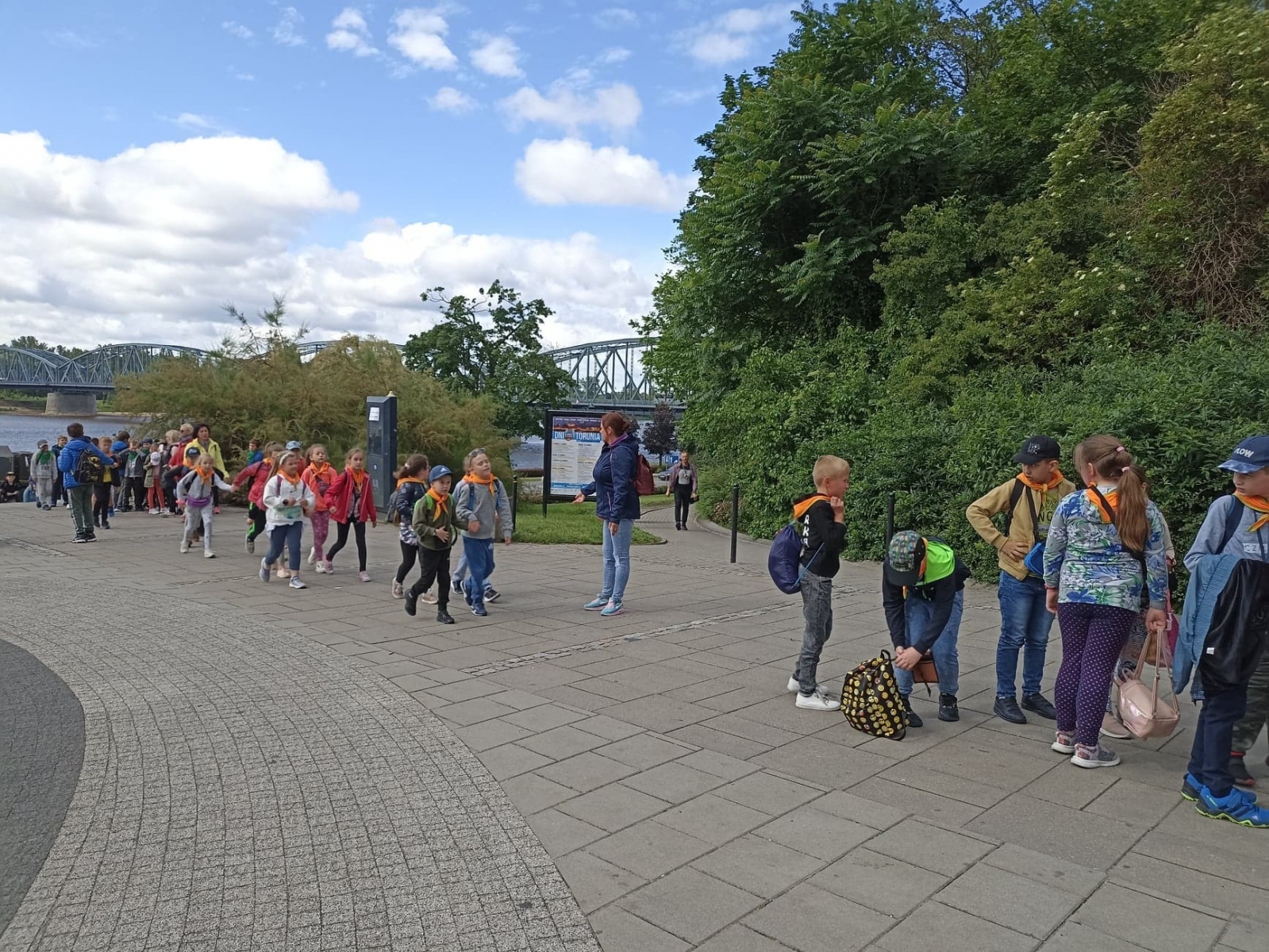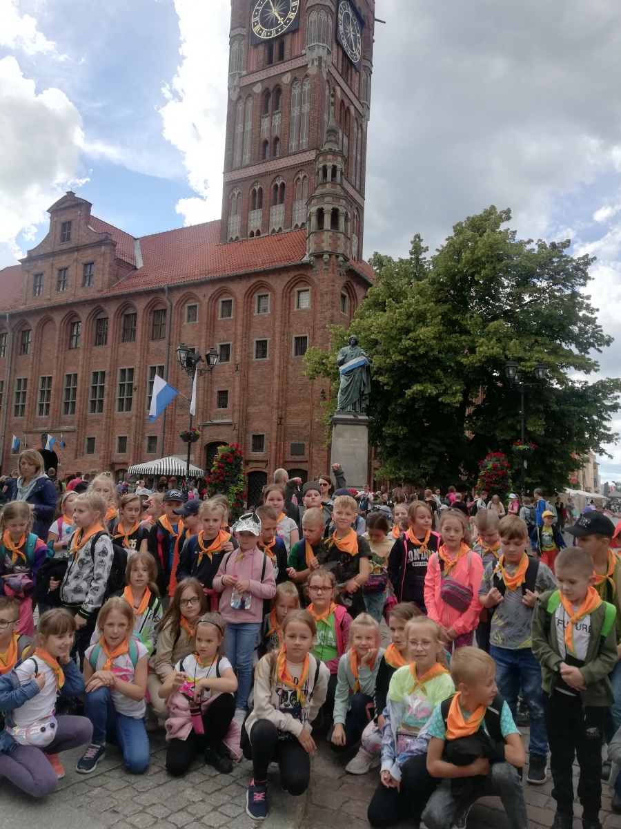 Przed obiadem udało się jeszcze zdążyć na rejs statkiem po Wiśle, skąd można było podziwiać piękne widoki na Stare Miasto. Pod koniec rejsu na niebie pojawiły się chmury i zaczęły spadać na głowy krople deszczu, które radosne dzieci szybko rozgoniły wesołym śpiewem i dobrym humorem. Potem wycieczka udała się przed dom Mikołaja Kopernika, a po obiedzie do Planetarium - centrum popularyzacji kosmosu. Seans filmowy pt.: „Kolorowy kosmos”, zabrał dzieci w podróż po planetach i kosmosie. Tworząca sztuczne niebo kopuła wywołała wrażenie realnej podróży po wszechświecie. Toruń, to przede wszystkim Miasto Mikołaja Kopernika, którego pomnik stoi w rynku Starego Miasta. Pan przewodnik wspólnie z dziećmi opowiadał o dokonaniach wybitnego polskiego astronoma, oczywiście nie obyło się również bez pamiątkowego zdjęcia. Uczniowie poznali też „Legendę o tym, jak Flisak żaby z Torunia wyprowadził”, a także o „Ośle –pręgierzu”. Wycieczka byłaby nie zaliczona bez zakupu pamiątek i pierników - to był ostatni punkt programu.