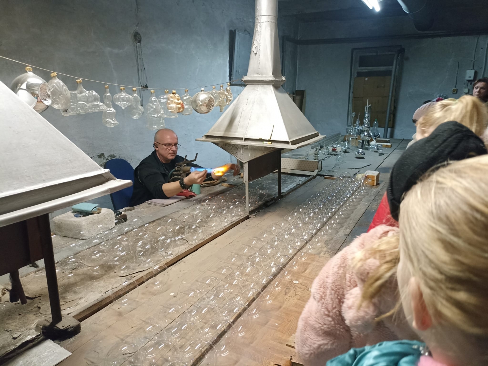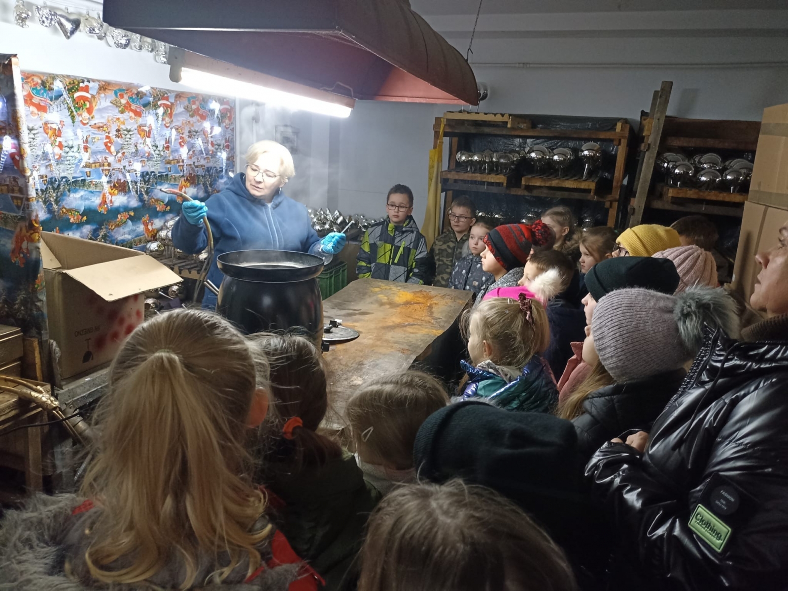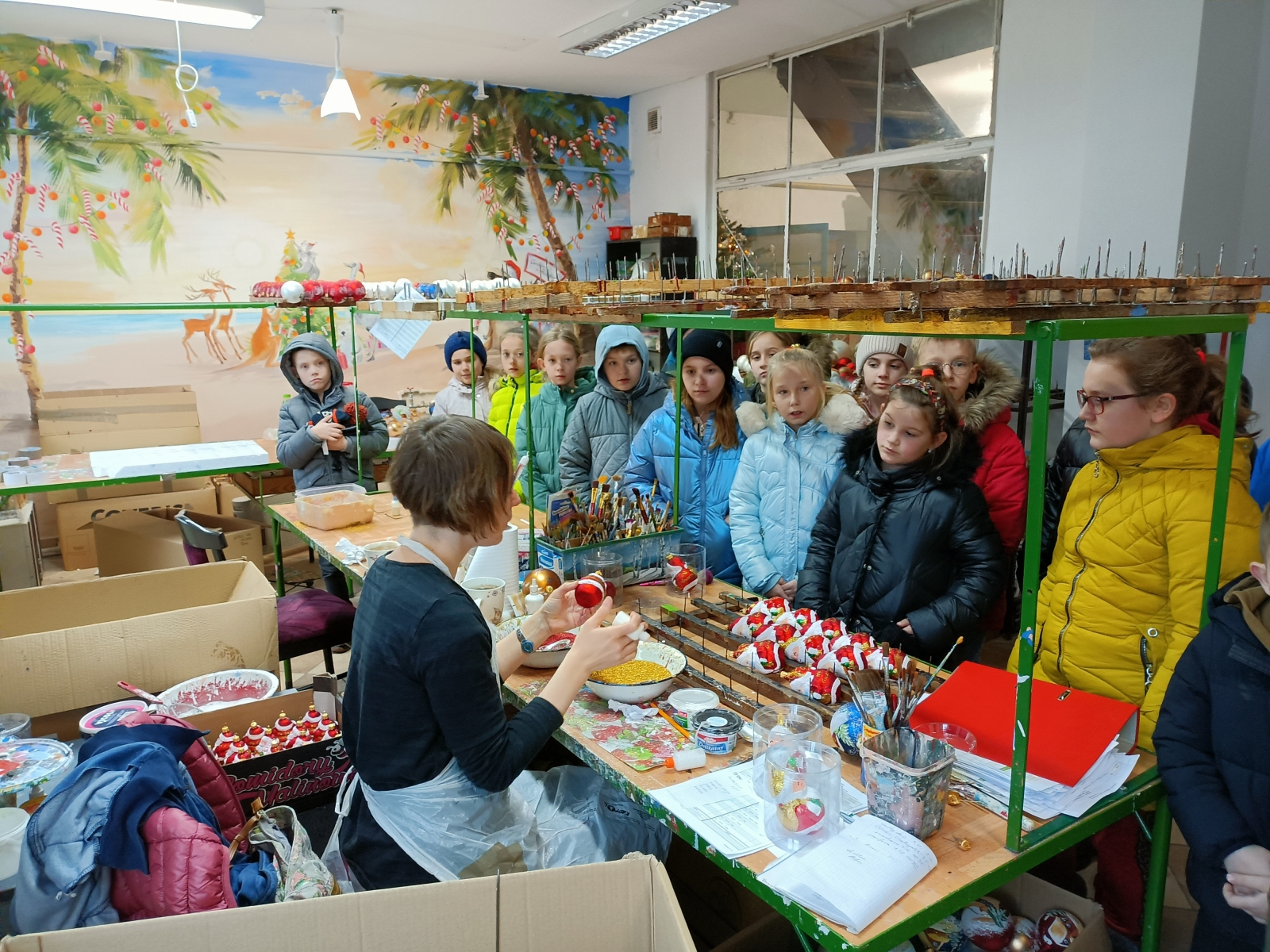 Pan przewodnik oprowadził dzieci po Fabryce i zapoznał z etapami produkcji. Zwiedzanie rozpoczęło się od dmuchalni szkła, gdzie w wysokiej temperaturze z kawałka szklanej rurki pracownicy fabryki tworzyli szklane kule, które potem trafiły do gorącej wody i były poddawane srebrzeniu. Następnie bombka trafia do lakierni, gdzie jest zanurzana w lakierze o odpowiednim kolorze i przybiera kolorową warstwę gładką lub matową. Ostatnim etapem w produkcji było dekorowanie. Dzieci oglądały produkowane ręcznie bombki o różnych kształtach wzorach i kolorach. Dużą atrakcją były warsztaty plastyczne, podczas których dzieci samodzielnie dekorowały ozdoby według własnego pomysłu. Na pamiątkę wycieczki otrzymały bombkę z imieniem oraz własnoręcznie wykonane szklane ozdoby. Na terenie fabryki znajdował się również sklep firmowy, gdzie można było zakupić wiele różnorodnych, ręcznie malowanych ozdób.