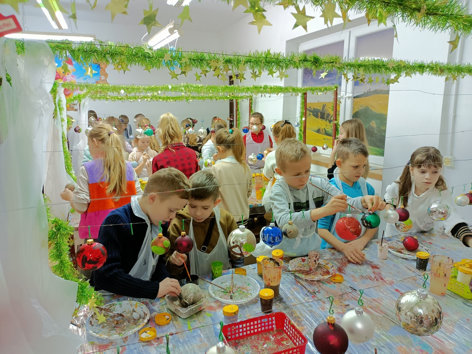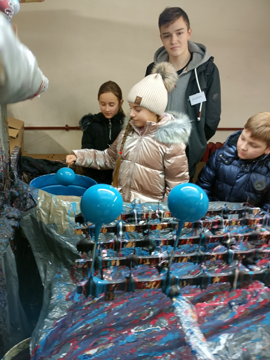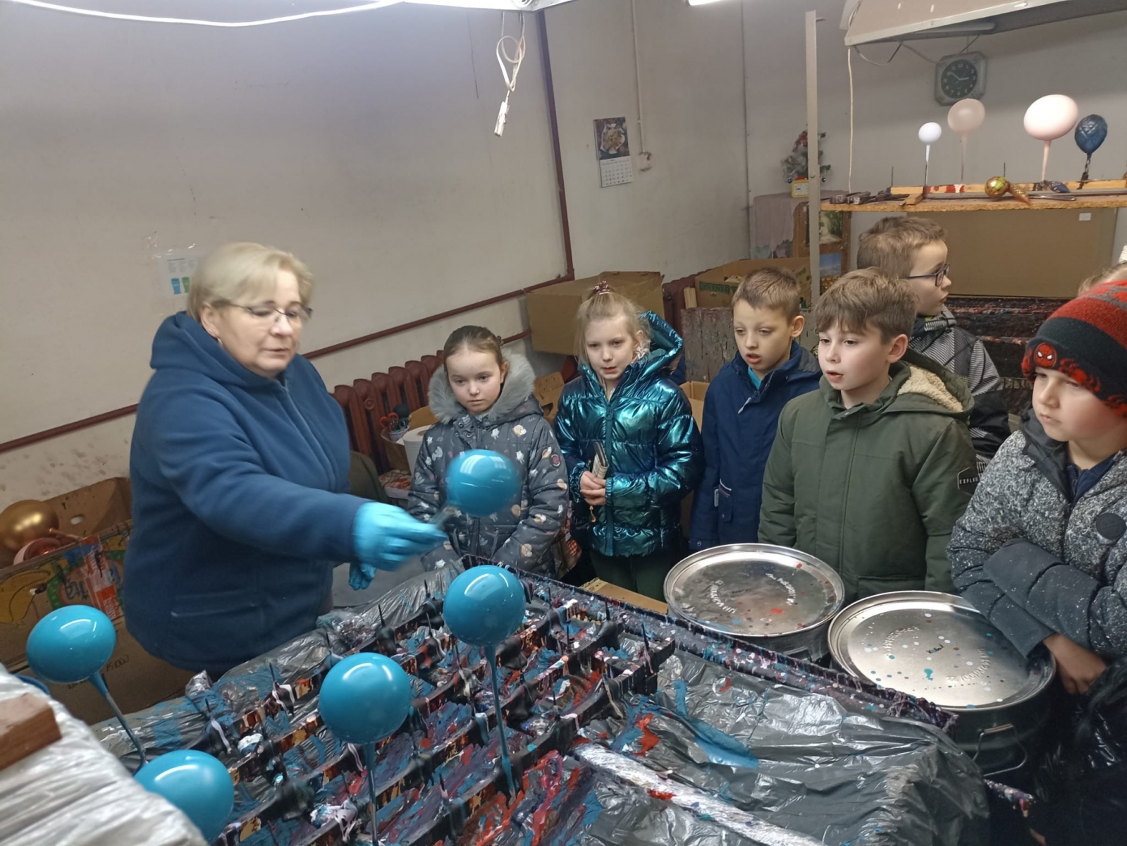 Pan przewodnik oprowadził dzieci po Fabryce i zapoznał z etapami produkcji. Zwiedzanie rozpoczęło się od dmuchalni szkła, gdzie w wysokiej temperaturze z kawałka szklanej rurki pracownicy fabryki tworzyli szklane kule, które potem trafiły do gorącej wody i były poddawane srebrzeniu. Następnie bombka trafia do lakierni, gdzie jest zanurzana w lakierze o odpowiednim kolorze i przybiera kolorową warstwę gładką lub matową. Ostatnim etapem w produkcji było dekorowanie. Dzieci oglądały produkowane ręcznie bombki o różnych kształtach wzorach i kolorach. Dużą atrakcją były warsztaty plastyczne, podczas których dzieci samodzielnie dekorowały ozdoby według własnego pomysłu. Na pamiątkę wycieczki otrzymały bombkę z imieniem oraz własnoręcznie wykonane szklane ozdoby. Na terenie fabryki znajdował się również sklep firmowy, gdzie można było zakupić wiele różnorodnych, ręcznie malowanych ozdób.
