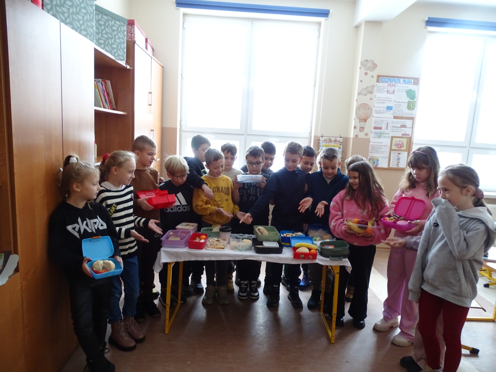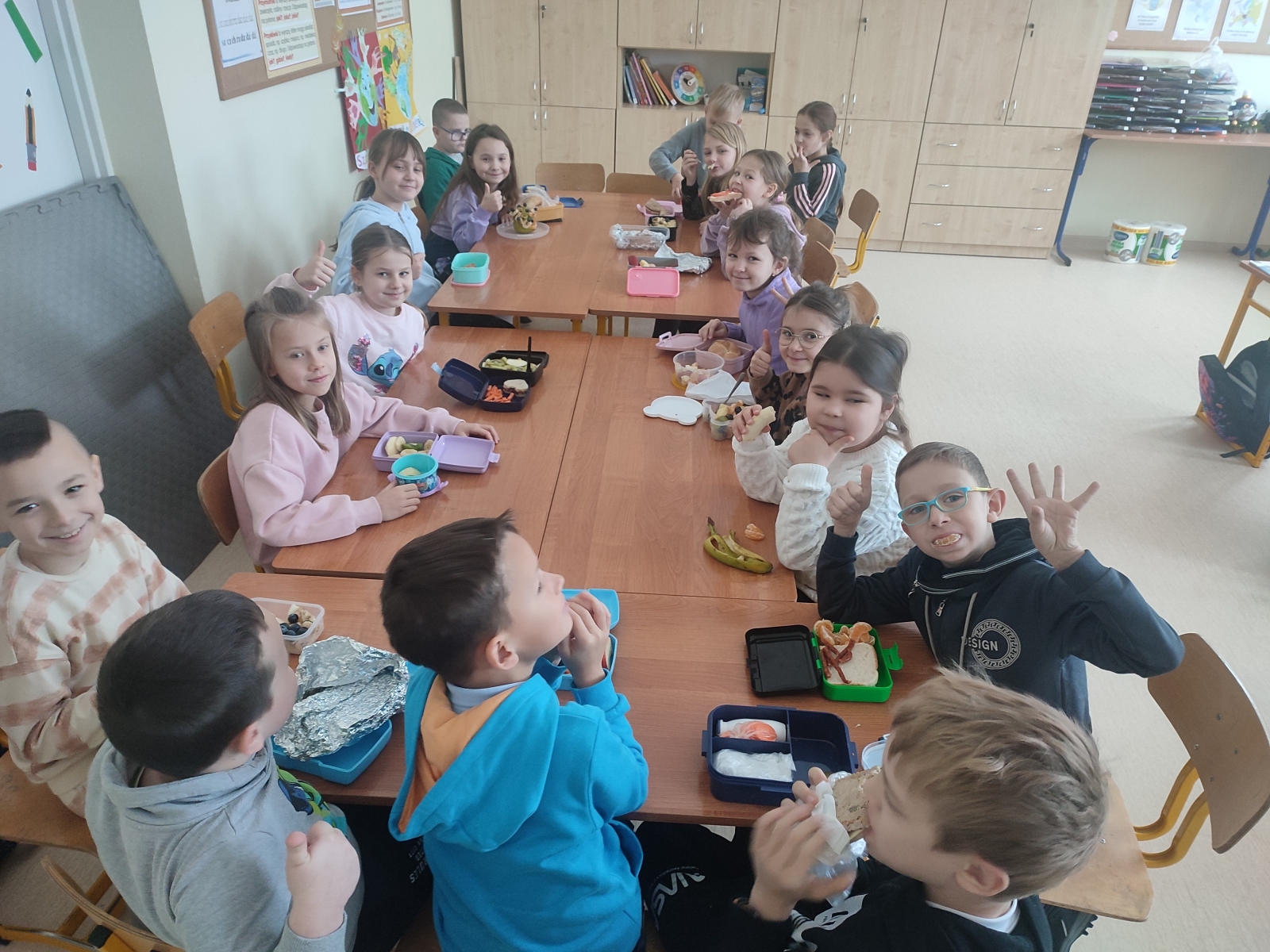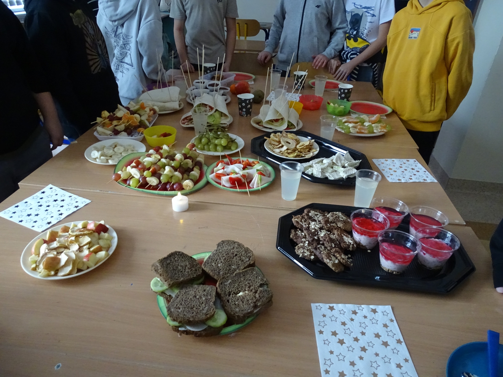 W czwartek uczniowie klas I – III wzięli udział w akcji „pudełkowe śniadanie”, która polegała na przygotowaniu i zabraniu do szkoły zdrowego drugiego śniadania. Natomiast klasy IV – VIII, podczas dwóch godzin lekcyjnych przygotowały zdrowe przekąski. Uczniowie wykazali się dużą kreatywnością, przygotowując bardzo ciekawe propozycje zdrowych i pełnych witamin smakołyków, pamiętając przy tym o estetyce ich wykonania i podania. Impreza była okazją do wzmacniania wzajemnych relacji i miłego spędzenia czasu w grupie klasowej. I choć mówi się, że: „Gdzie kucharek sześć, tam nie ma co jeść” to u nas było wesoło, smacznie i zdrowo.