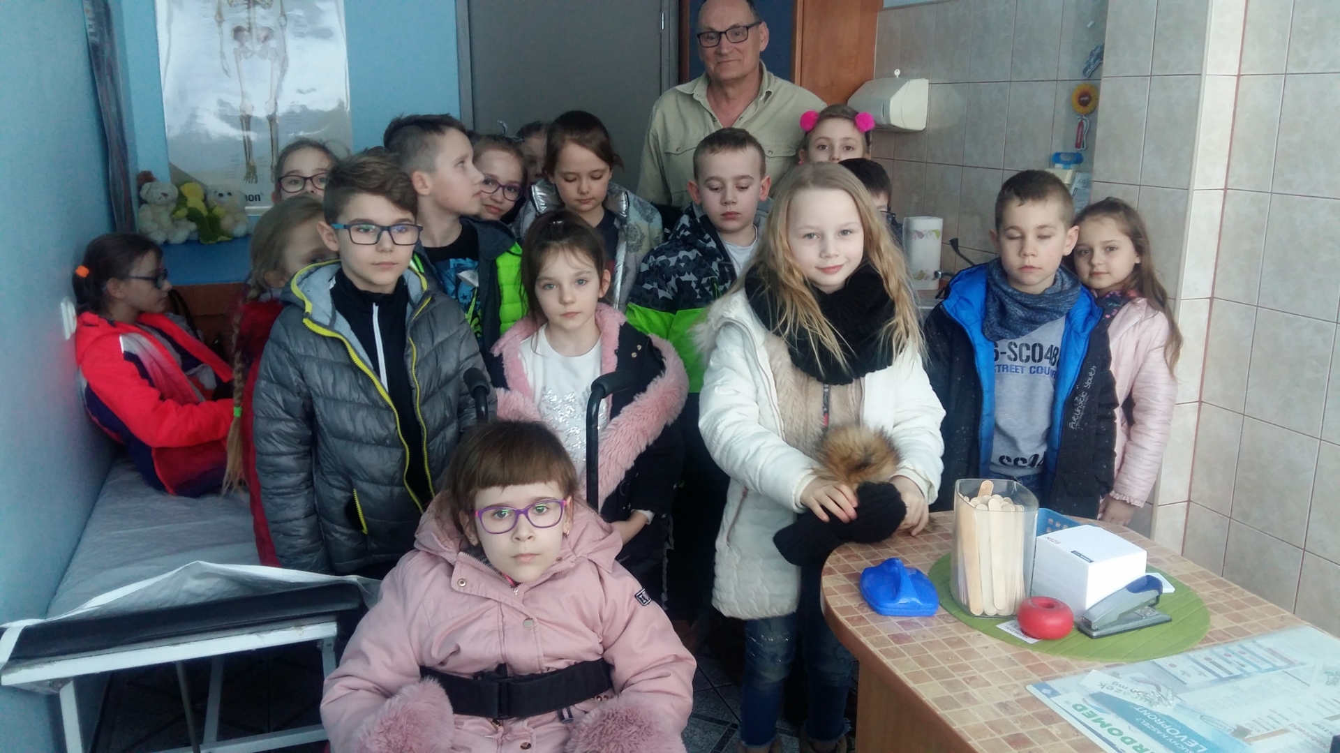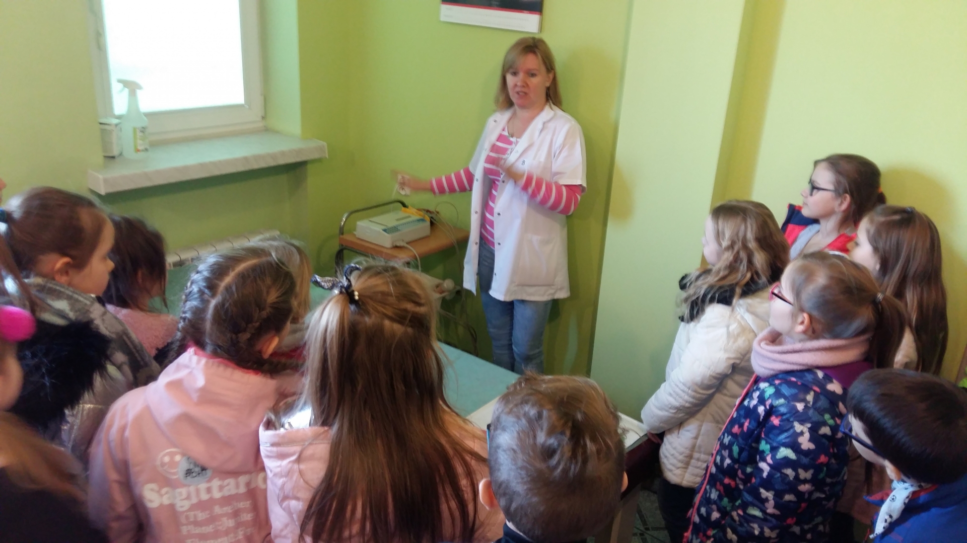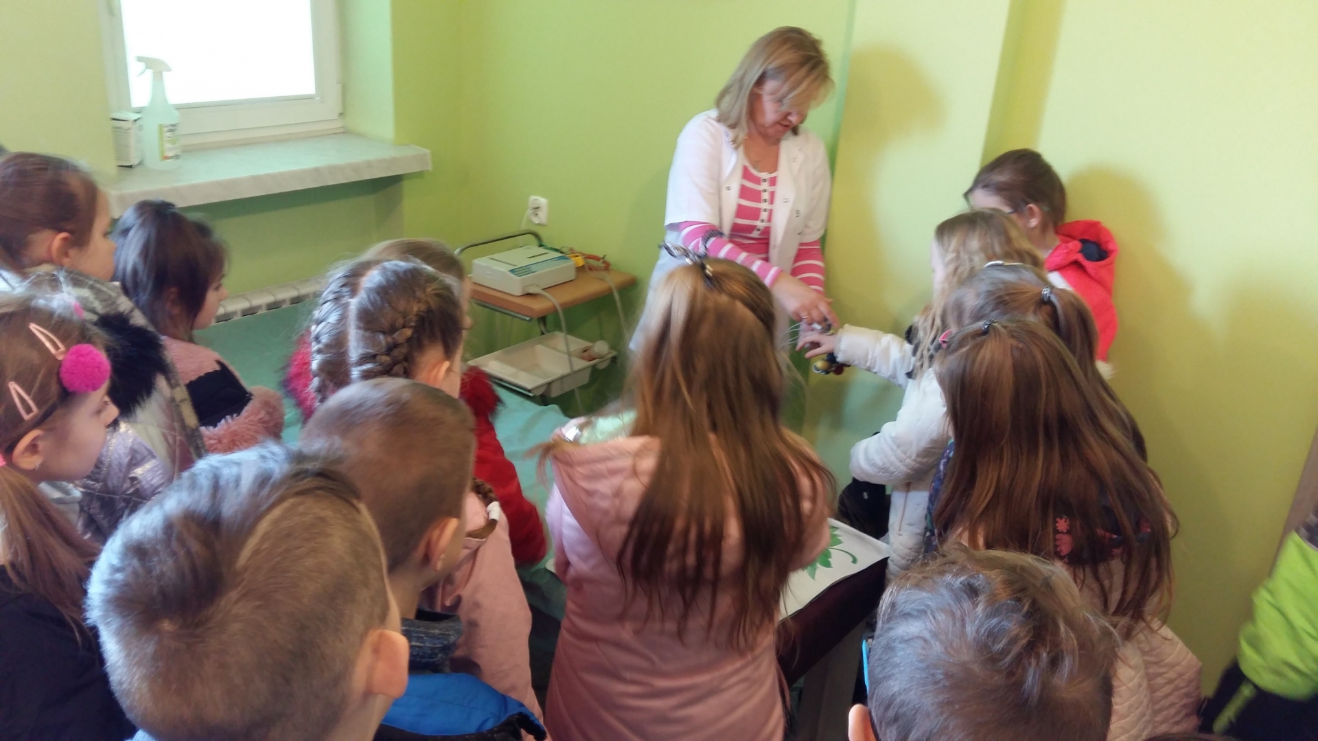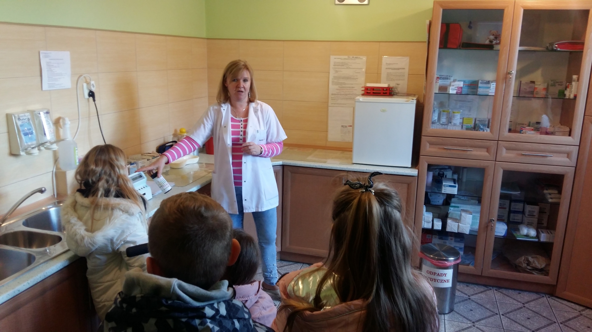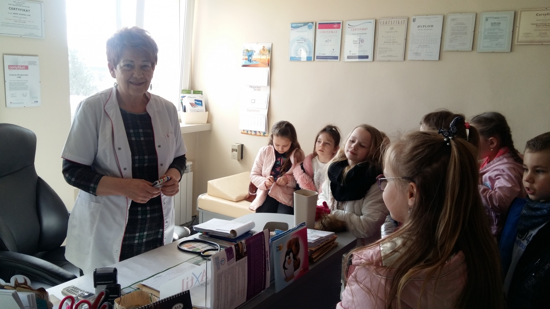 Dzieci powitała Pani doktor Grażyna Myszkowska-Głód, która w swoim gabinecie opowiadała, jak dbać o zdrowie i zapobiegać chorobom. Zapoznała też dzieci z wyposażeniem gabinetu, opowiadała o swojej pracy i o tym, co trzeba zrobić, żeby zostać lekarzem. Dzieci odwiedziły również pozostałe gabinety lekarskie. W jednym z nich spotkały się z panem doktorem Maciejem Karasiakiem. Pan doktor również przypomniał dzieciom jak ważne jest zdrowie, profilaktyka i zwyczajne częste mycie rąk. Potem pani pielęgniarka zaprosiła dzieci do gabinetu zabiegowego i gabinetu szczepień. Pani Ela Bortnowska opowiedziała dzieciom, na czym polega jej praca, czym różni się praca pielęgniarki od pracy lekarza, a także gabinet szczepień od zabiegowego. Tłumaczyła, dlaczego należy szczepić dzieci i jak bardzo ważne są szczepienia.