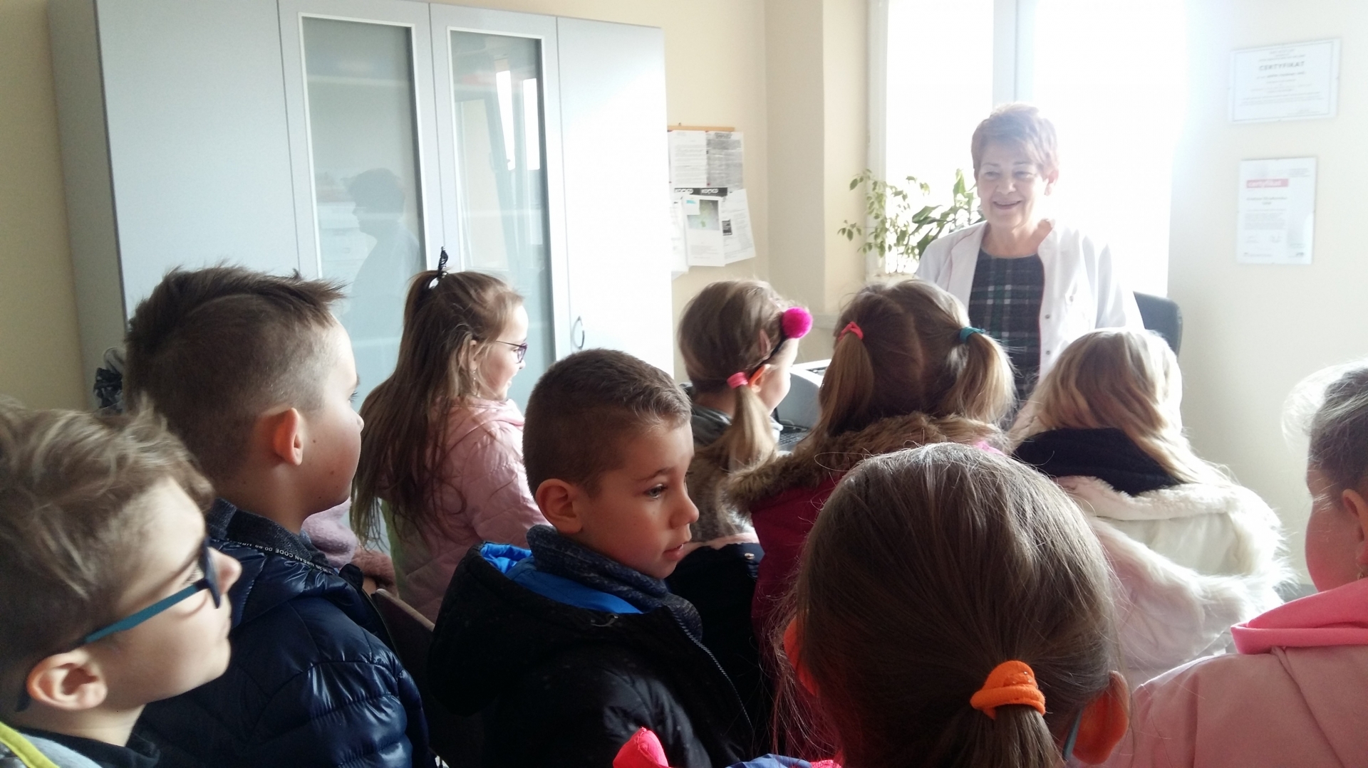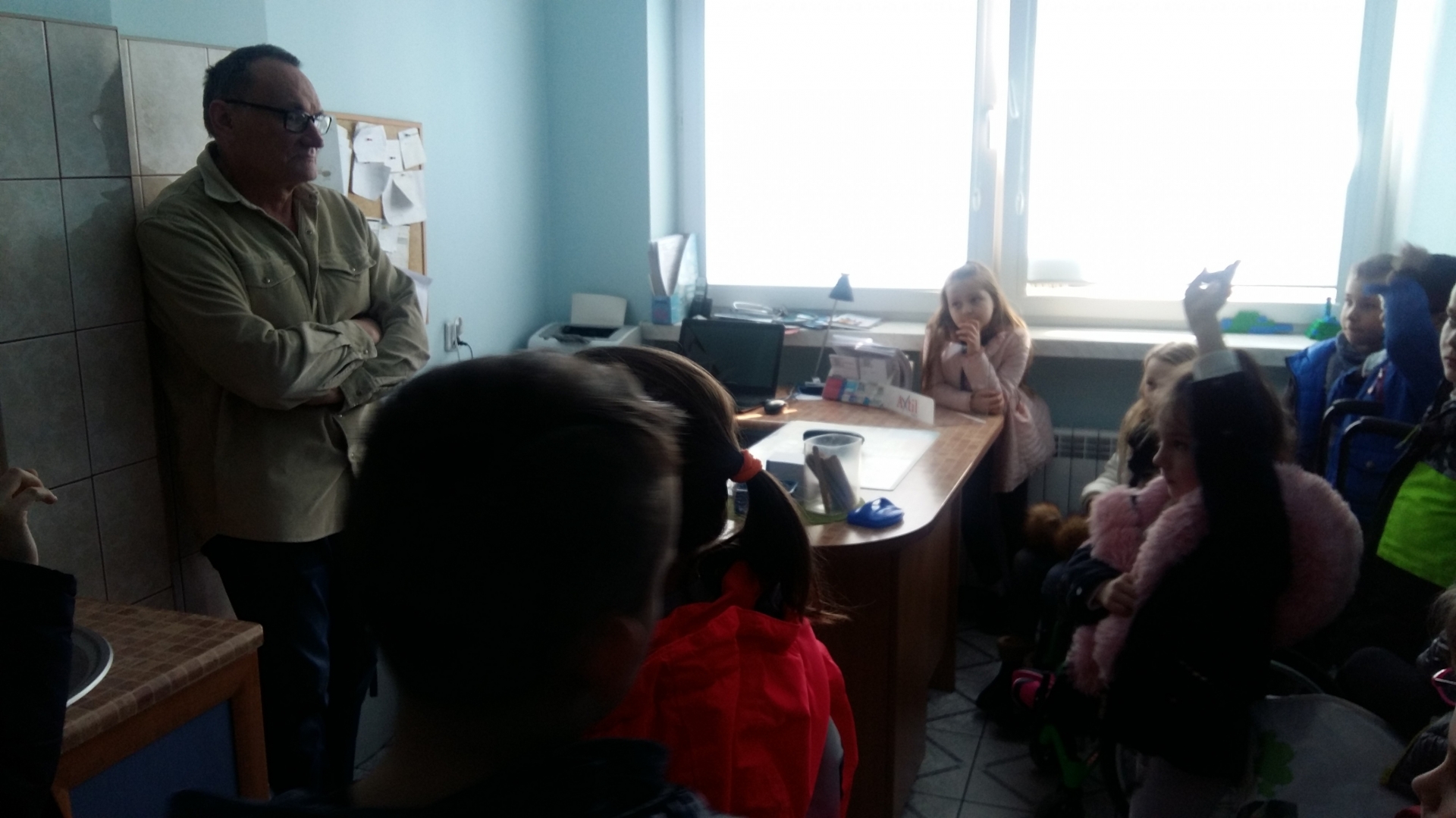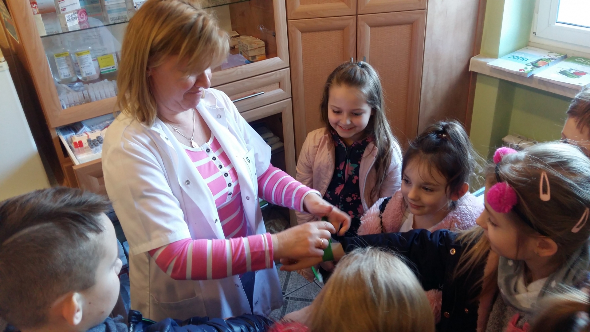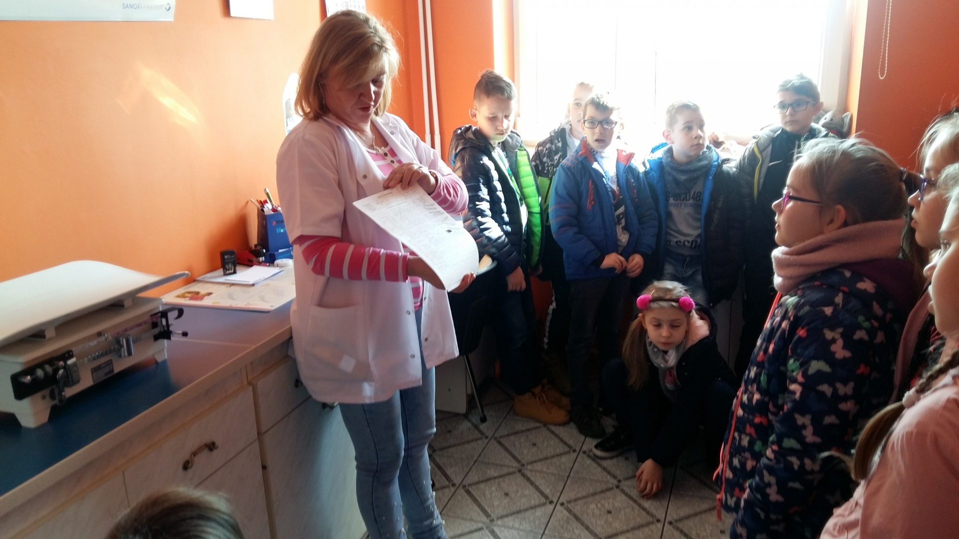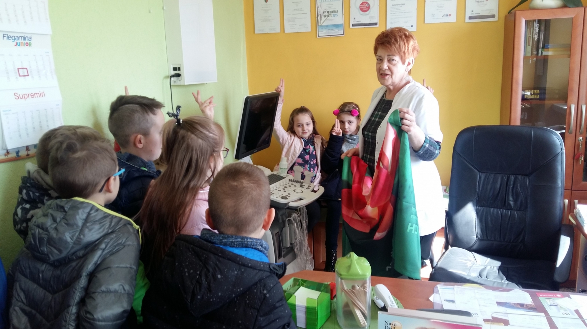 Dzieci powitała Pani doktor Grażyna Myszkowska-Głód, która w swoim gabinecie opowiadała, jak dbać o zdrowie i zapobiegać chorobom. Zapoznała też dzieci z wyposażeniem gabinetu, opowiadała o swojej pracy i o tym, co trzeba zrobić, żeby zostać lekarzem. Dzieci odwiedziły również pozostałe gabinety lekarskie. W jednym z nich spotkały się z panem doktorem Maciejem Karasiakiem. Pan doktor również przypomniał dzieciom jak ważne jest zdrowie, profilaktyka i zwyczajne częste mycie rąk. Potem pani pielęgniarka zaprosiła dzieci do gabinetu zabiegowego i gabinetu szczepień. Pani Ela Bortnowska opowiedziała dzieciom, na czym polega jej praca, czym różni się praca pielęgniarki od pracy lekarza, a także gabinet szczepień od zabiegowego. Tłumaczyła, dlaczego należy szczepić dzieci i jak bardzo ważne są szczepienia.