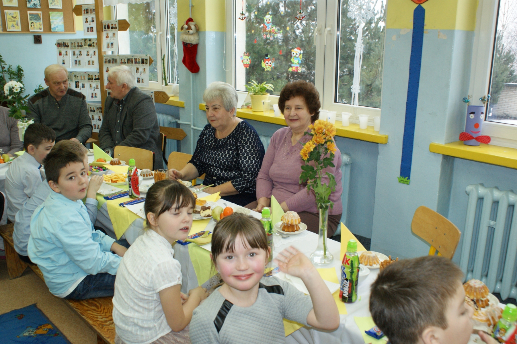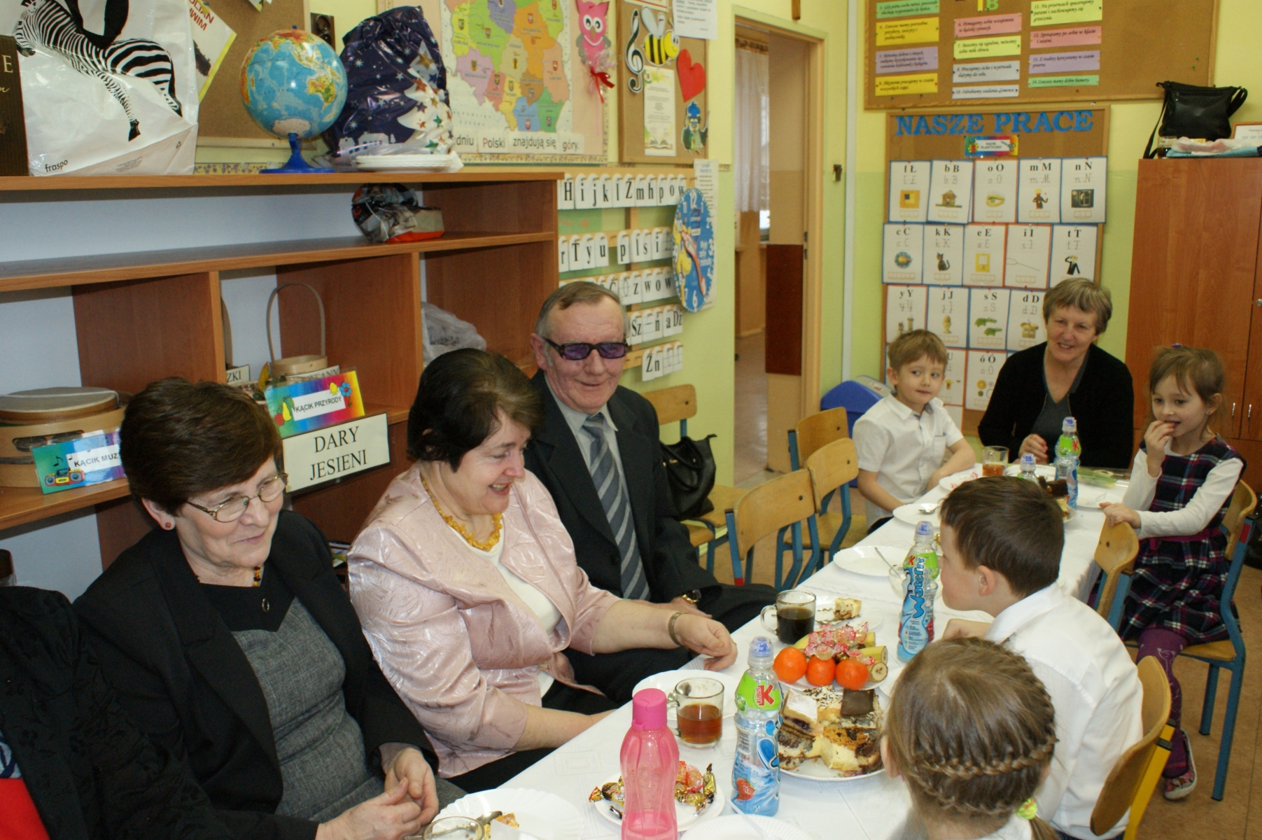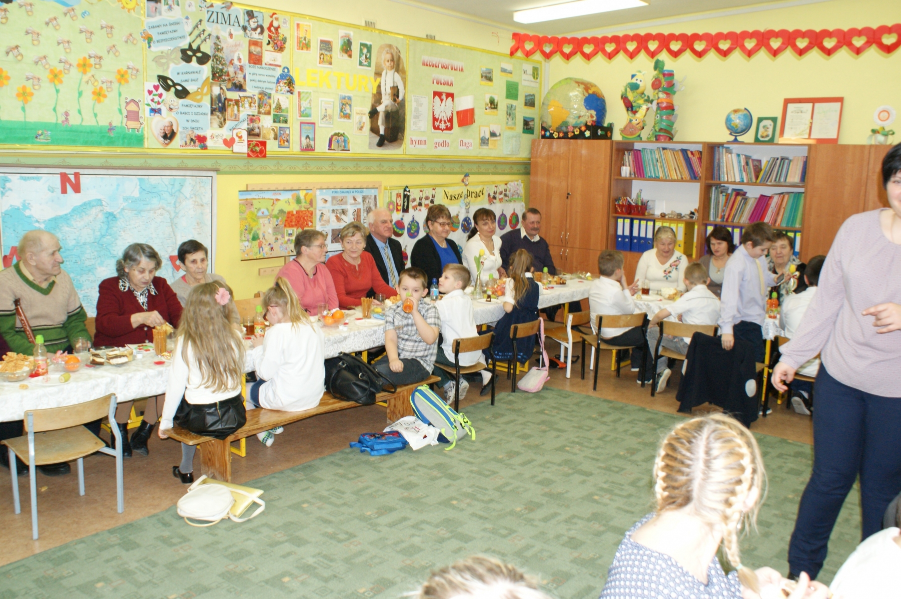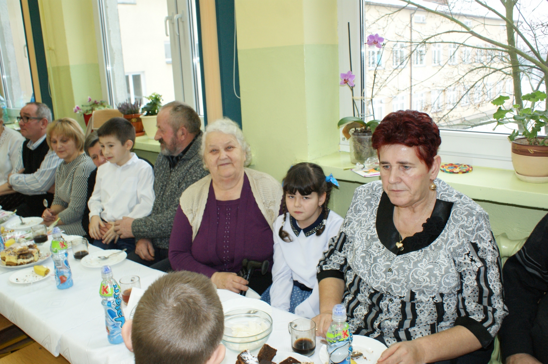 Po uroczystości na sali gimnastycznej goście zostali zaproszeni przez swoje wnuczęta do klas na słodki poczęstunek. Tam też zostali obdarowani kwiatami i laurkami, nie zabrakło też wspólnej zabawy.